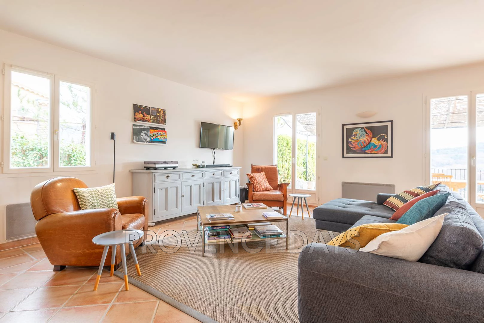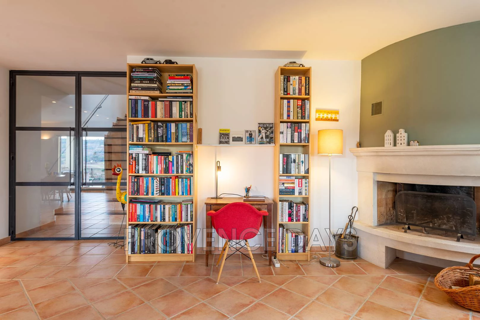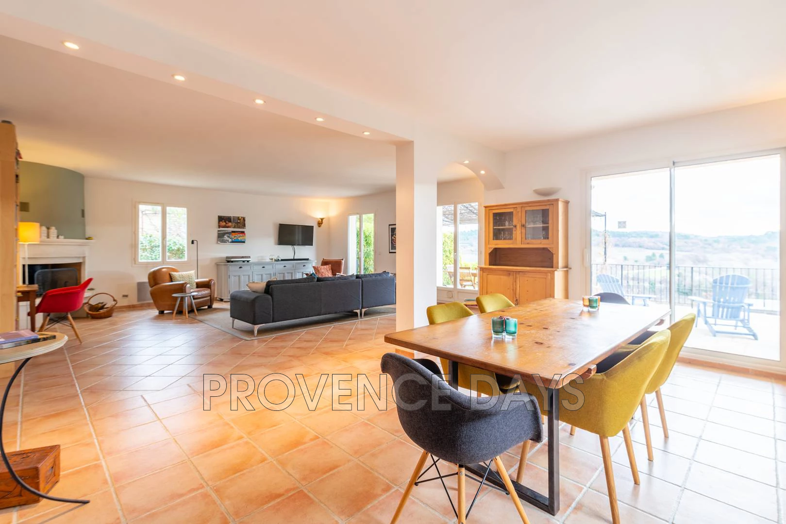 Open Plan Living The ground floor of Villa les Ocres features an inviting open-plan living space with large windows that frame the stunning scenic views. The sitting area boasts a large comfortable sofa and leather armchairs, TV and a cozy fireplace, perfect for relaxing evenings, while the dining area comfortably seats your entire group, all with incredible views out through the patio doors to the countryside beyond
