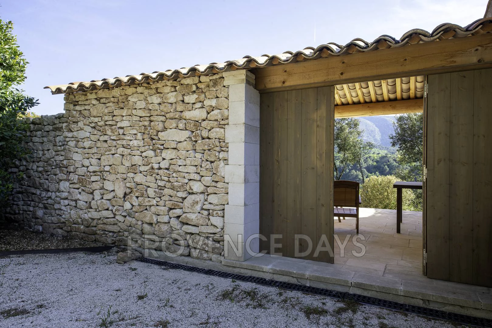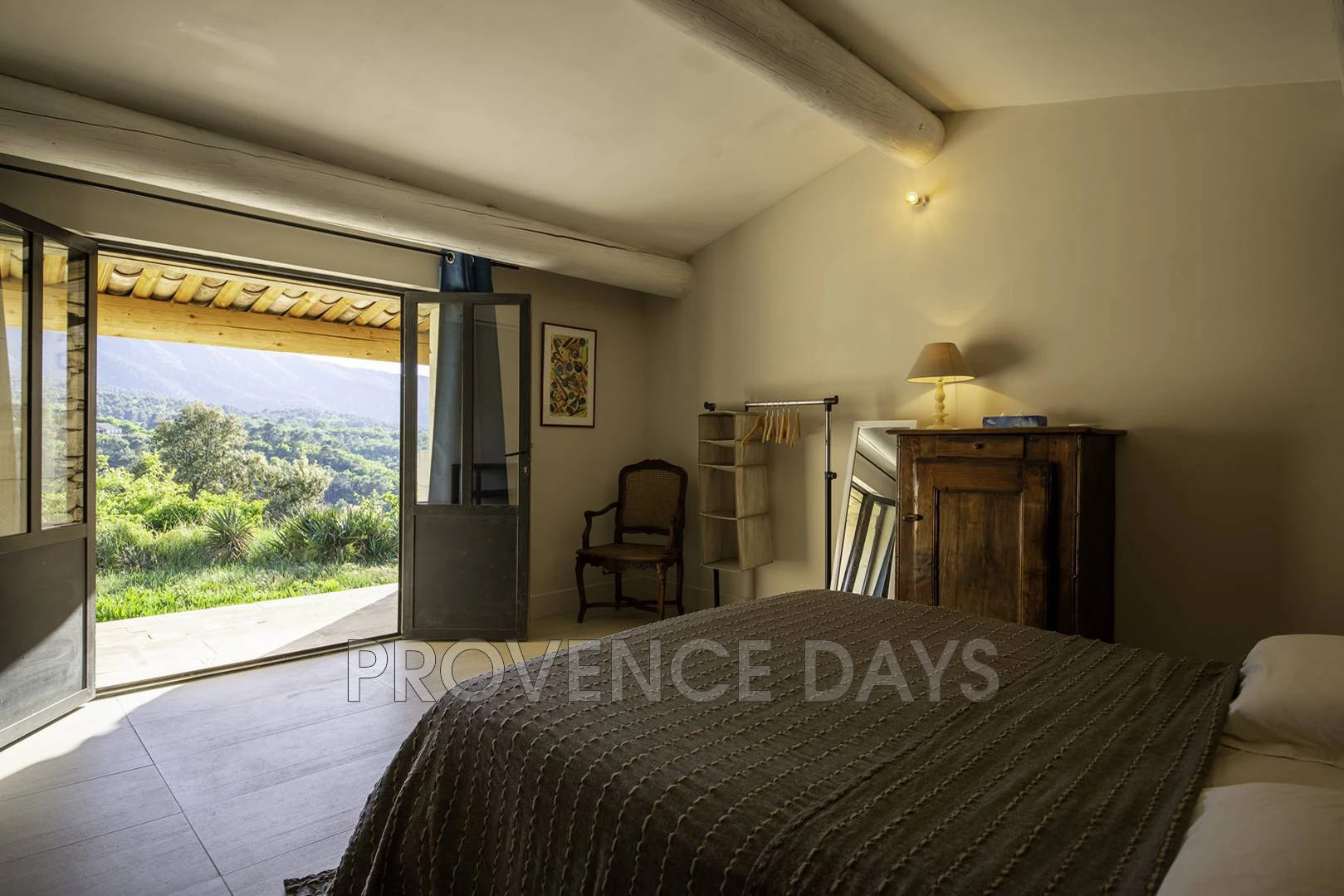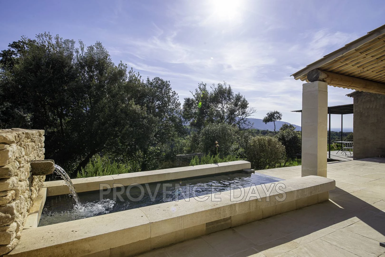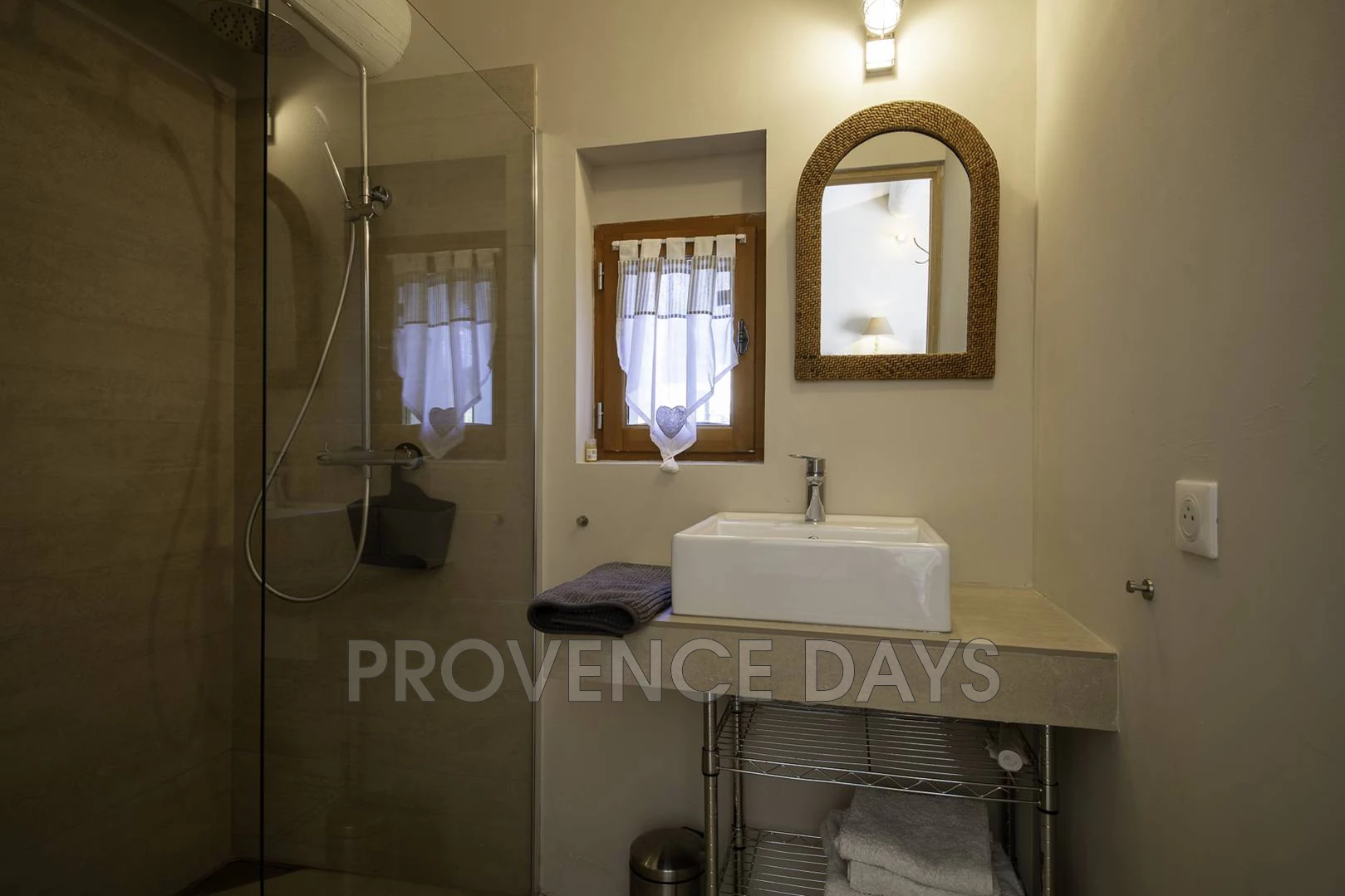 The setting is a plateau above the village of Menerbes, with pine trees and garrigue, totally peaceful but only a 3 minute walk into the village.