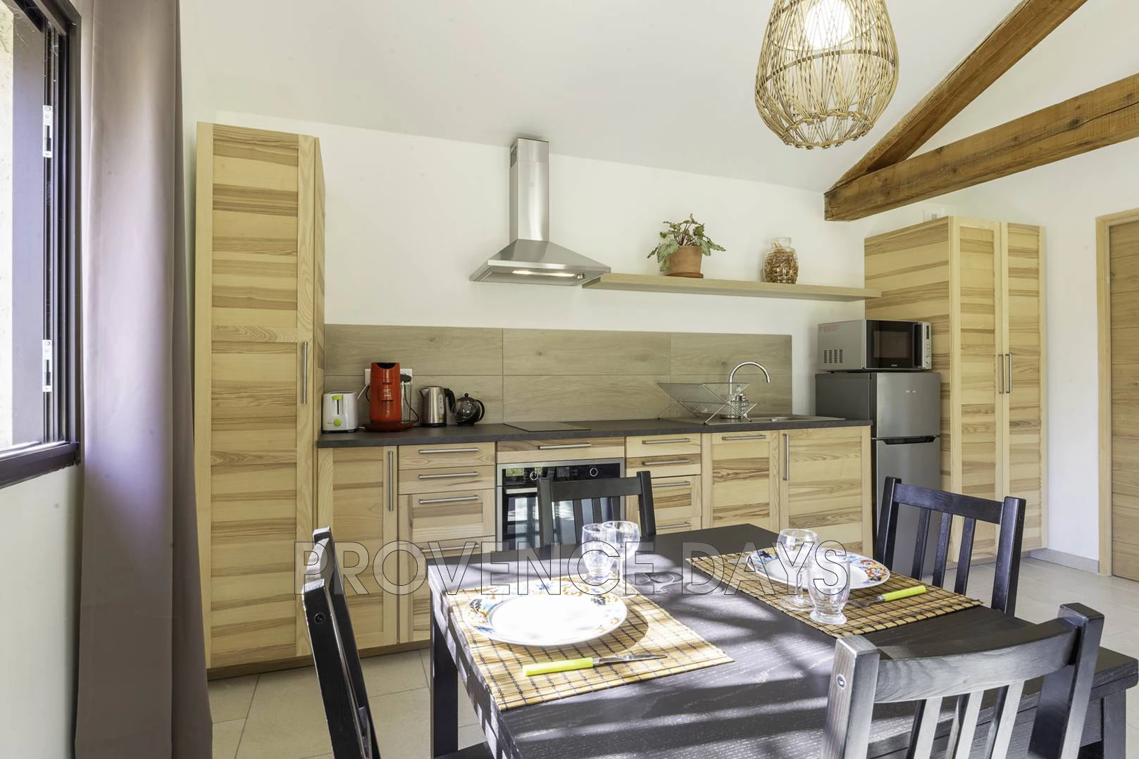 There is a shaded pergola to host lunches and dinners in summer, equipped with two deck chairs for a moment of relaxation with a view of the Luberon. An outdoor kitchen is also at your disposal under a large shaded awning, equipped with a barbecue.