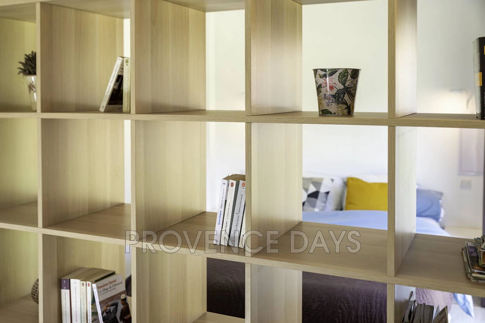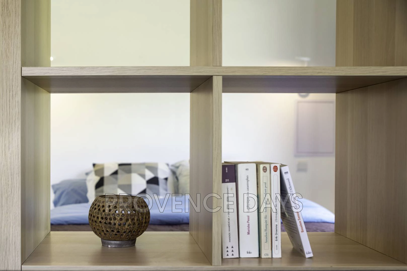 The sleeping area is separated from the rest of the house by a beautiful bookcase and includes a double bed (160cm), two bedside tables, and wall lamps.