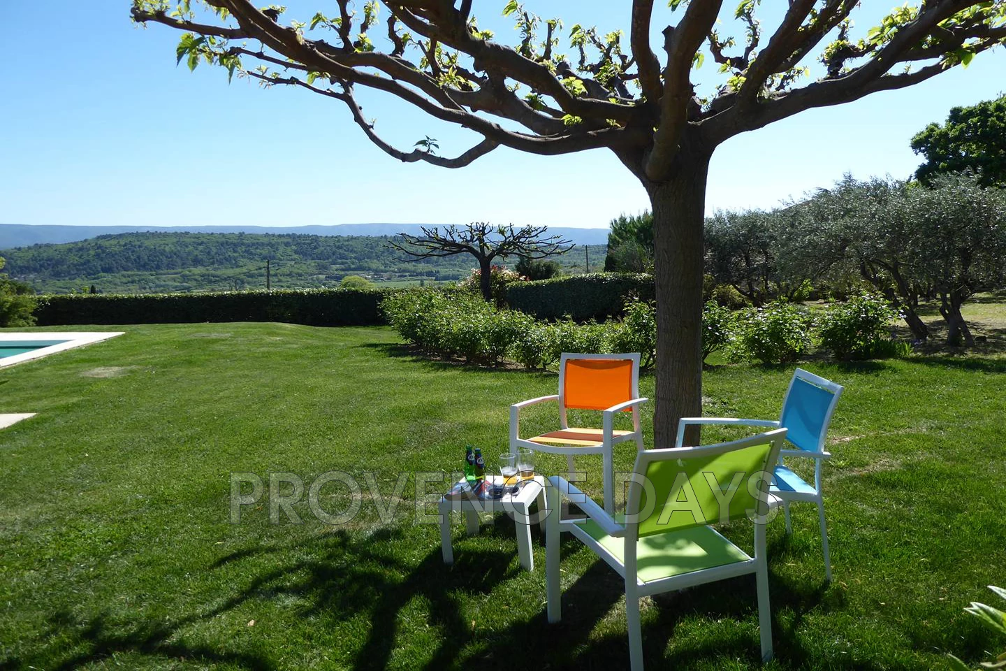 The house is in a wonderful position high up and facing south over a wide tapestry of Provence countryside to the Luberon mountain. The view is best appreciated from the raised terrace outside the living room and kitchen, where dining table and relaxation area are set. From here you also have a lovely view of the village of Gordes on its promontory to the west. Below this terrace are the garden with lawn and olive trees, and the pool area, also with view. The garden is 2500 square metres, or 27,000 square ft.