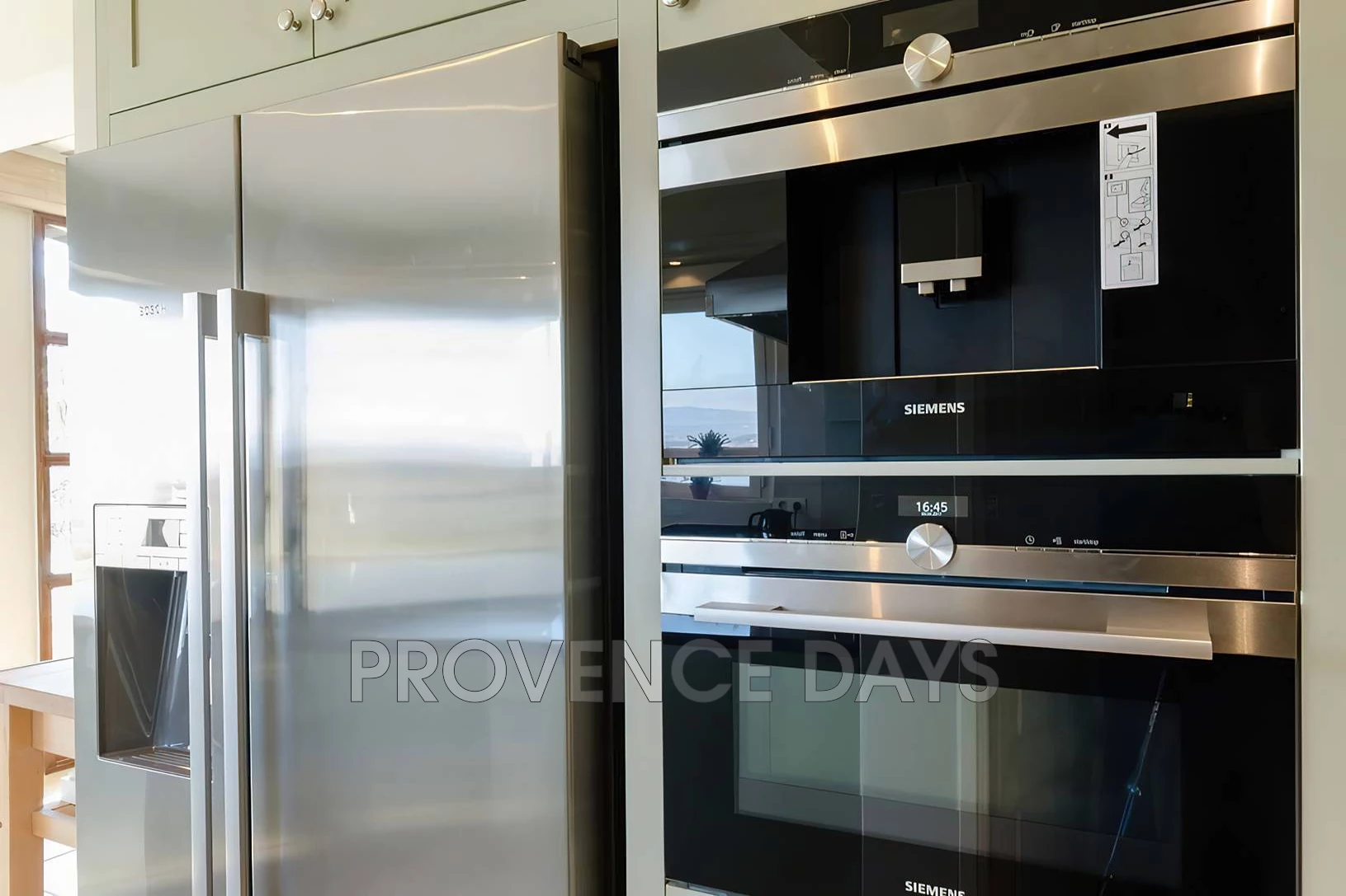 • Kitchen: The kitchen is equipped with 5-ring gas stove, 2 ovens, dishwasher, American fridge-freezer with ice and water, wall-mounted coffee machine and microwave. There is a big work island in the middle for food preparation. From the kitchen you step out to the big, shaded dining table on the terrace.