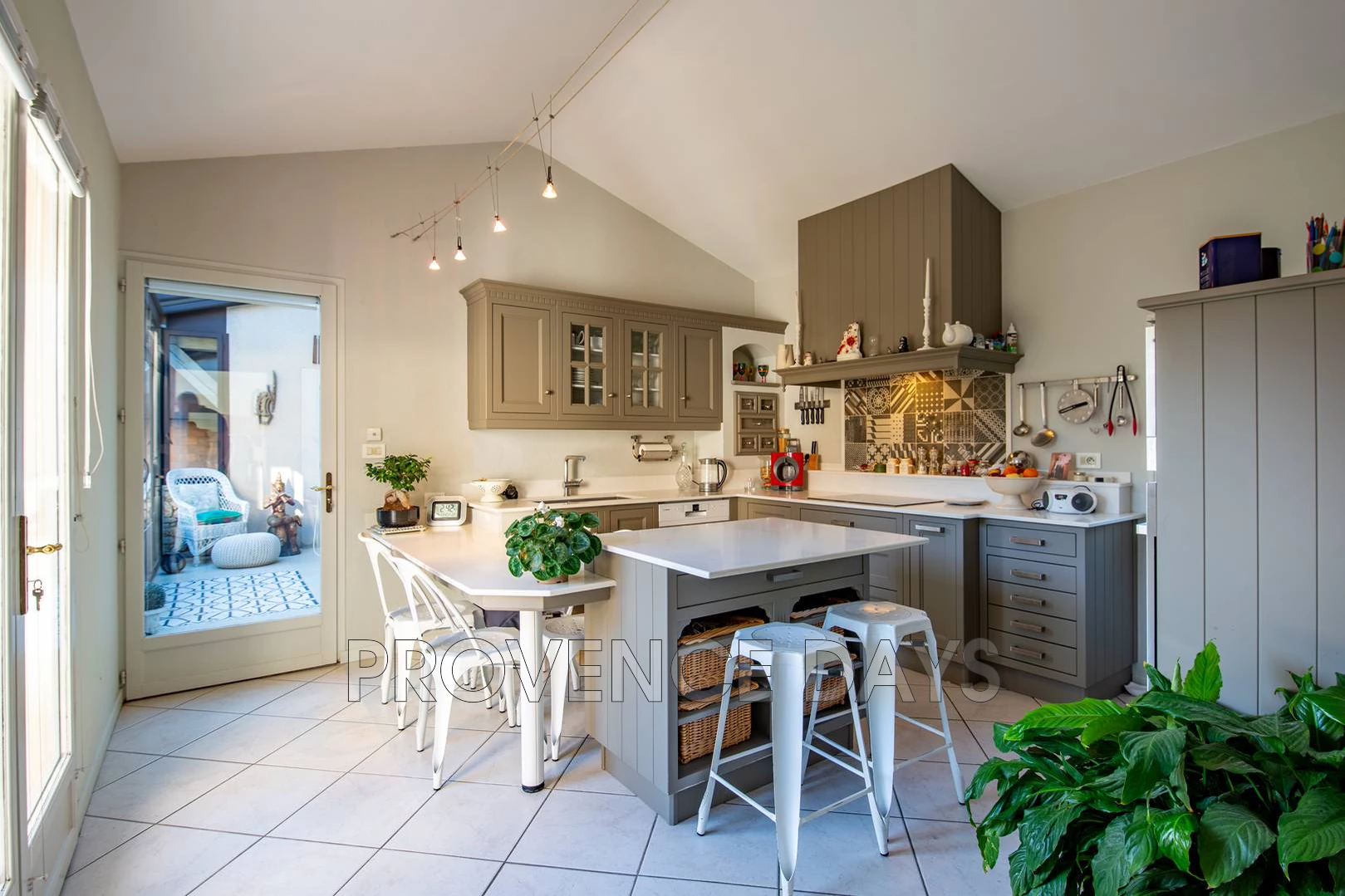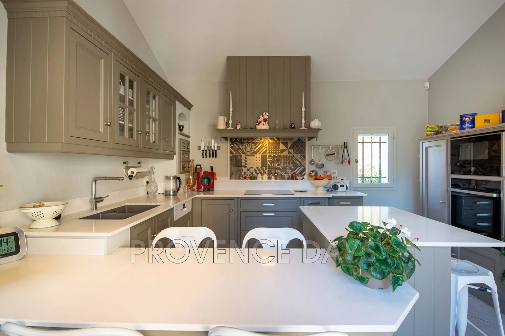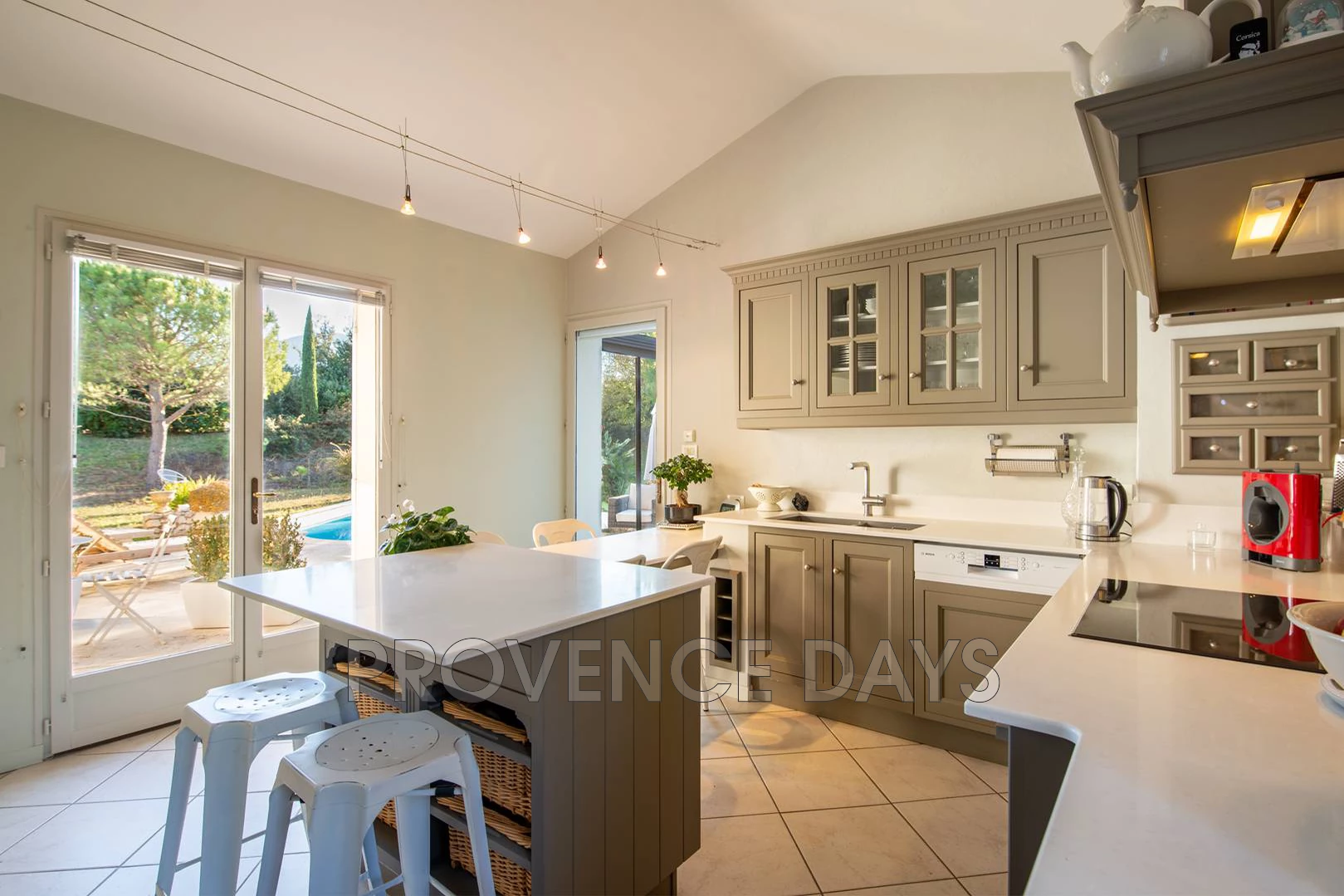 Through a doorway from the dining area is the well equipped kitchen with all you need to cater for Provencal styled dinners and alfresco lunches on the terrace accessed from the kitchen. The kitchen has a breakfast bar and integrated table. You will find an electric oven, microwave and induction hob for cooking. A dishwasher and for coffee a choice of Nespresso, Dolce Gusto or classic filter machine.