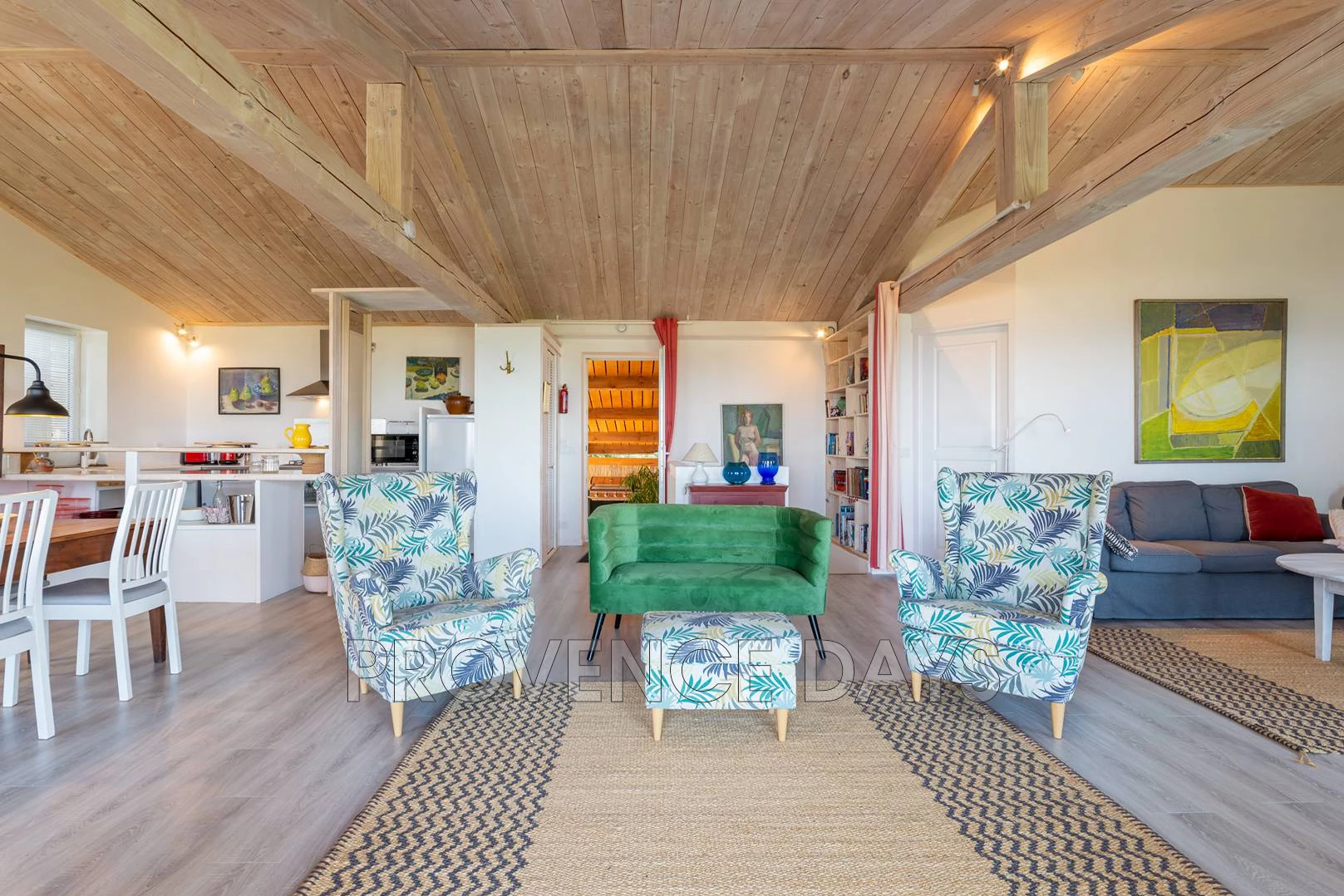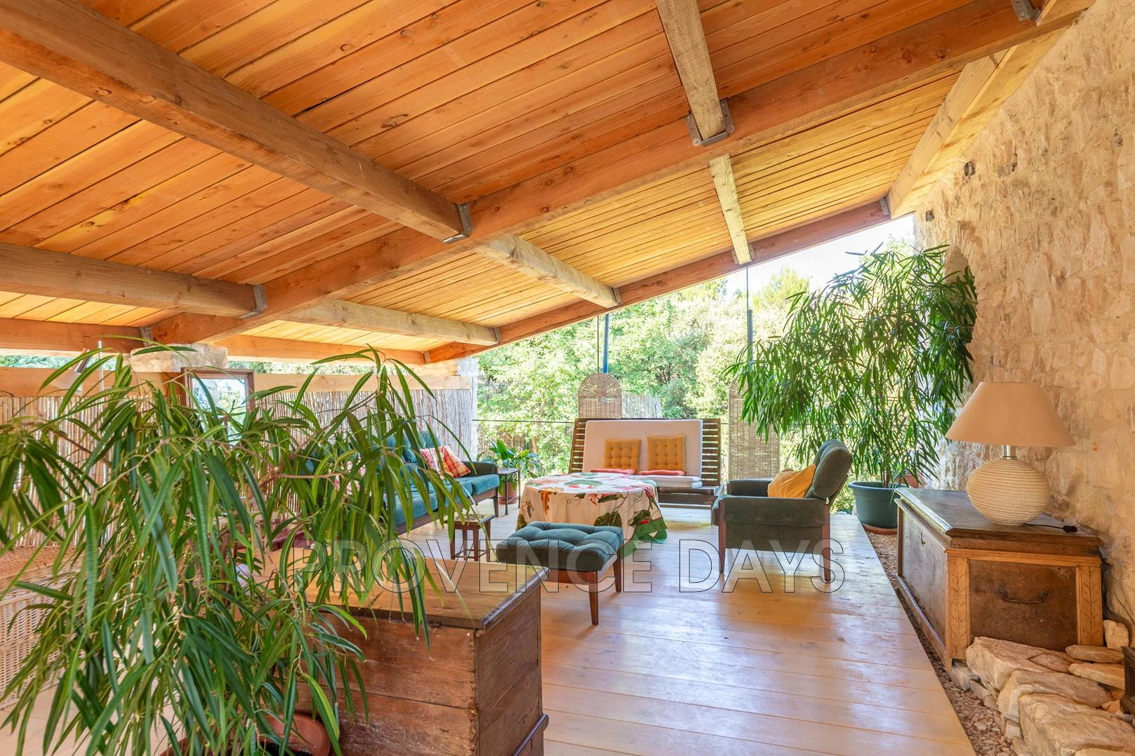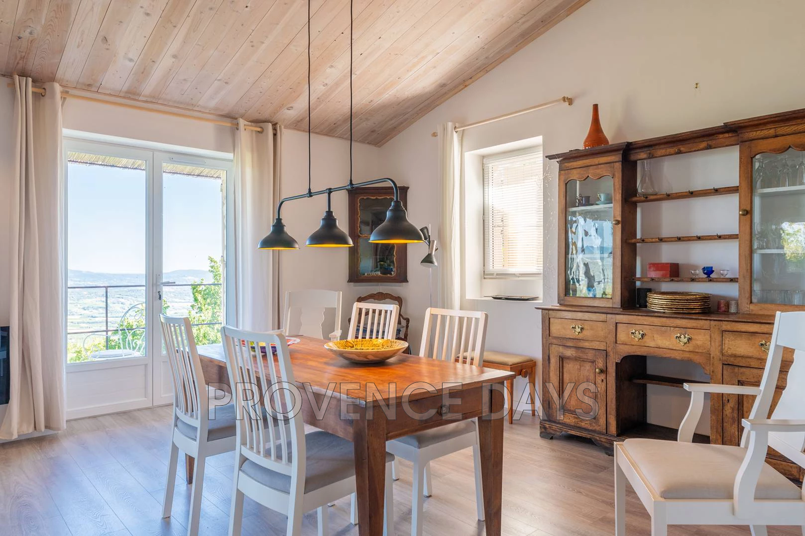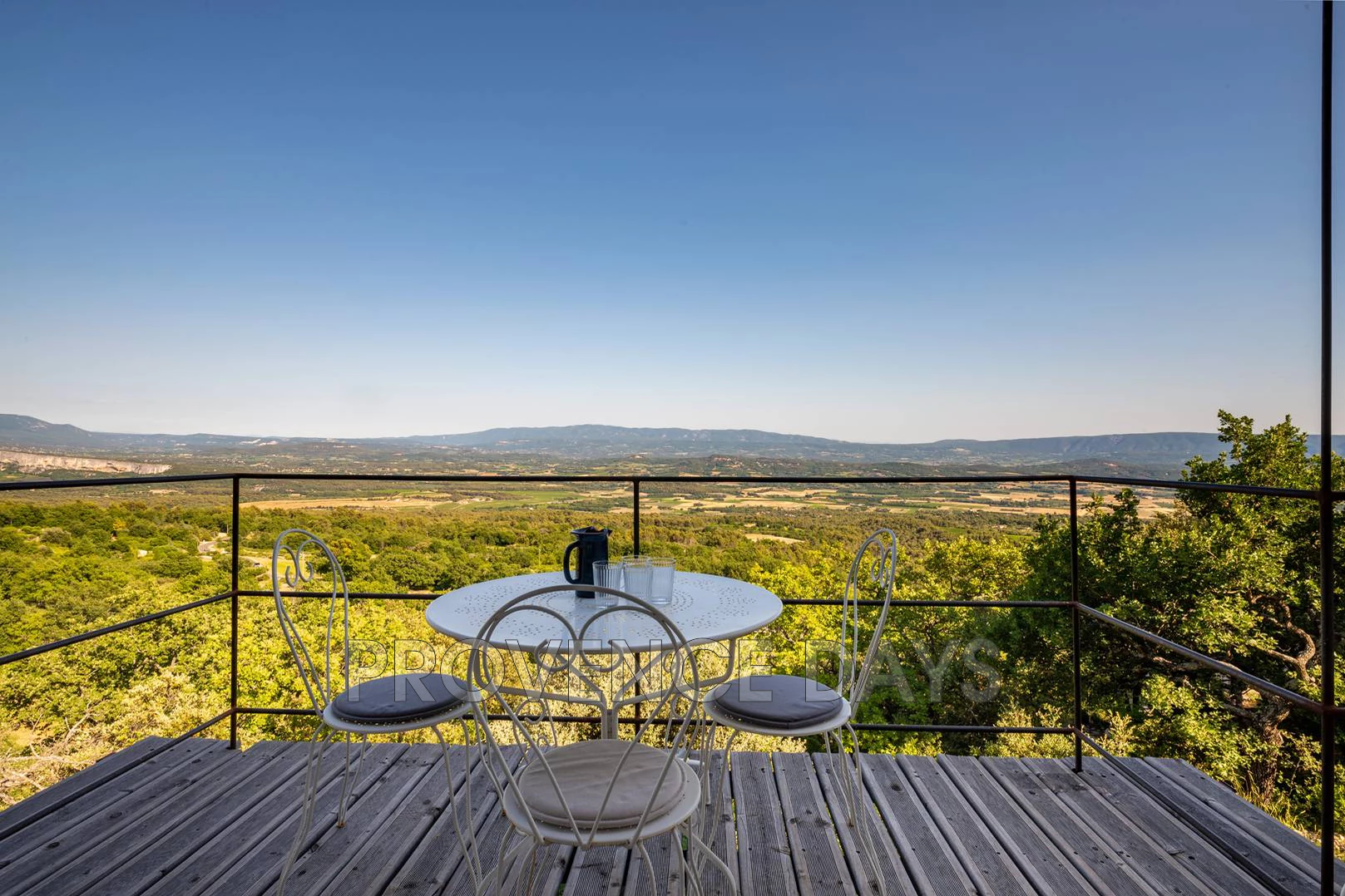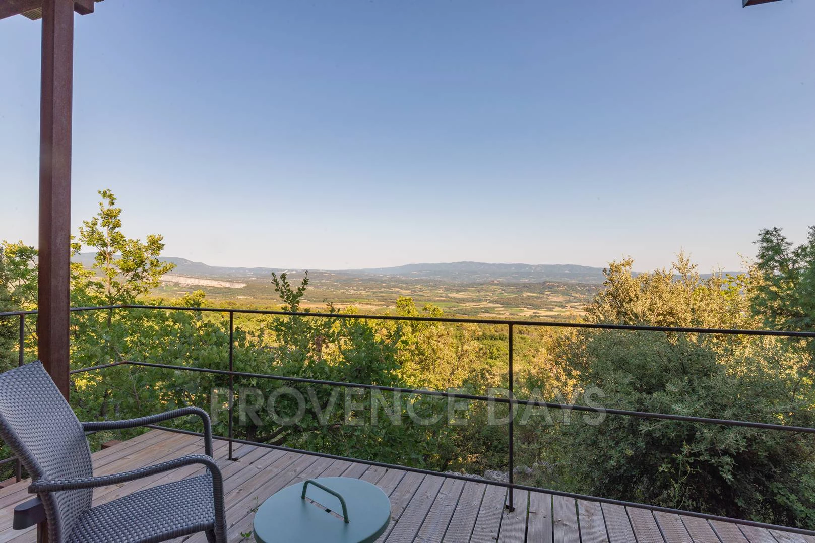 Stepping out onto the balcony that runs the length of house you are captivated by the unbroken landscape below you. On the balcony there is seating and a round table for eating outside.