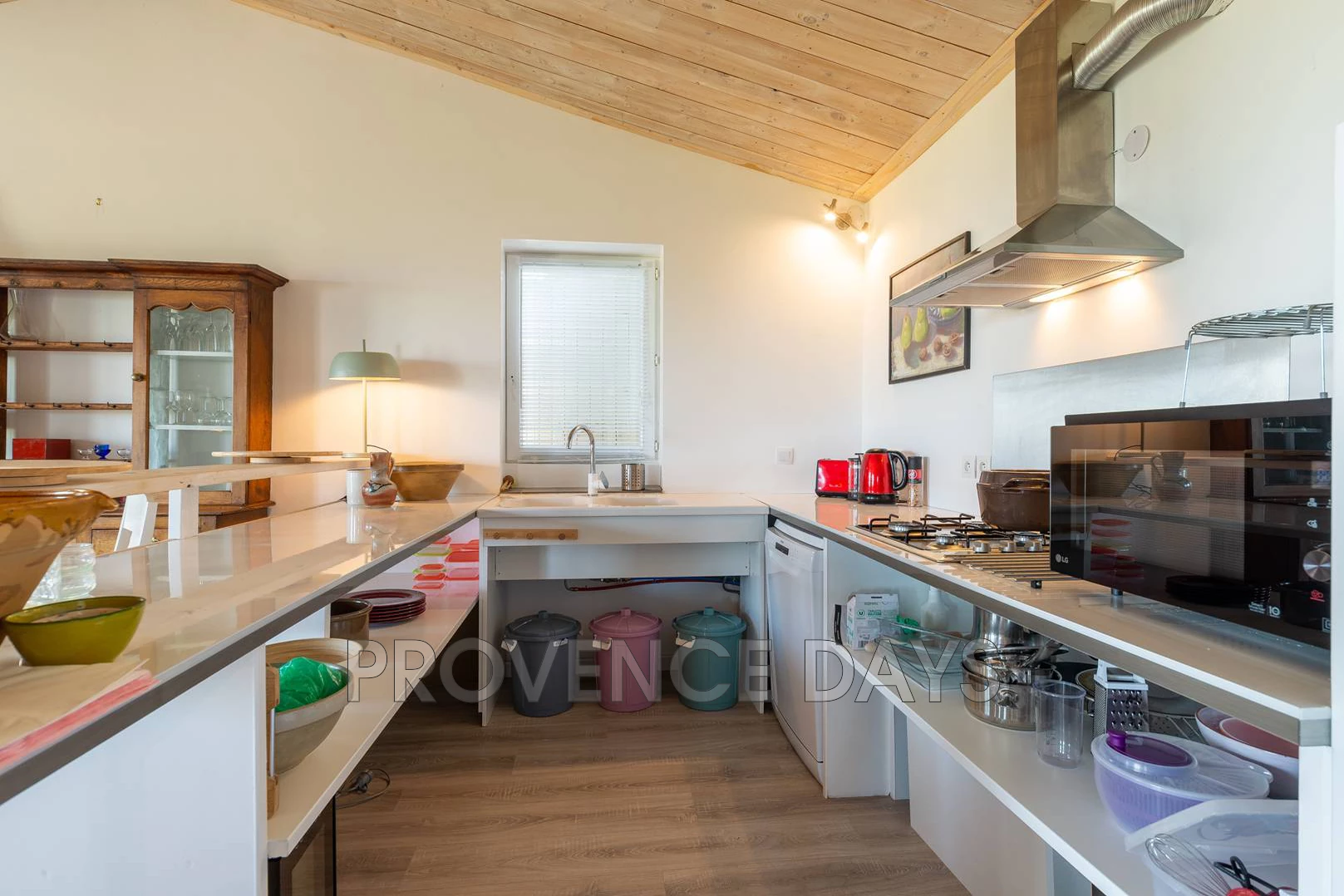 The wrap around full kitchen has everything you need for your stay and is designed to make serving easy to the dining area placed in front of it.