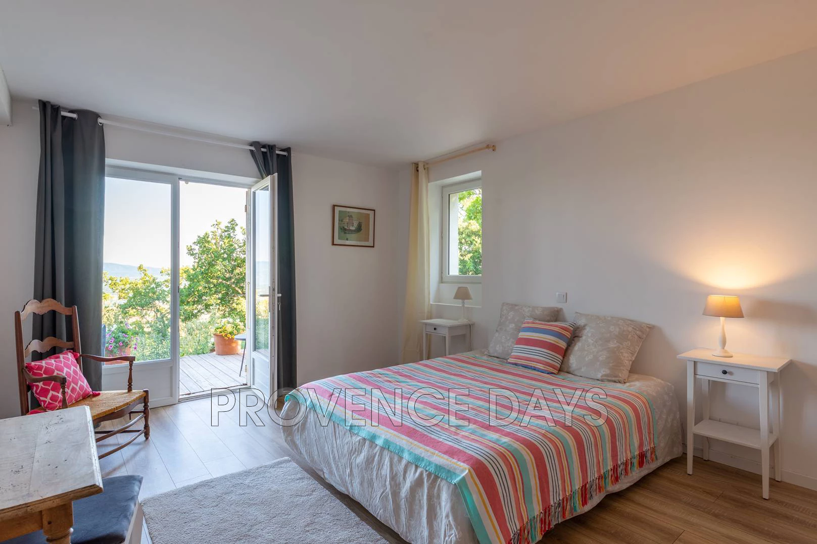 Bedroom 2: 160cm double bed or 2 x 80cm singles. Views to the right of the house and to the front with terrace and seating area. Desk and chair.