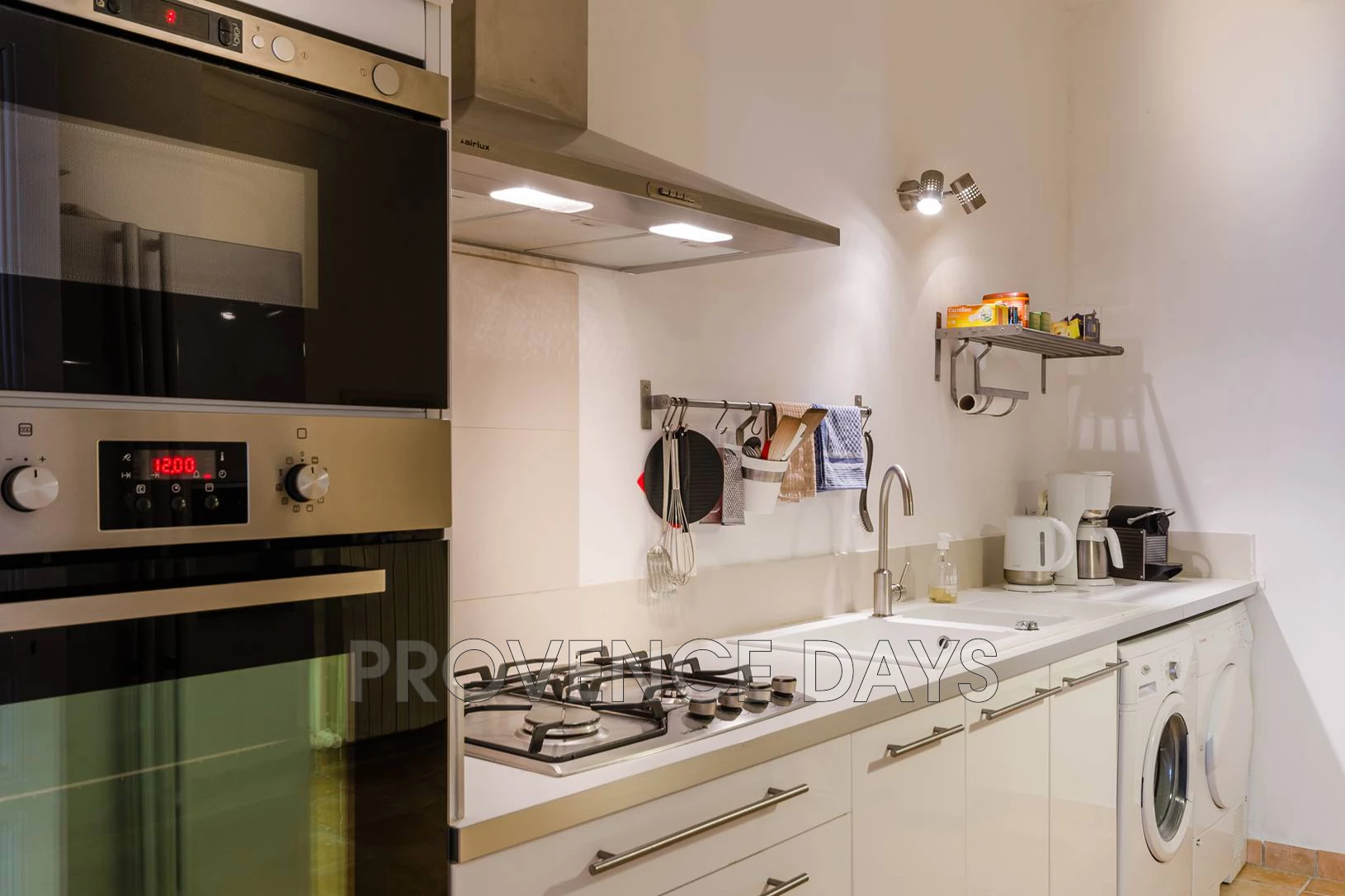 • Kitchen: The kitchen is equipped with wall-mounted oven, 4-ring gas stove, microwave, American fridge-freezer with ice dispenser, Nespresso and filter coffee machine, washing machine and tumble dryer.