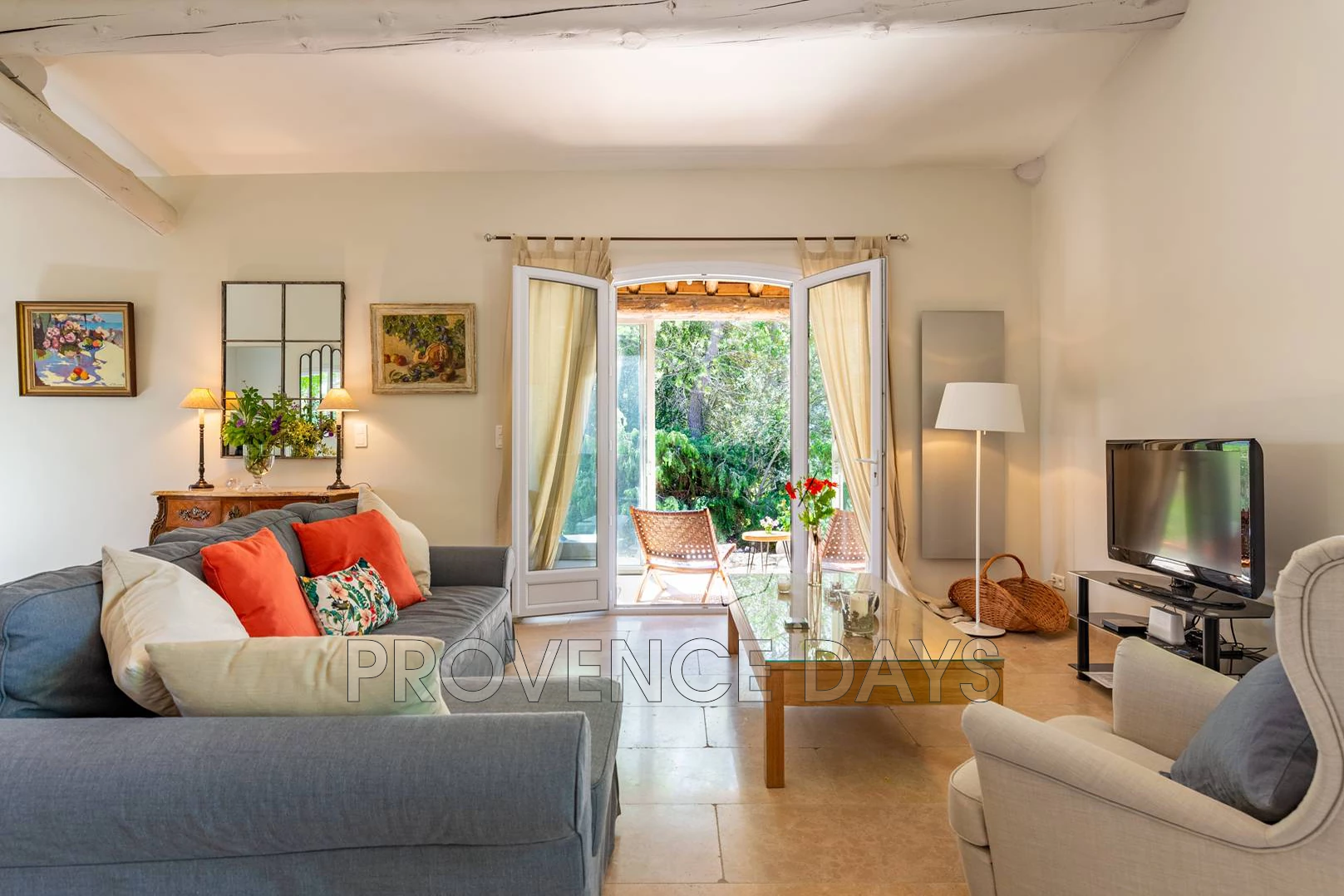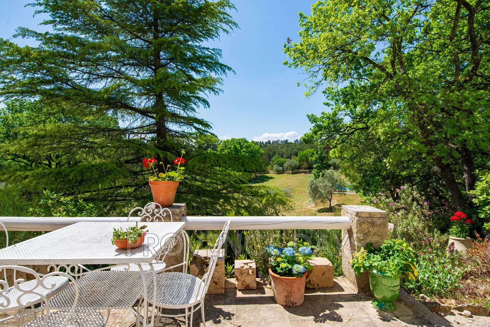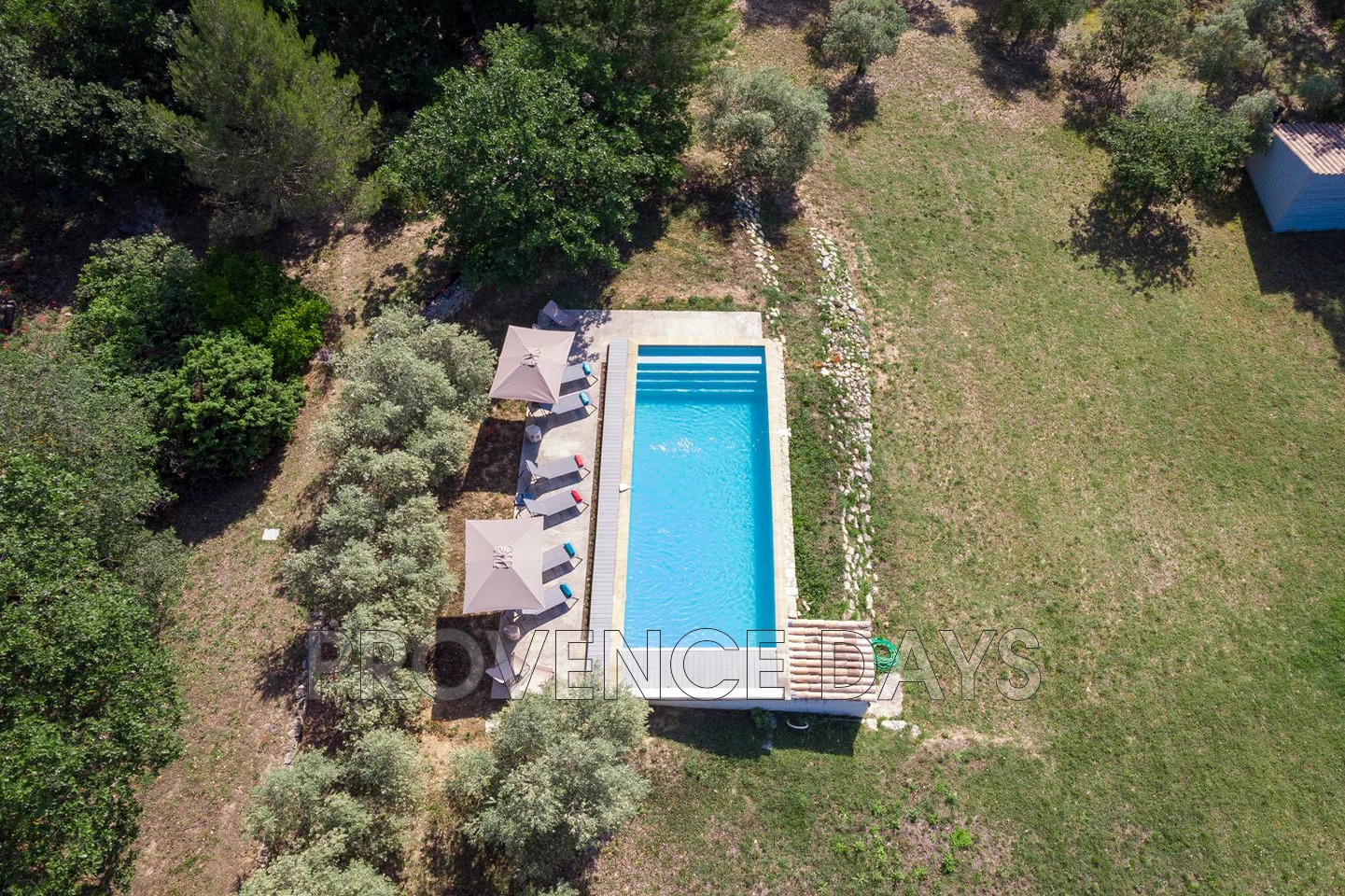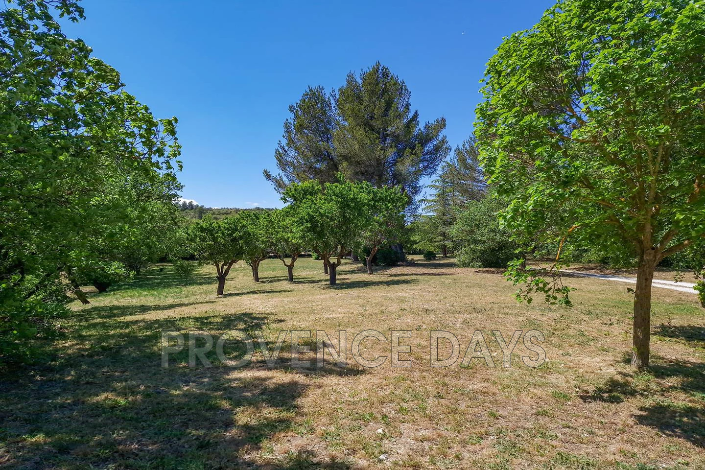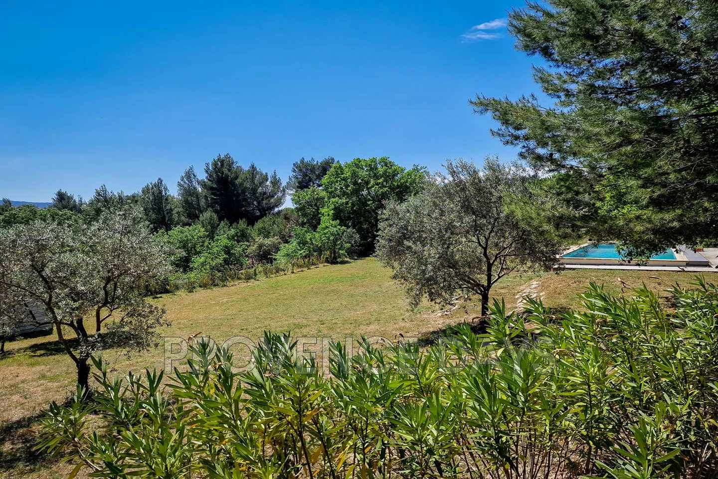 From the parking area you can descend a gentle ramp to the pool level or continue to the house and from the upper terrace look over the large grounds laid out below. You can take the delightful flower lined stone path down to the pool level here passing down shady path, passing a dining area to the olive lined path that opens out onto the pool terrace and the magnificent, breath-taking view to the Luberon valley.