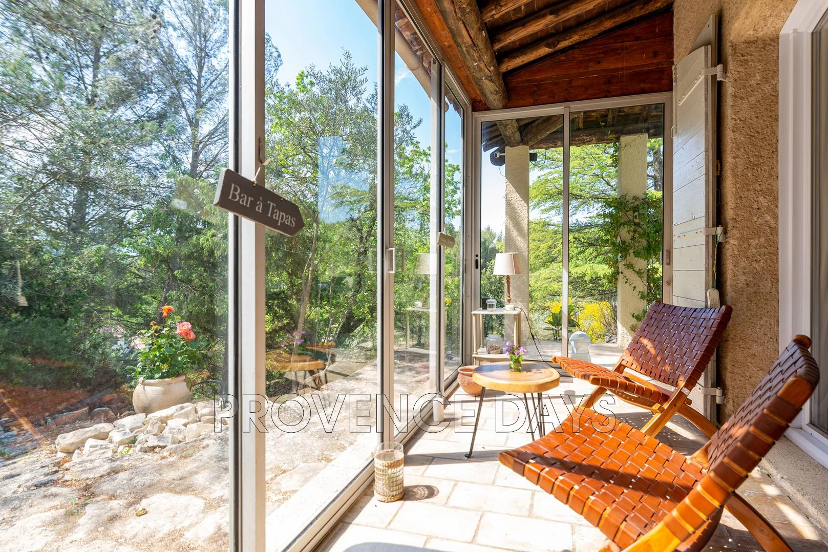 The living area has a sofa for 3 and 1 chairs, here you will find a TV and through the glass doors you come to a relaxing atrium with two lounging chairs looking out to the garden.