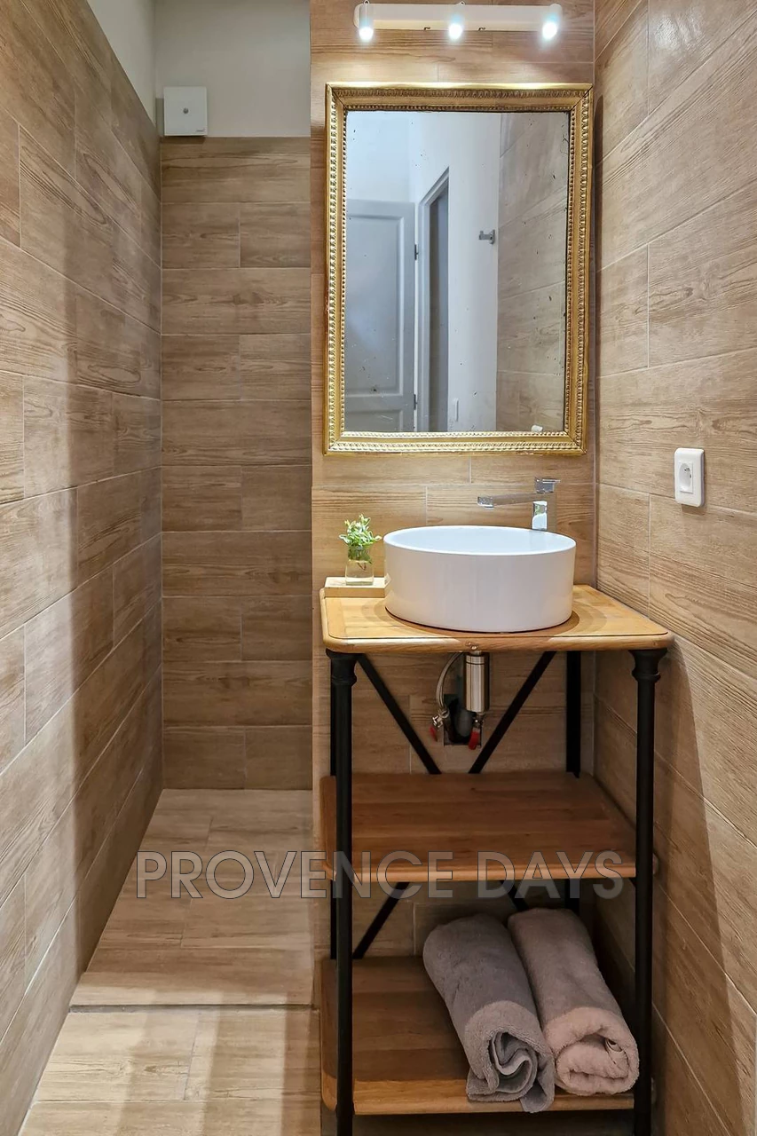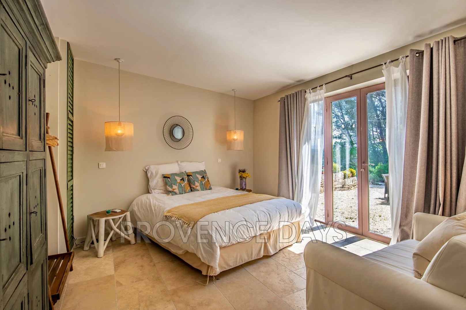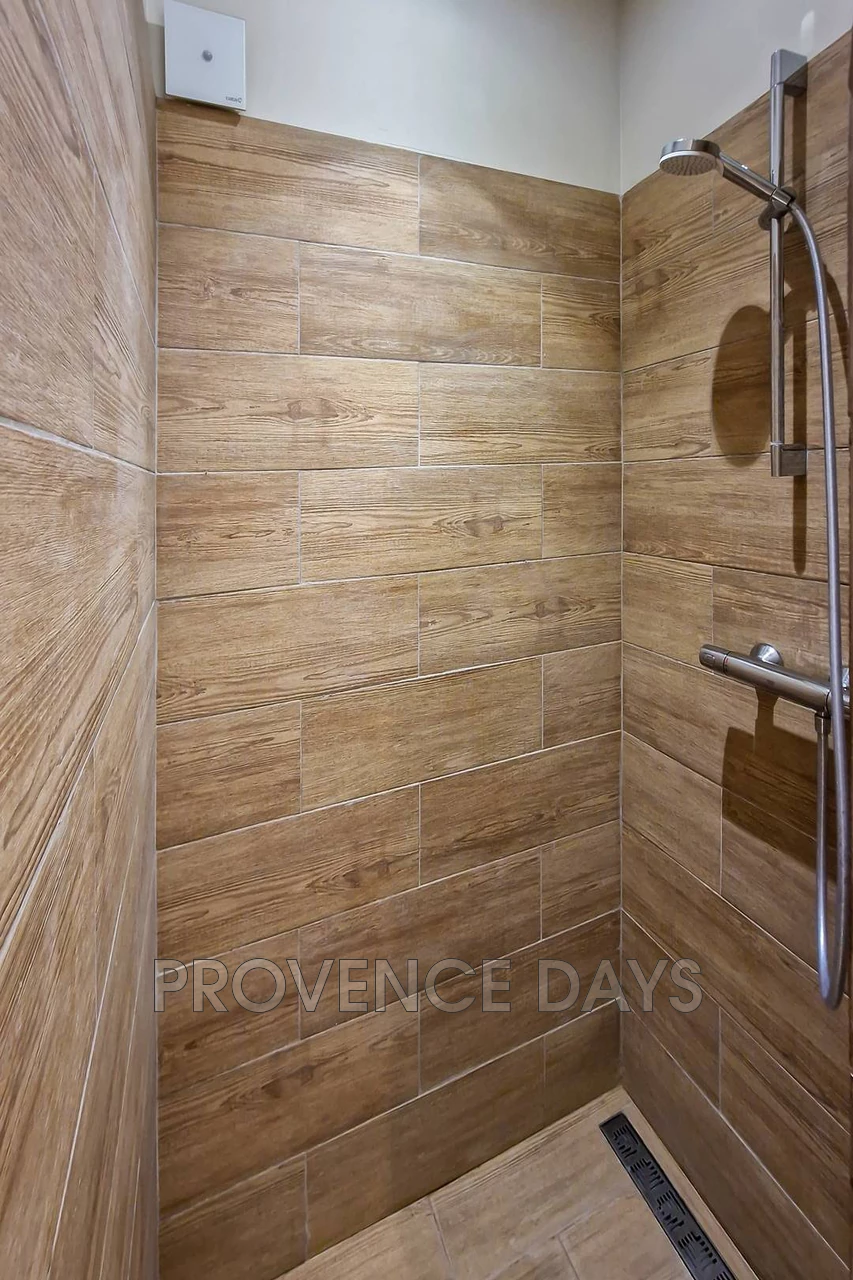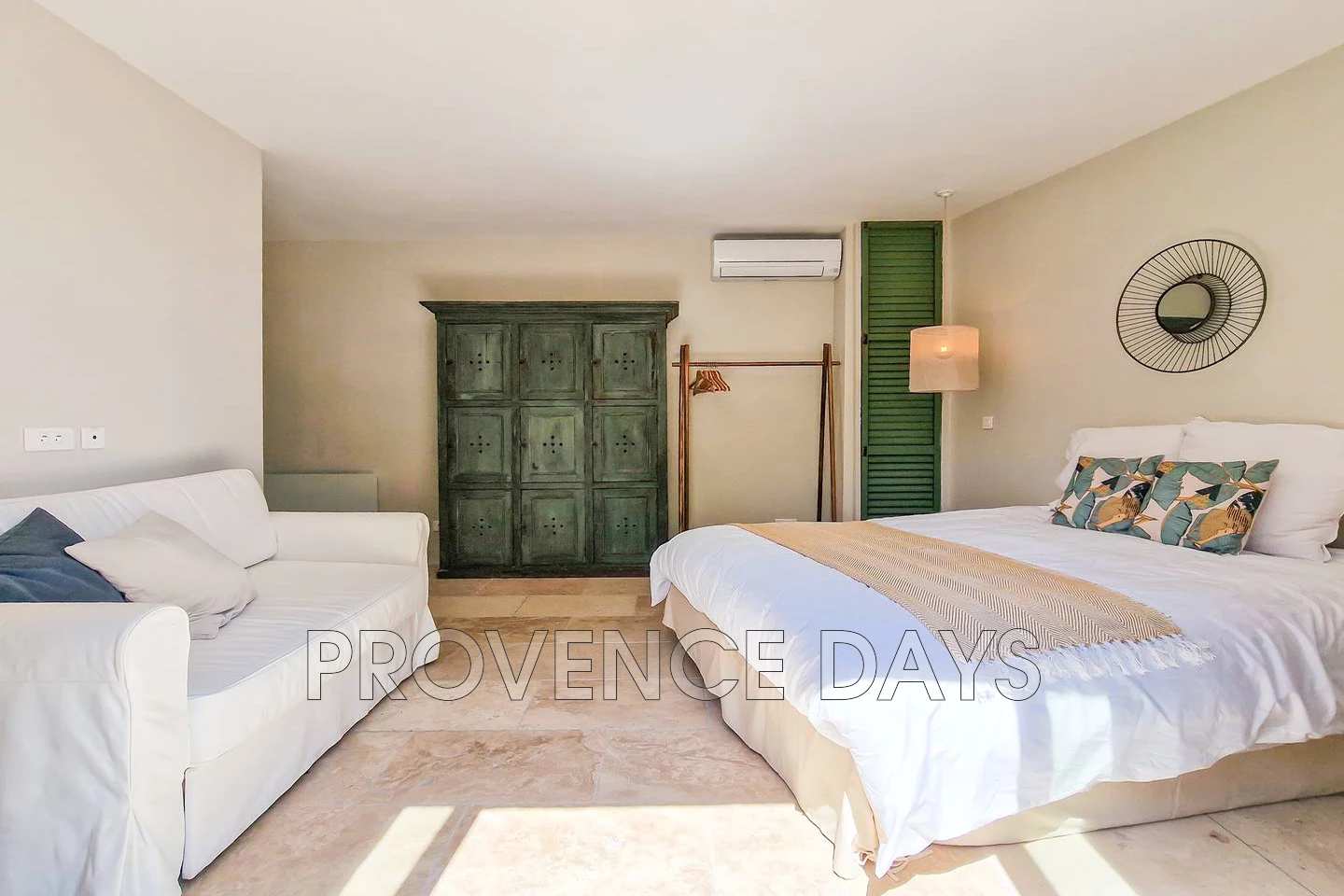 Tastefully decorated with a 160cm double bed and a sofa, and a large Provencale cupboard and hanging rail for storage. Airconditioned and with an ensuite shower room, it also has patio doors leading to the garden. |