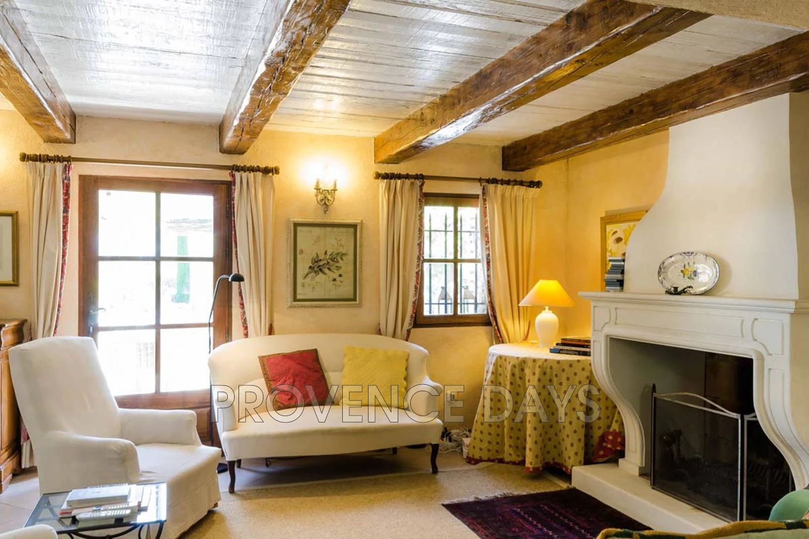 Living Room: With beamed ceiling, and sofas and armchairs around the fireplace, this room opens out to the terrace and pool. There is TV/DVD with Orange TV including CNN and BBC World as well as all the French channels. The house has WiFi internet.