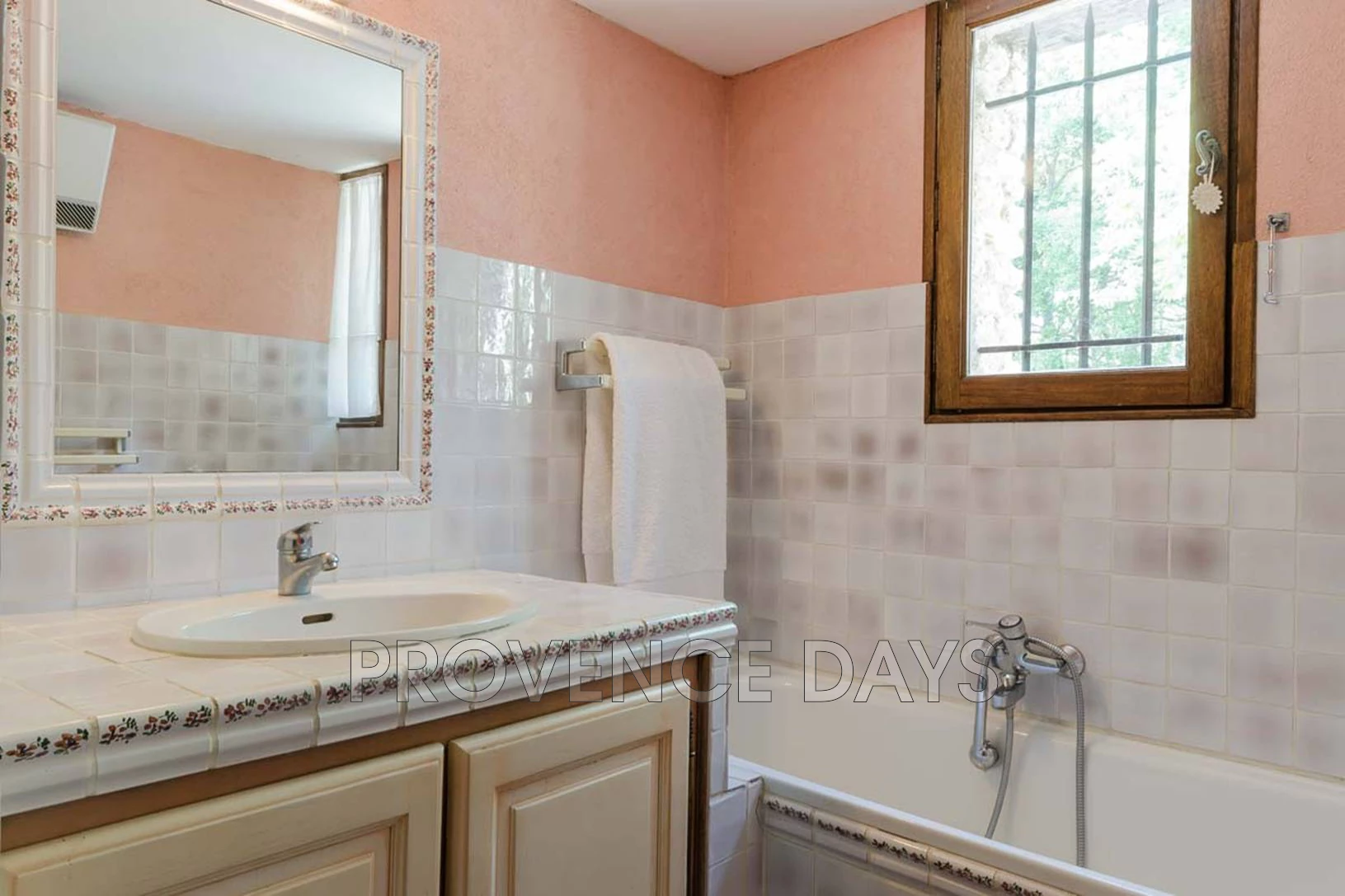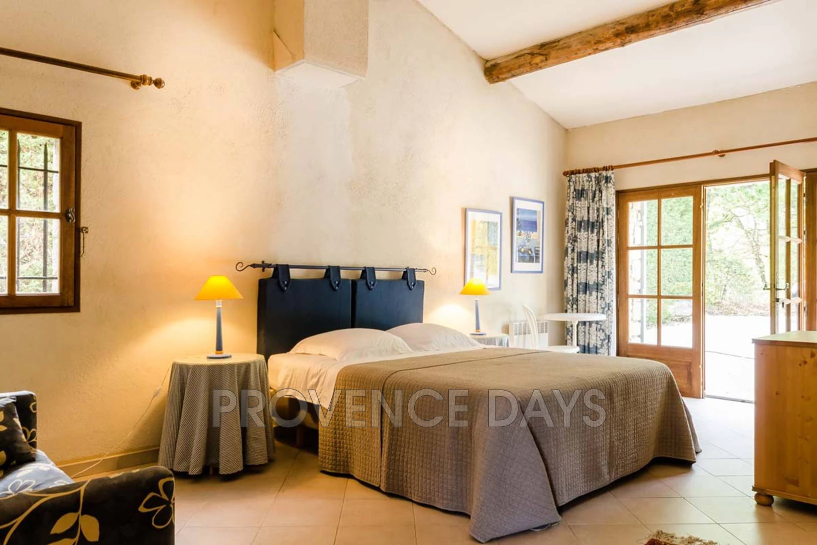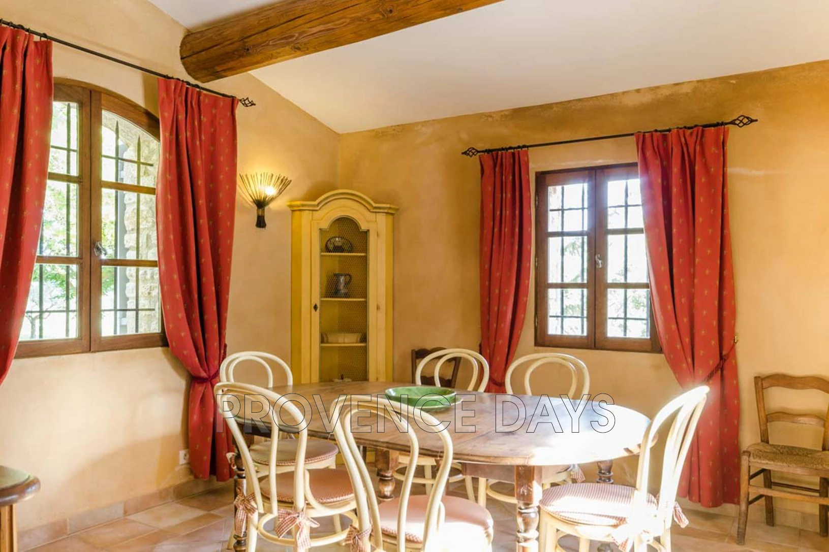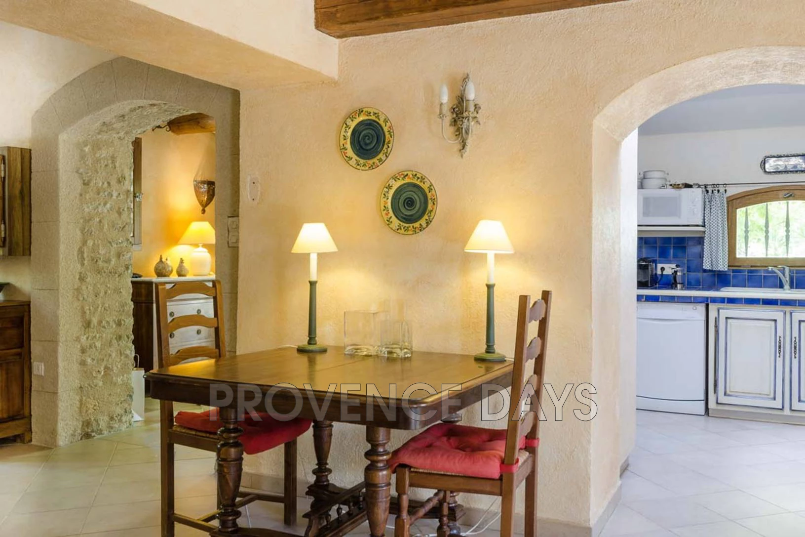 Inside it has a cosy feel with colourful Provencal decor and exposed beams. On the ground floor are living room, kitchen and dining room, as well as one bedroom with en suite bathroom.