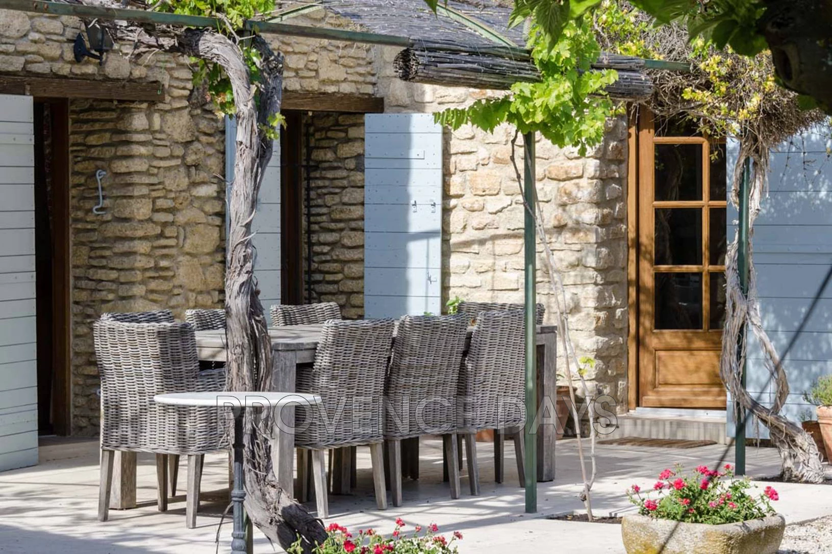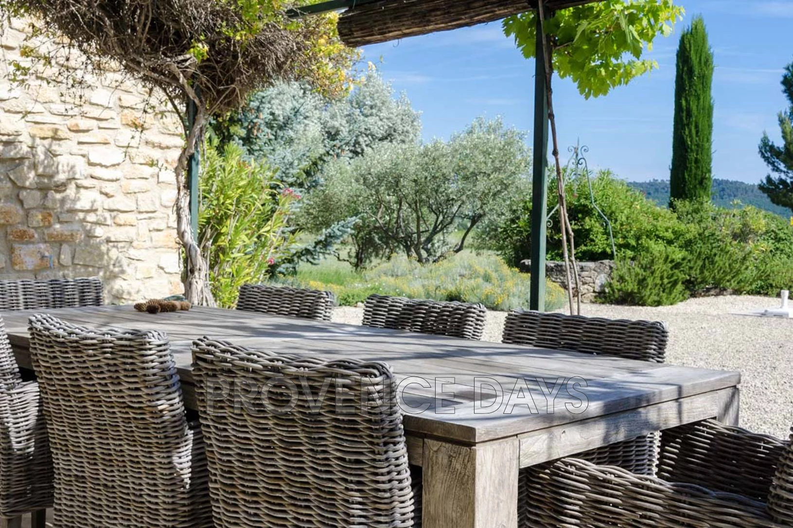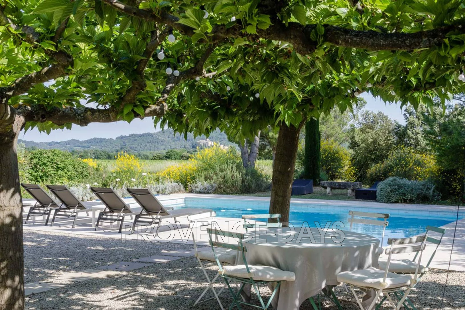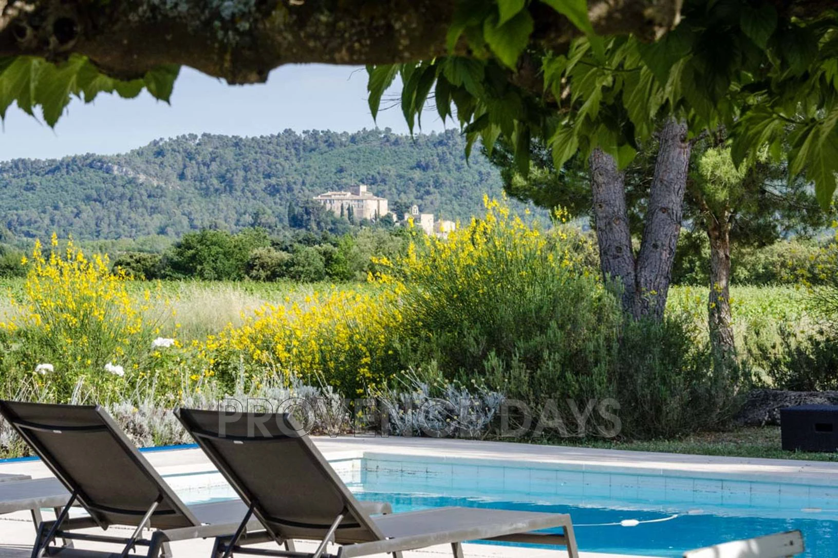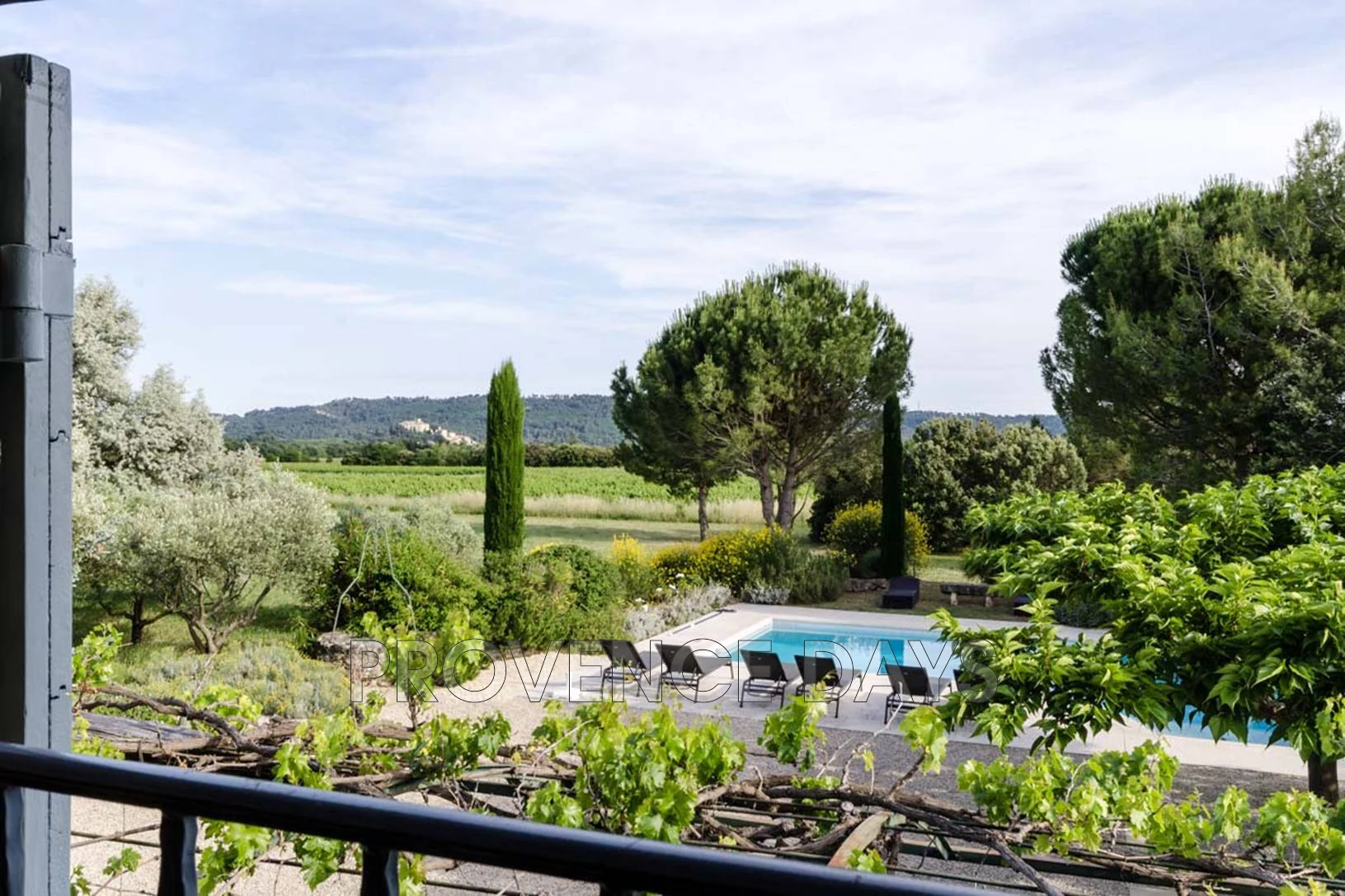 To the front of the house is the vine-shaded terrace with dining table, BBQ and sitting area, and then a gravelled area with mulberry trees and another dining table. The pool has sunloungers around it and in the garden are lavender, rosemary and cypress. Beyond are the vineyards and view to Ansouis.