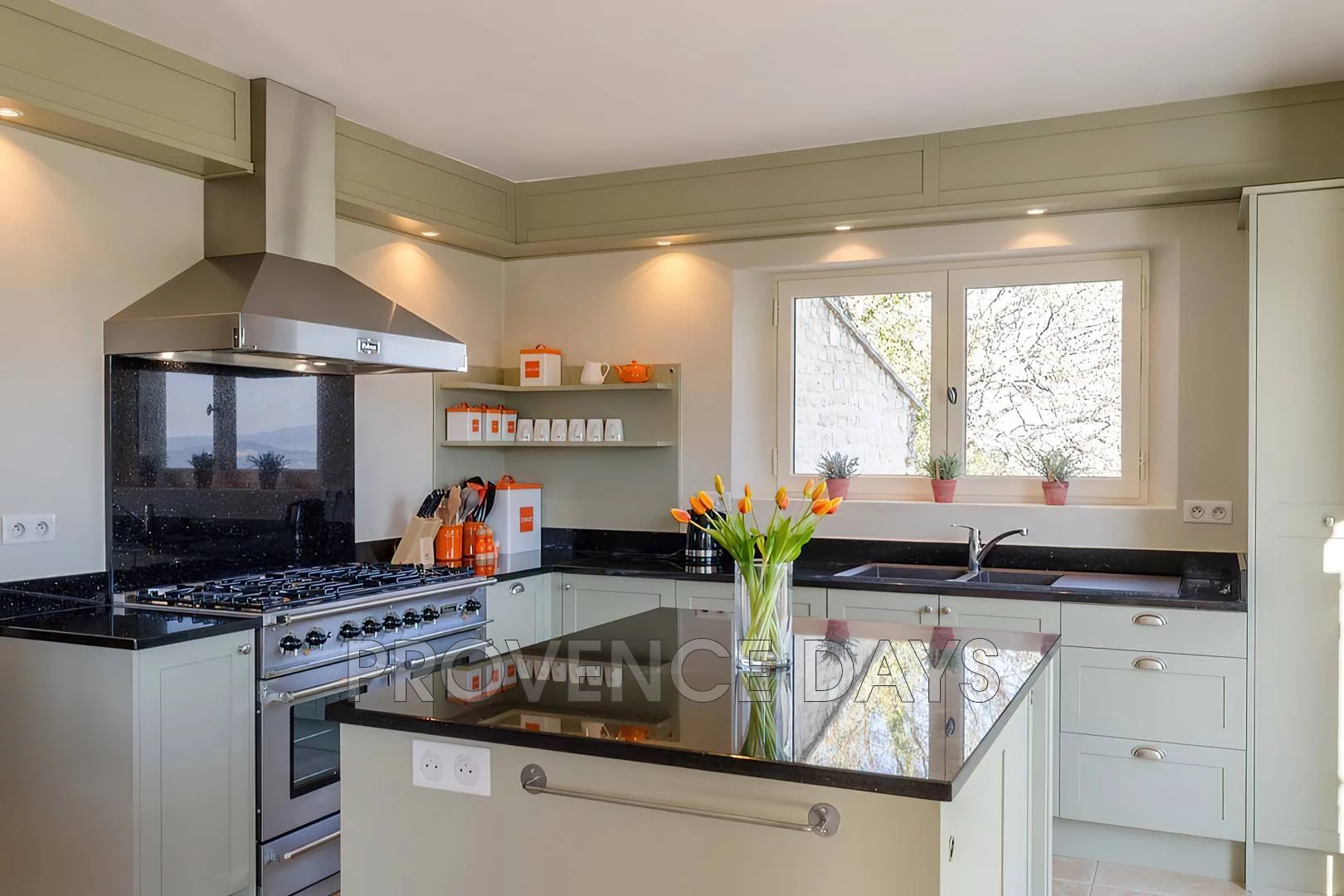 Kitchen: The kitchen is equipped with a 5-burner gas cooker, 2 ovens, a dishwasher, an American fridge-freezer with ice and water, a wall-mounted coffee maker and a microwave. There is a large work island in the middle for meal preparation. Access from the kitchen is to the outside dining table on the terrace.