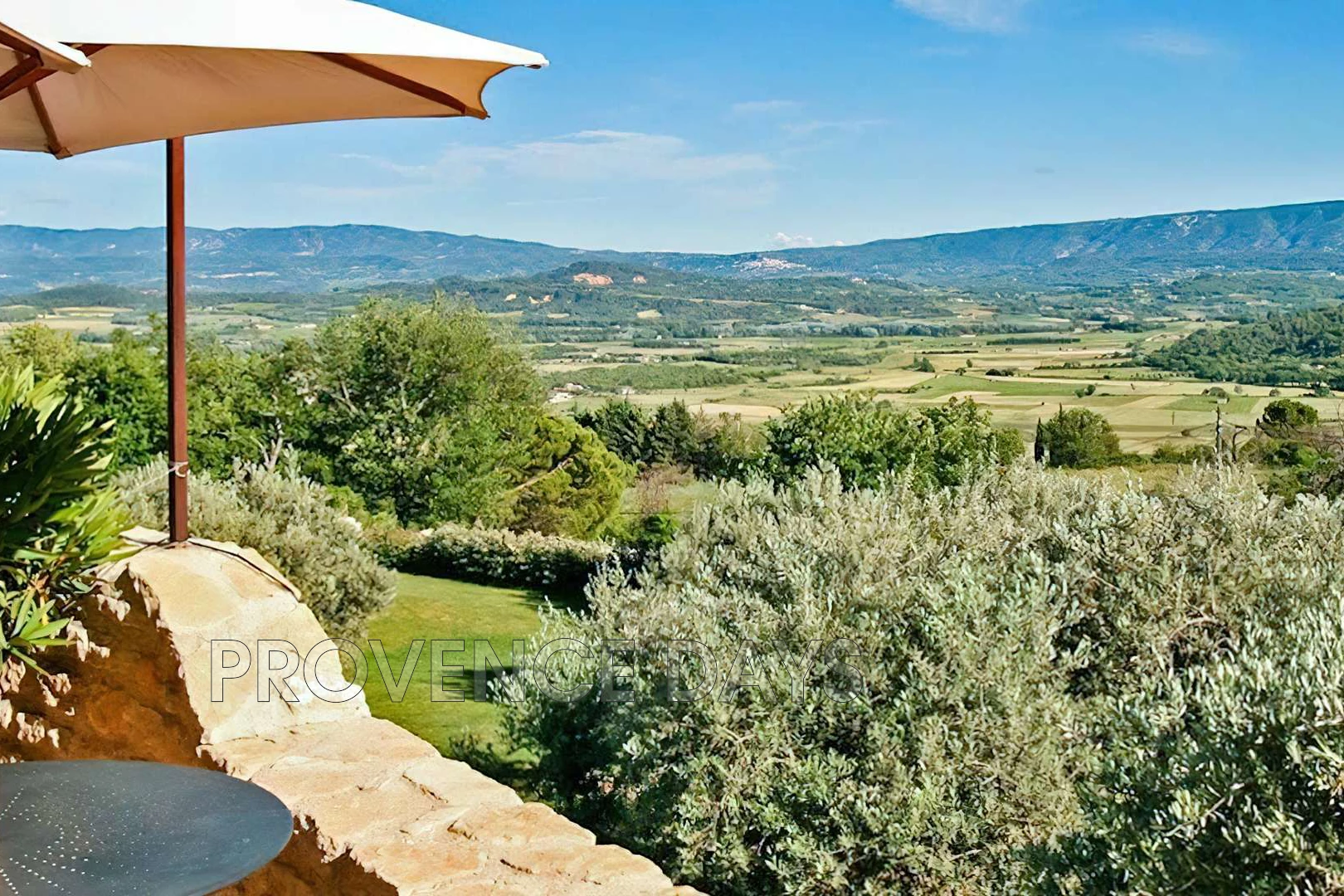 The house is in a great position high up and looking out over the countryside of Provence across to the Luberon mountain. The view is best enjoyed from the raised terrace along the front of the house, with the outdoor dining table and relaxation area. From here there is also a lovely view of the village of Gordes to the west. Below this terrace are the garden with lawn and olive trees, and the pool area, also with view. The garden is 2500 square metres, or 27,000 square ft.