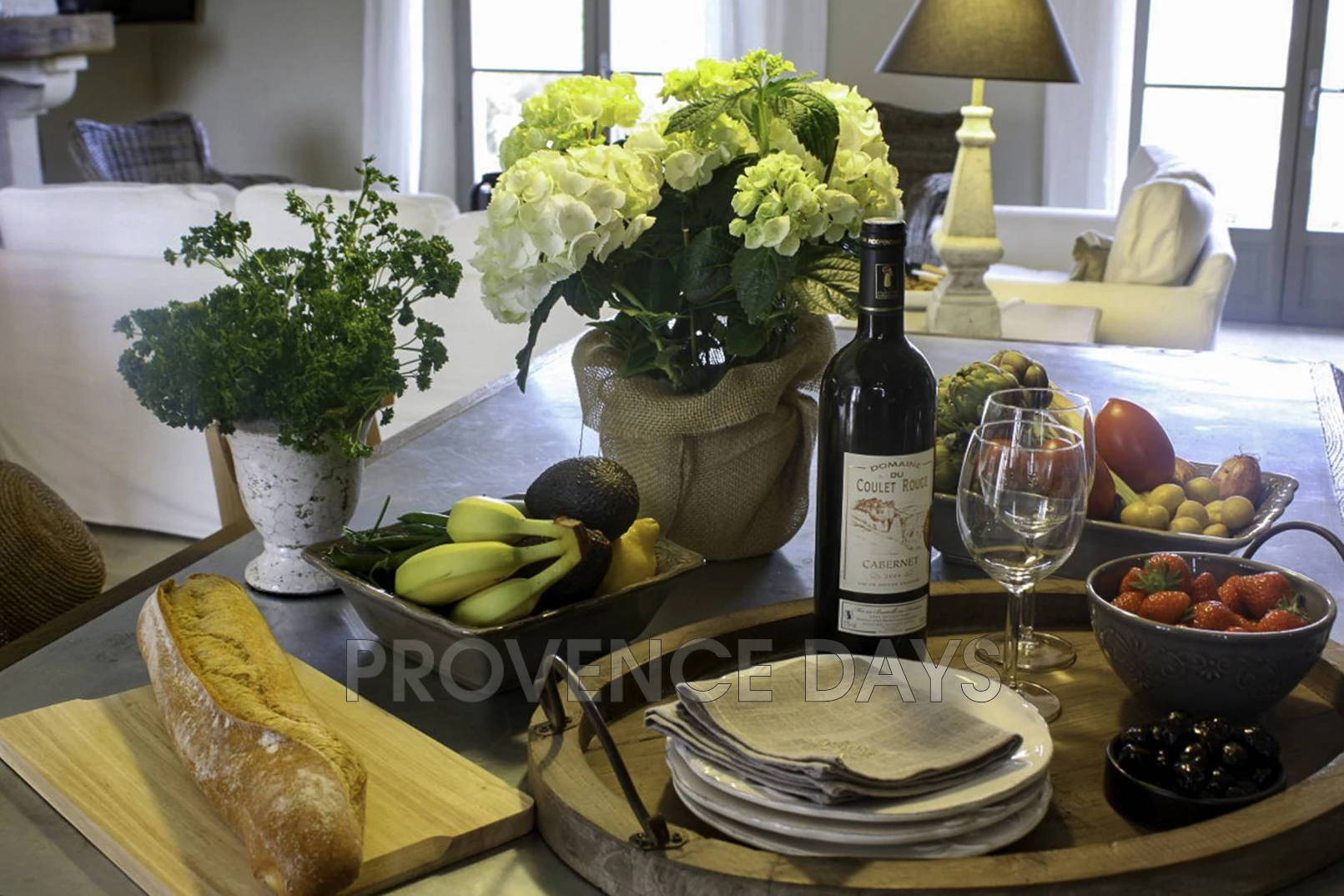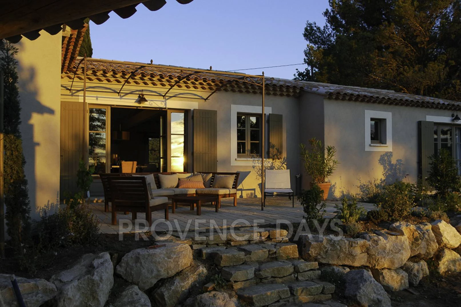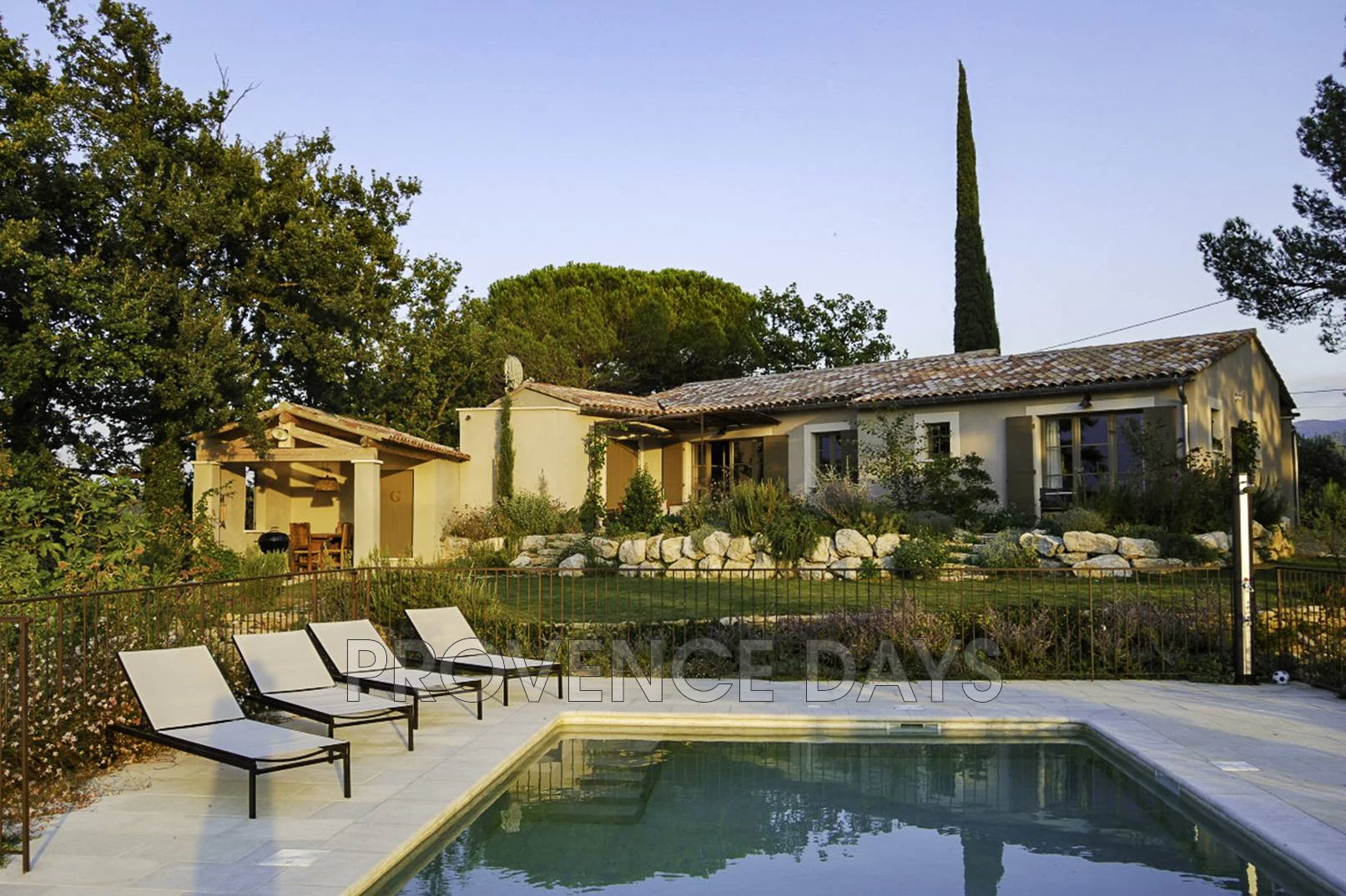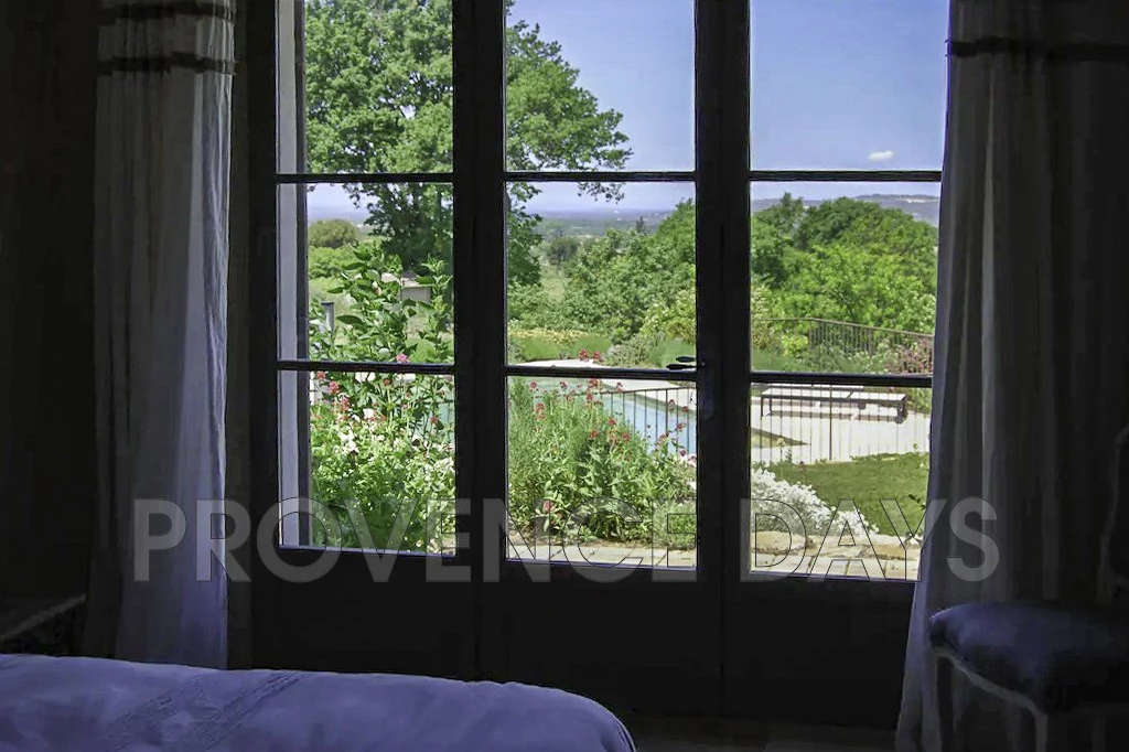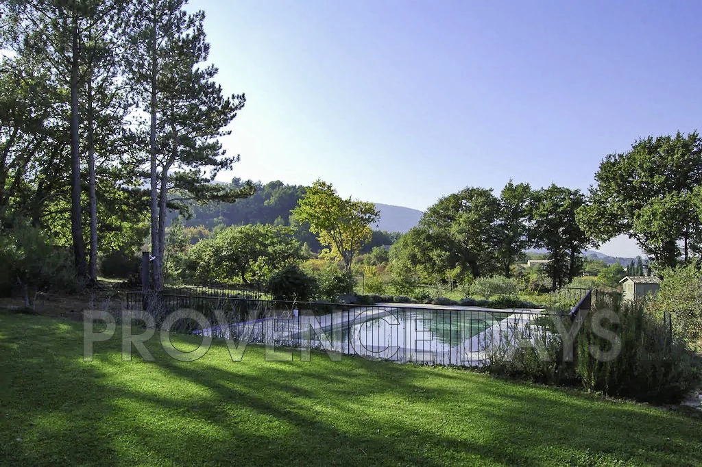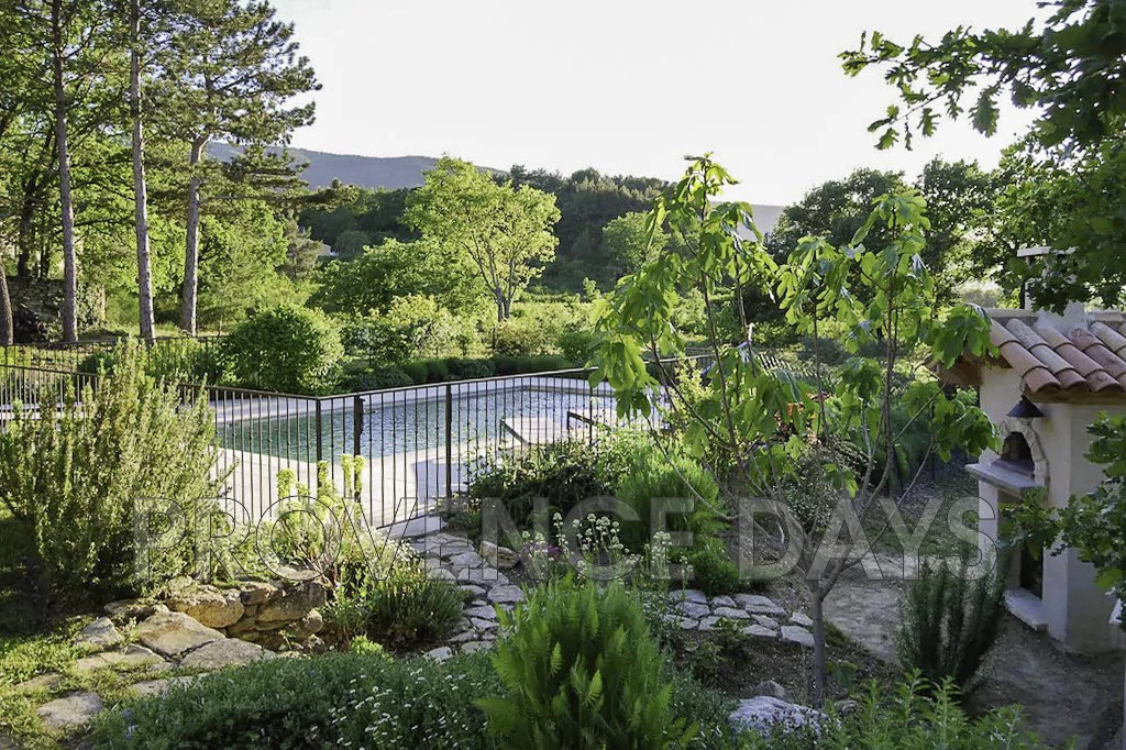 The garden wraps around the house but principally flows down from the house from the vine-covered dining terrace through to the fenced pool and beyond with views out across the Luberon landscape