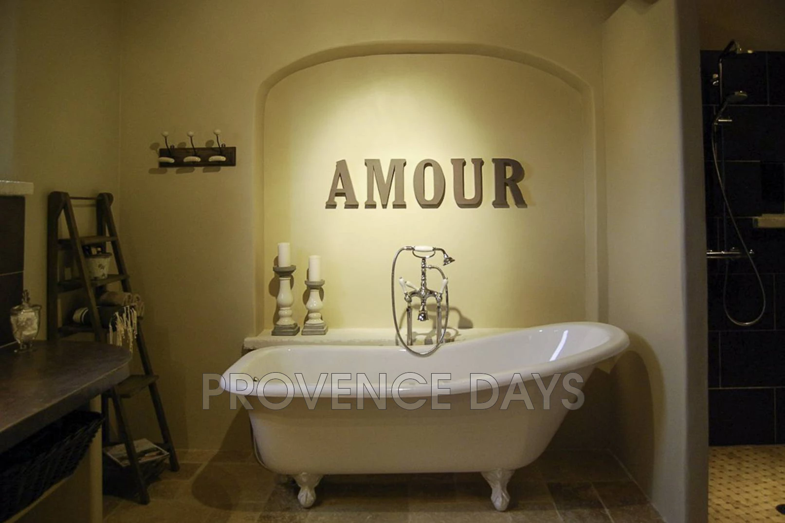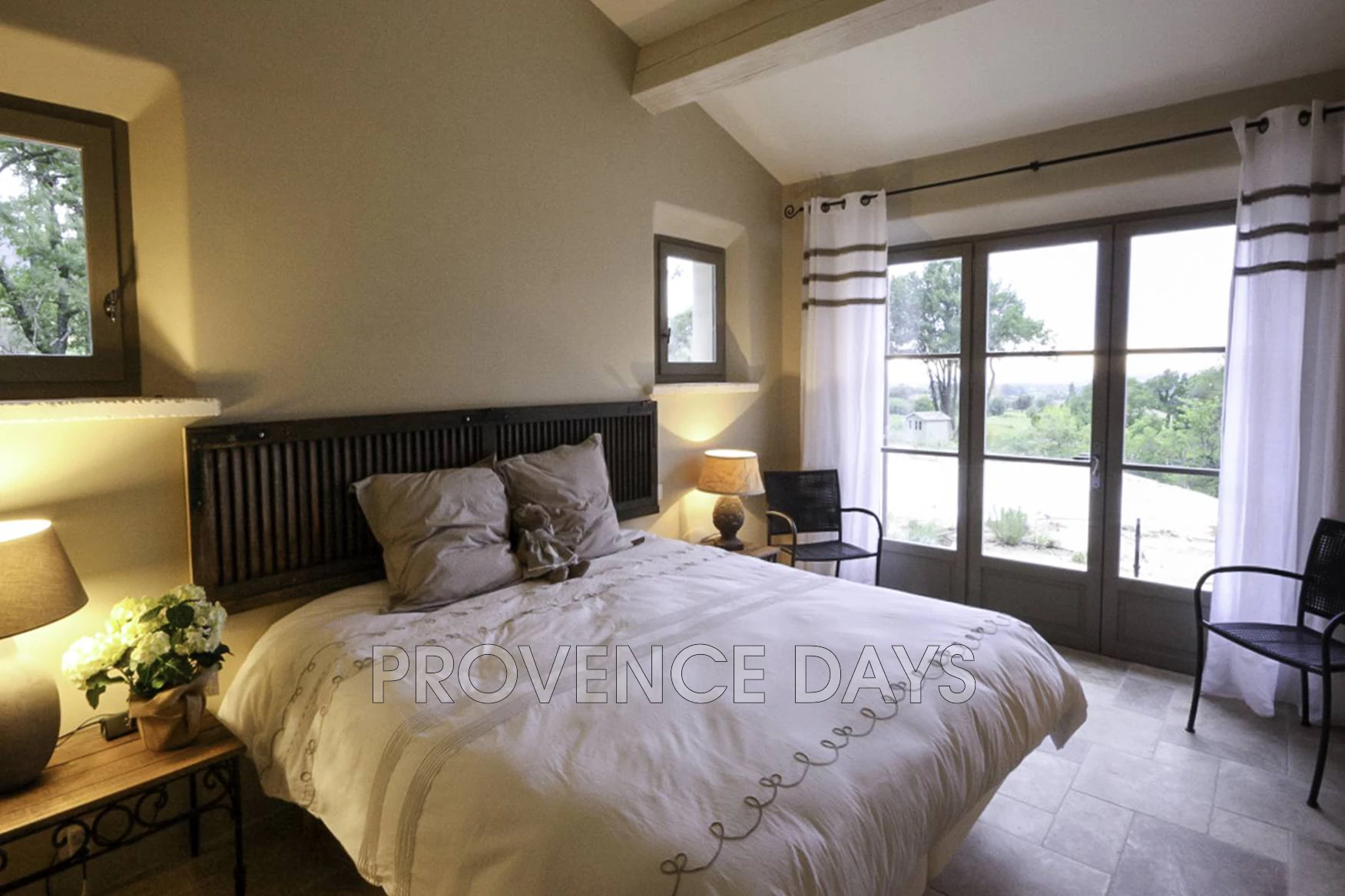 • Bedroom 1: The master bedroom with king-size bed has french doors onto its own terrace overlooking the pool. The sitting area is separated from the main terrace by a bank of wild rosemary, lavender, and thyme. The ensuite bathroom has a large, walk-in shower, and bath.