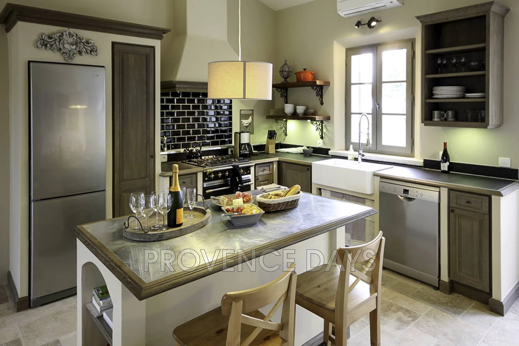 • Kitchen: Large and open and fully equipped with all new appliances, including a black lacquered Lacanche oven.