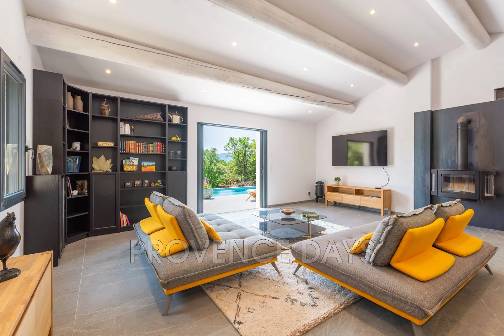 * Grand salon: This is the ultimate space for relaxing and entertaining. It stretches from the front to the back of the house and overlooks the garden and pool on three sides. It is furnished with large designer sofas, perfect for relaxing, a library and a smart TV. For the musically inclined there is also a piano.