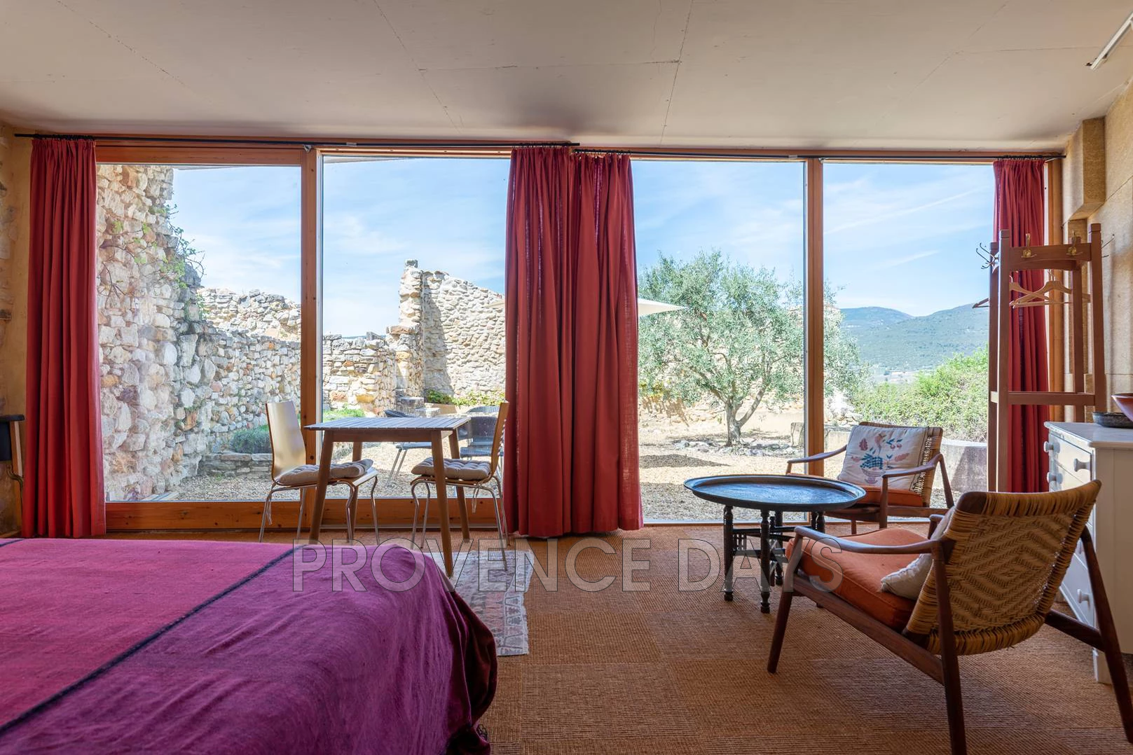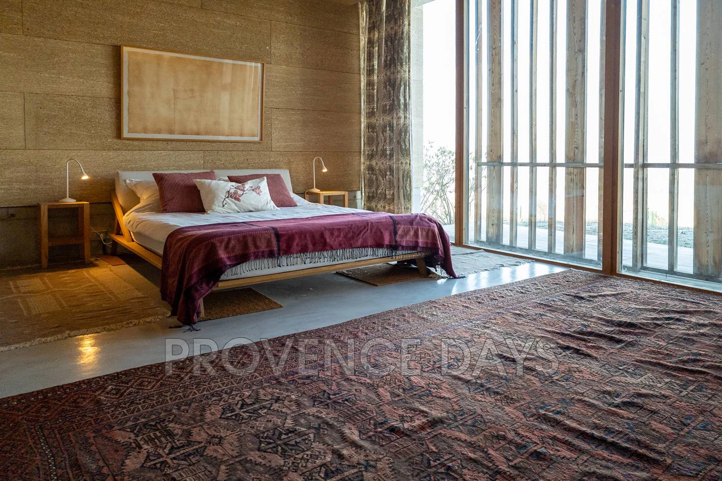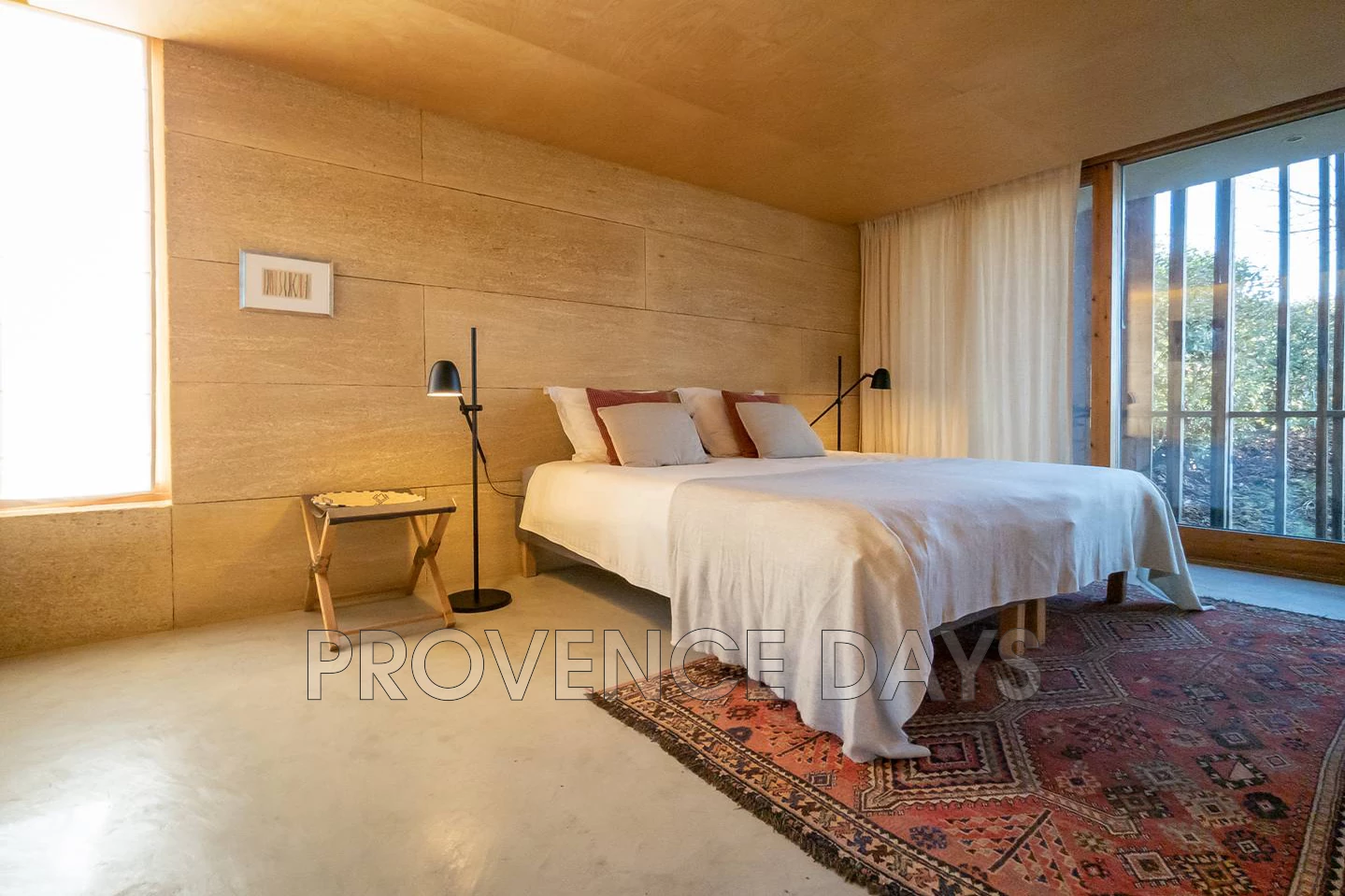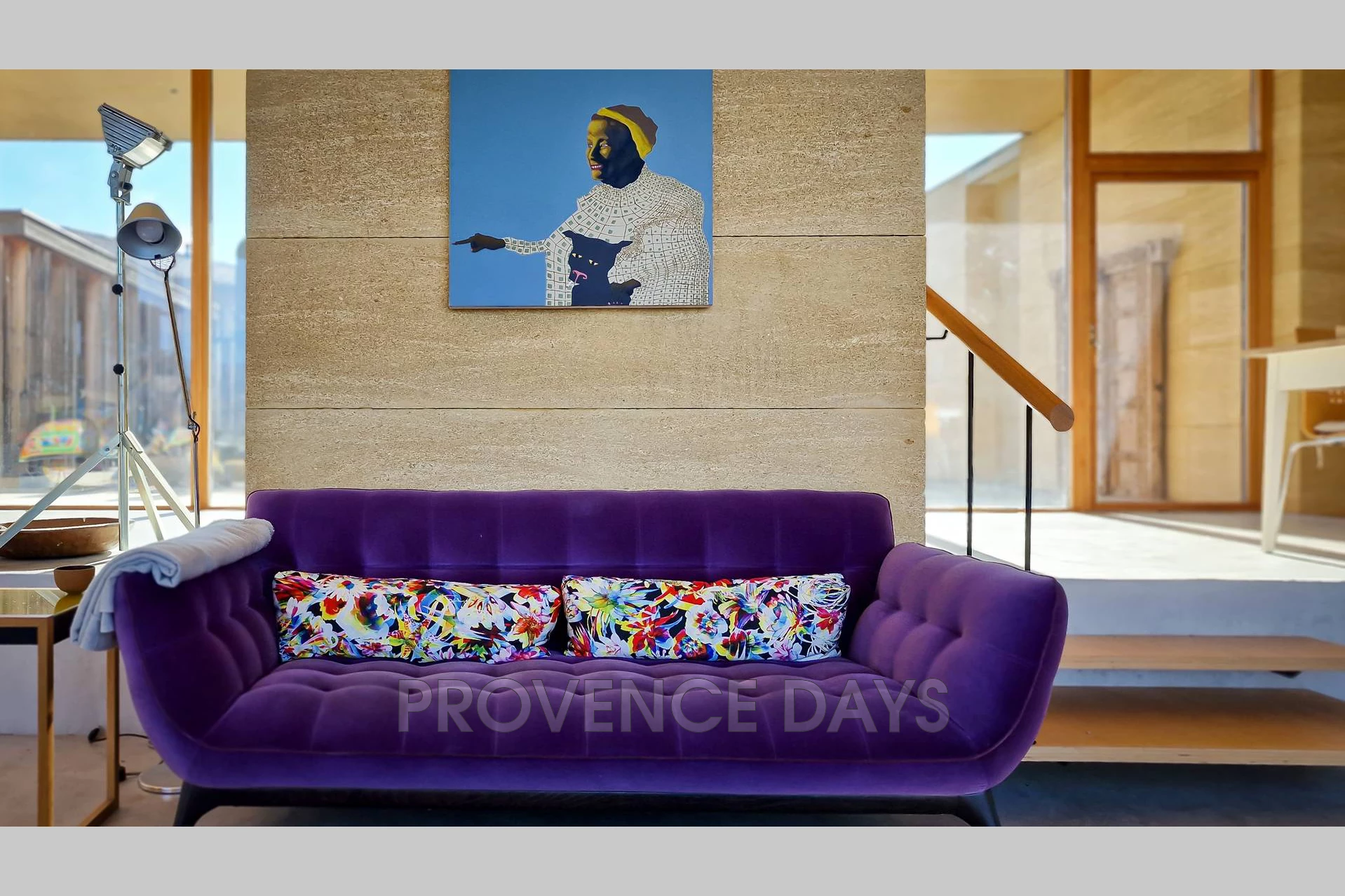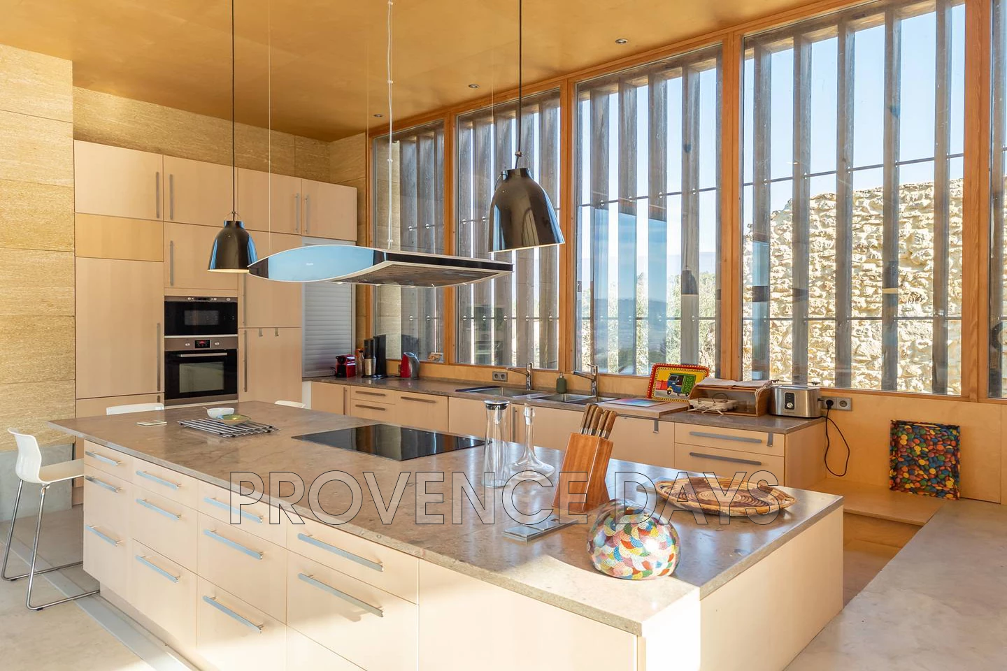 This is a beautifully styled open plan space with unusual arcithectual details. This modern interior has been cleverly crafted from the shell of a ruined farmhouse with stones from the region (pierres de gards) which it wears almost like a disguise so not to spoil the natural setting.