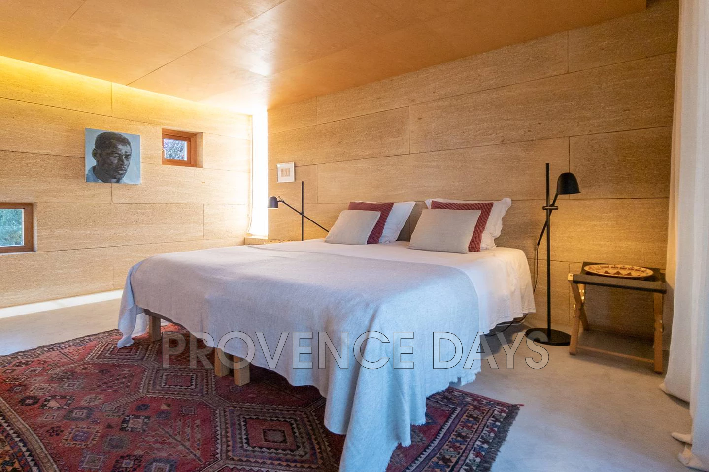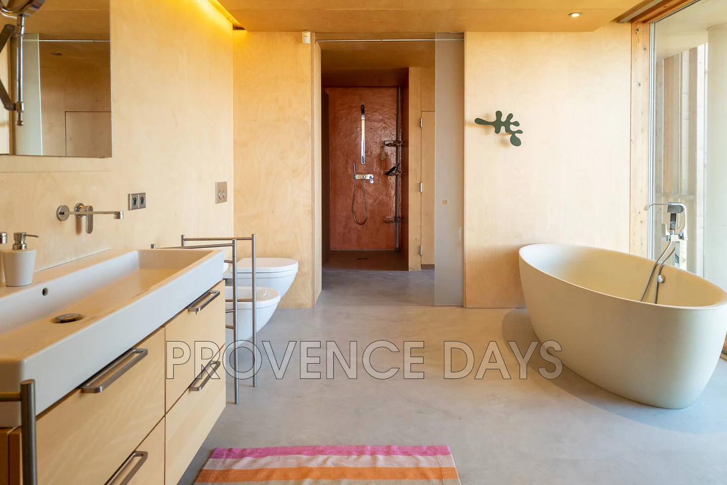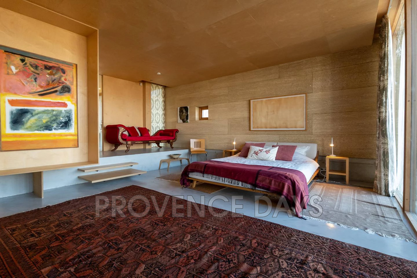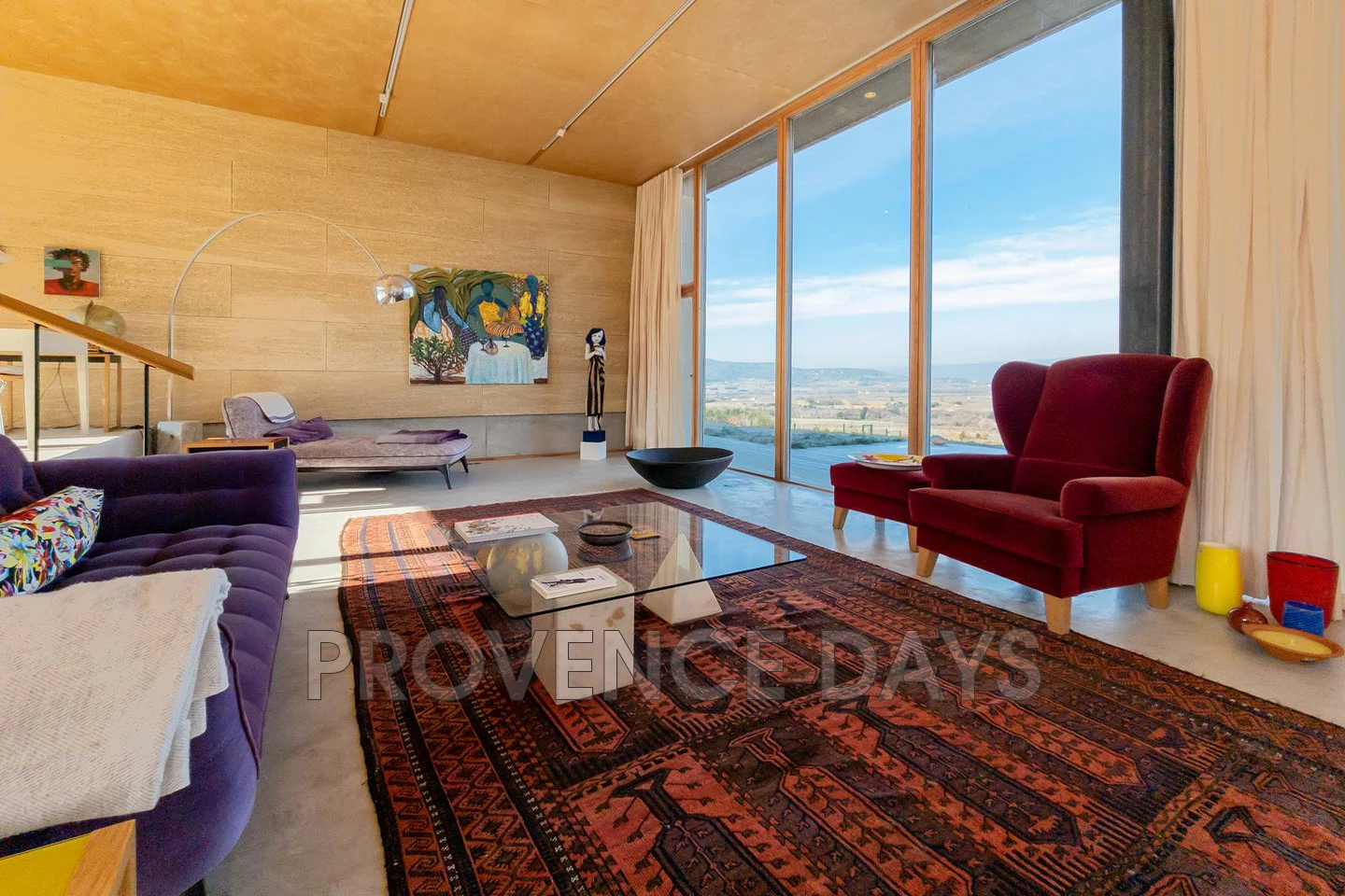 This is a beautifully styled open plan space with unusual arcithectual details. This modern interior has been cleverly crafted from the shell of a ruined farmhouse with stones from the region (pierres de gards) which it wears almost like a disguise so not to spoil the natural setting.