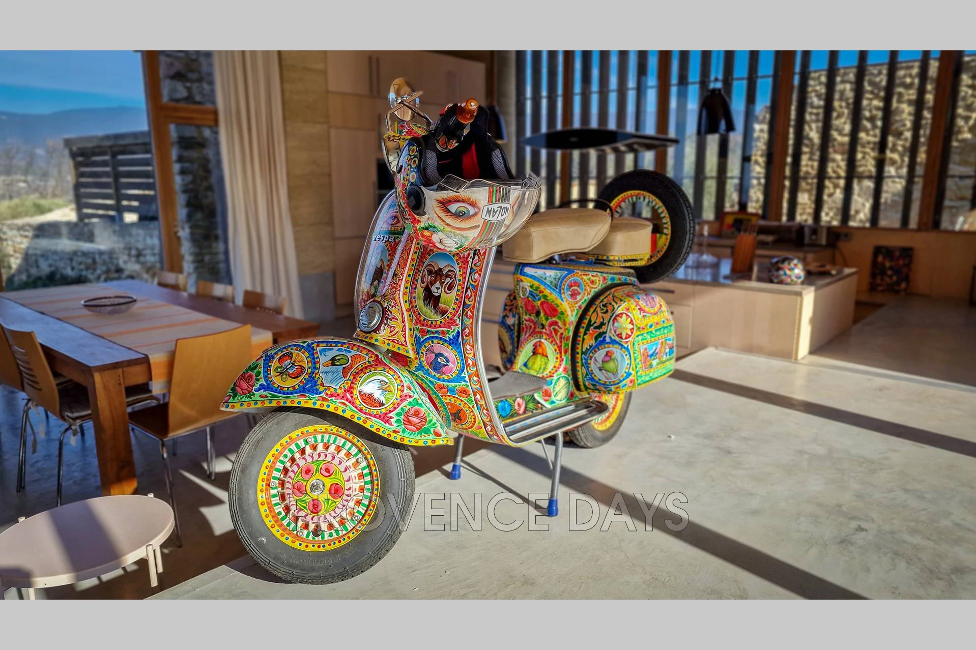 The stylish interior has been carefully chosen to complement the house and includes a collection of treasures from all over the globe, not to mention the incredible handpainted scooter which takes pride of place in the living area.