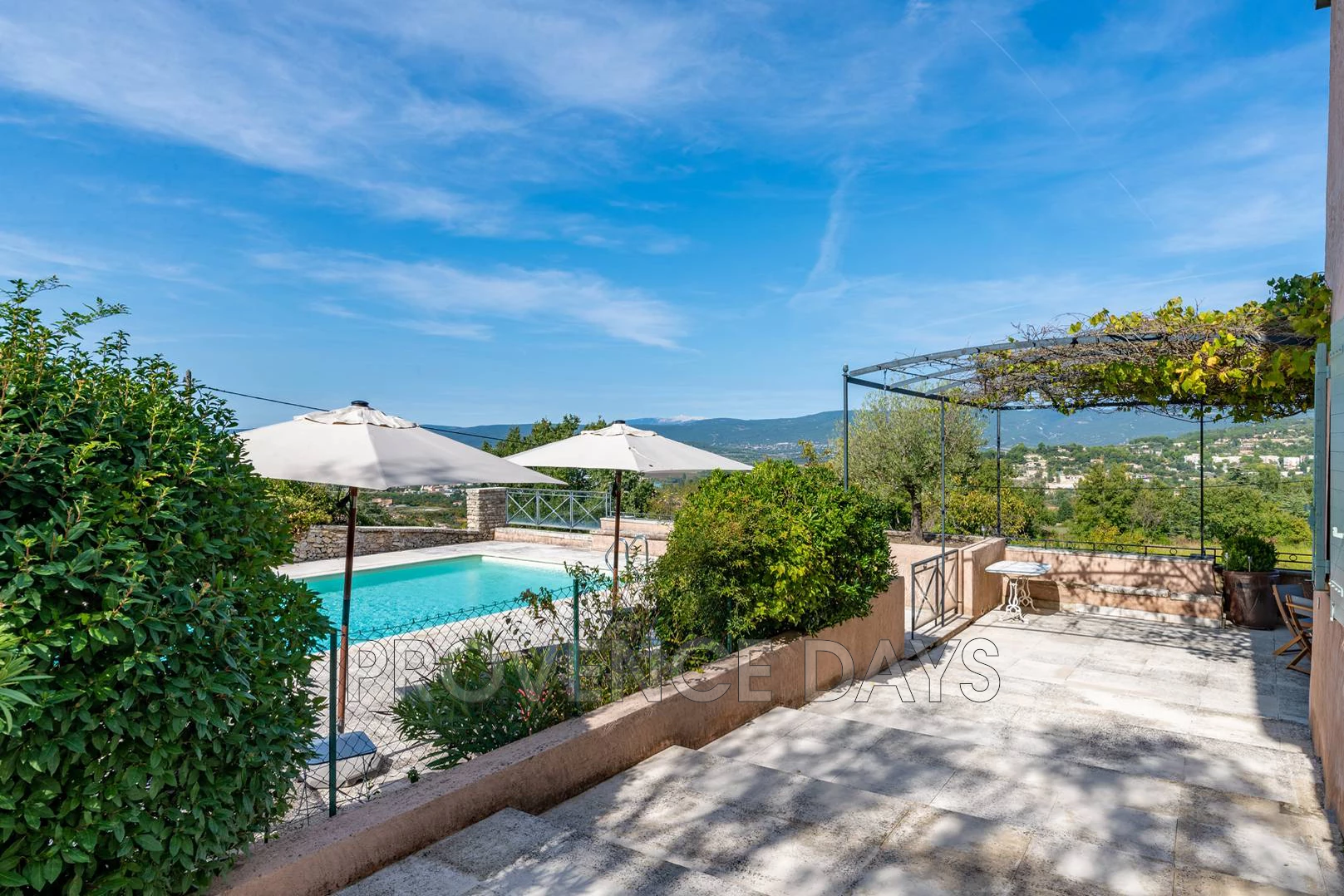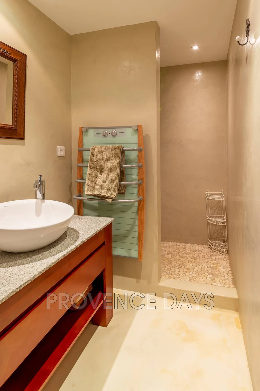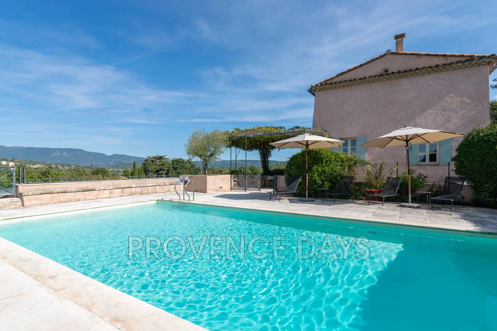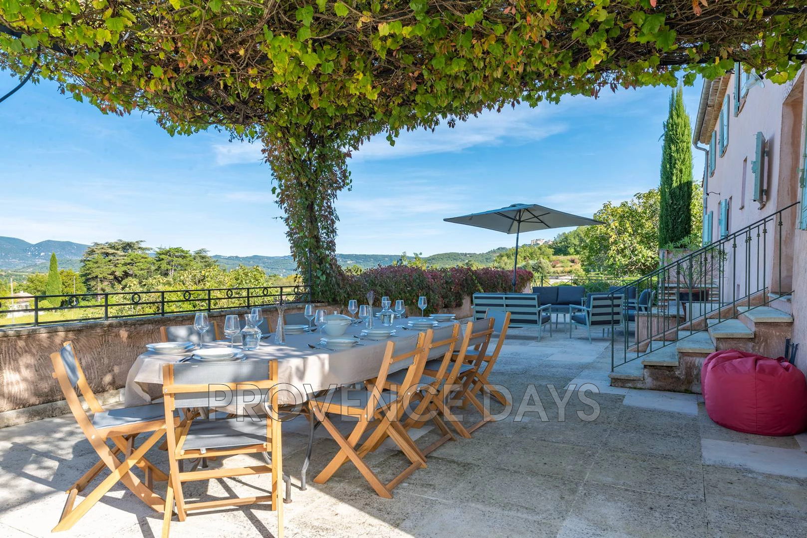 There are large paved terraces surrounding the house, so you can enjoy being outside all day long. To the South side of the house the terrace faces the gardens and fountain and on the North the terrace overlooks the Luberon mountains and has a large shady trellis. There are outdoor tables and chairs and a BBQ.