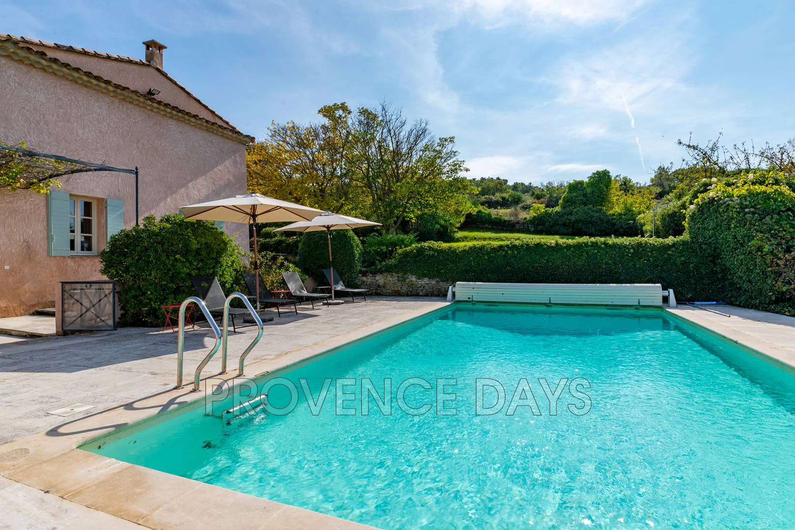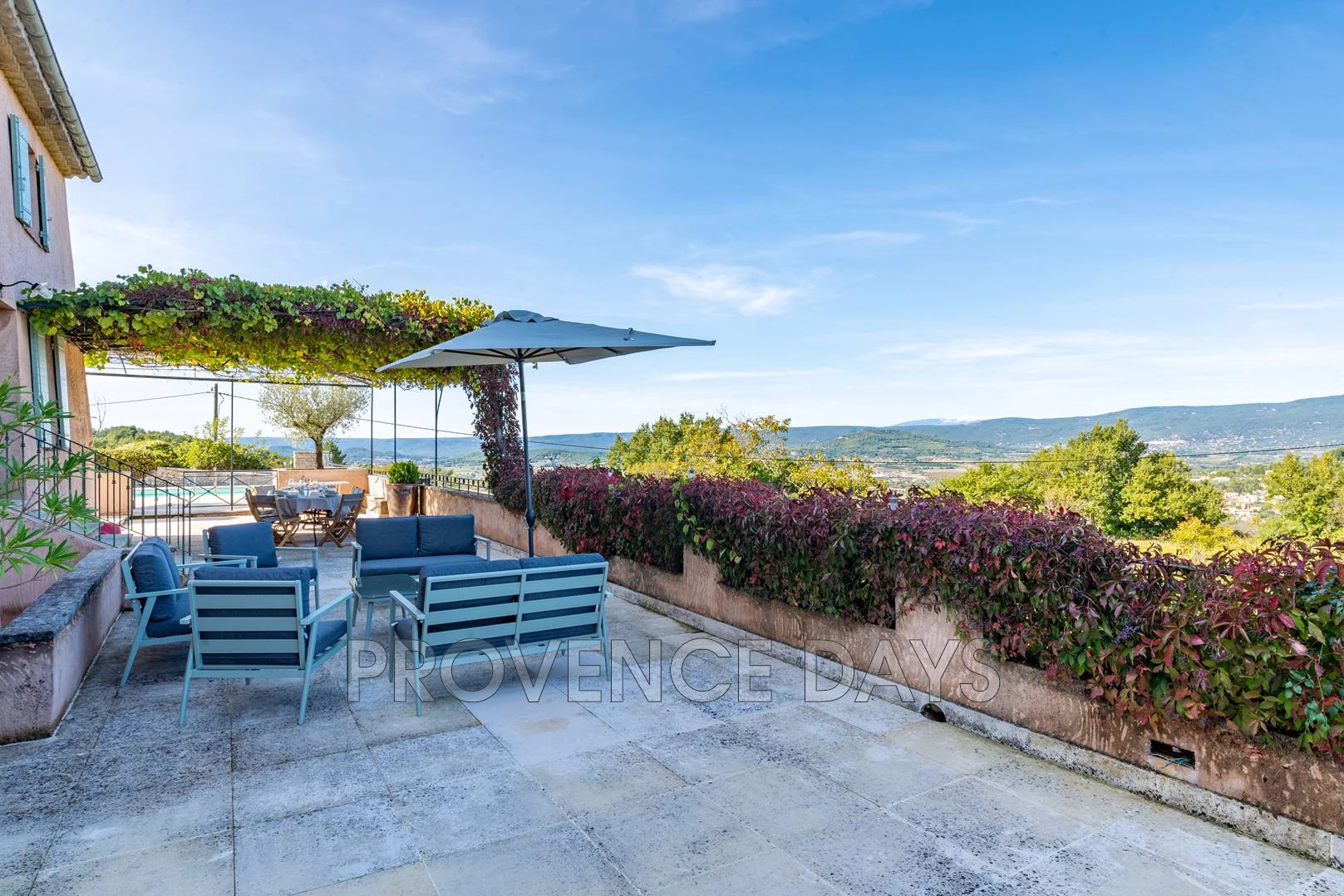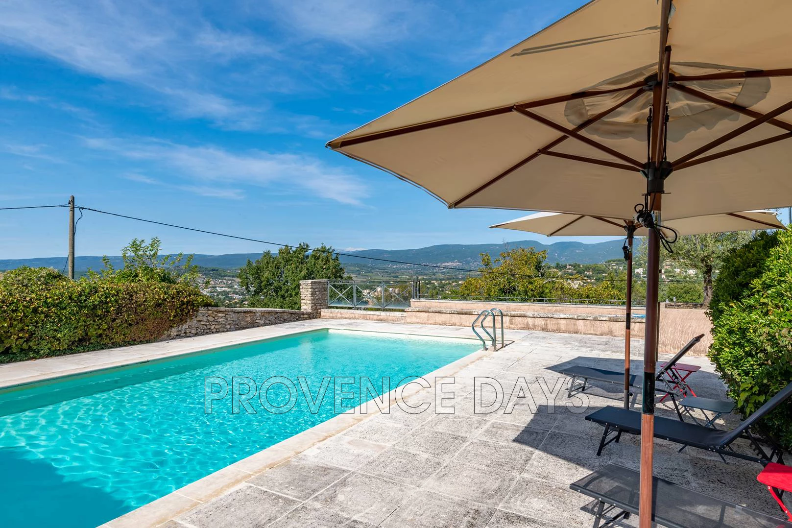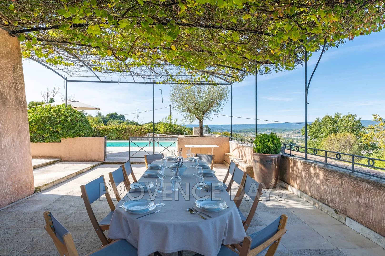 There are large paved terraces surrounding the house, so you can enjoy being outside all day long. To the South side of the house the terrace faces the gardens and fountain and on the North the terrace overlooks the Luberon mountains and has a large shady trellis. There are outdoor tables and chairs and a BBQ.
