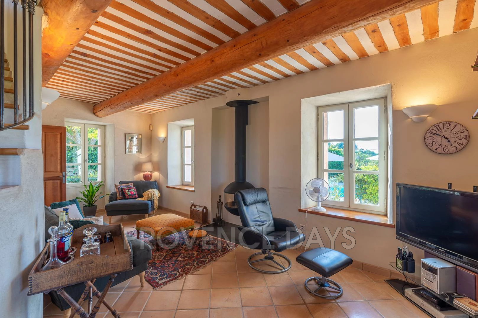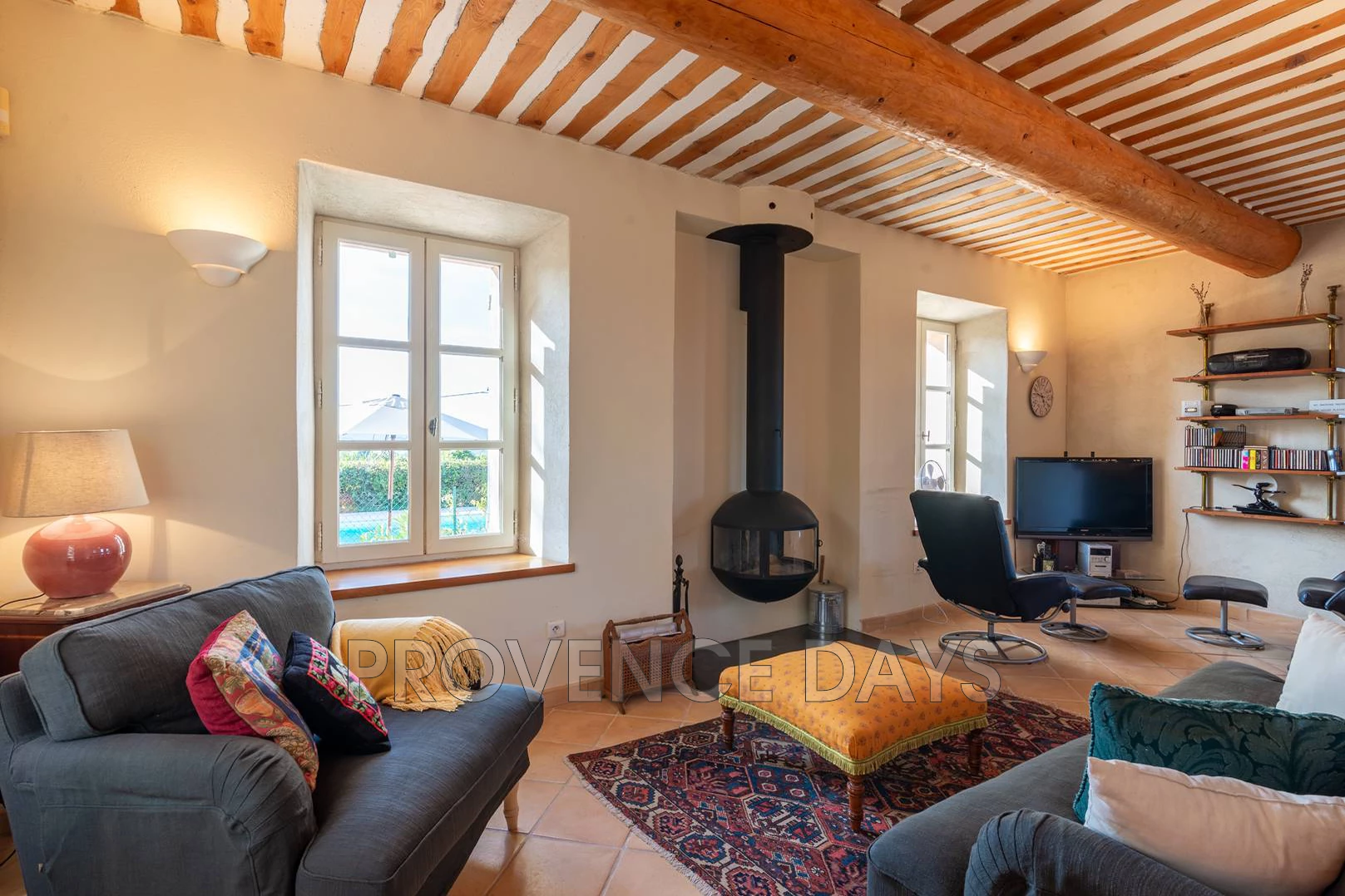Living room: At one end of the ground floor there is a separate living room with TV, as well as an enclosed fireplace. The TV has an Amazon Firestick which gives access to Netflix, Disney etc (guests will need to use their own accounts), French digital TV and there is a DVD player, stereo, and an assortment of music and films.