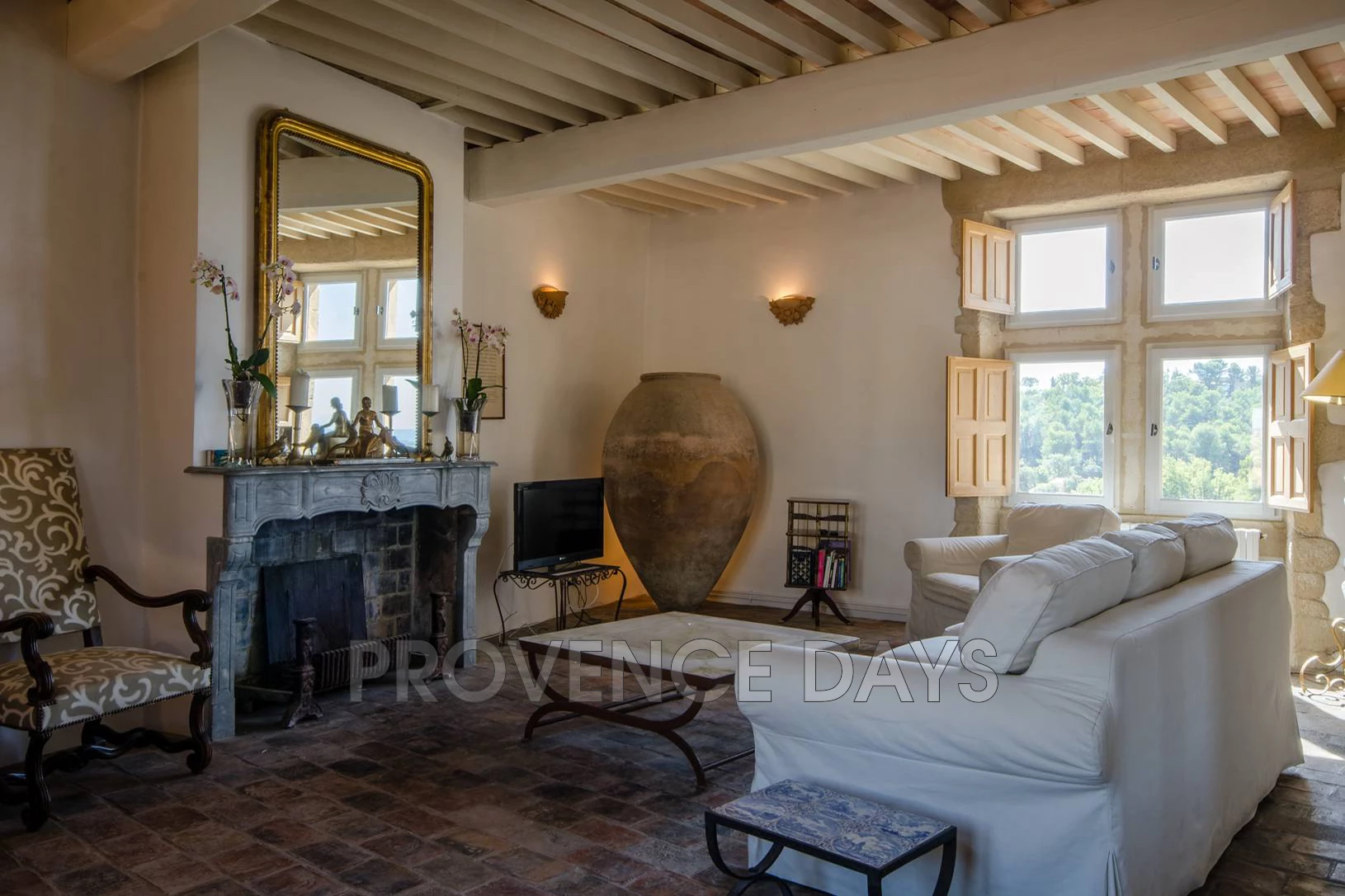 • Living Room: On the 2nd floor up, with views on both sides, this room has fireplace and TV. But what are those massive terracotta urns? Original grain jugs, now serving as beautiful lighting features.