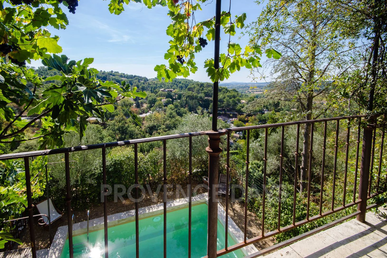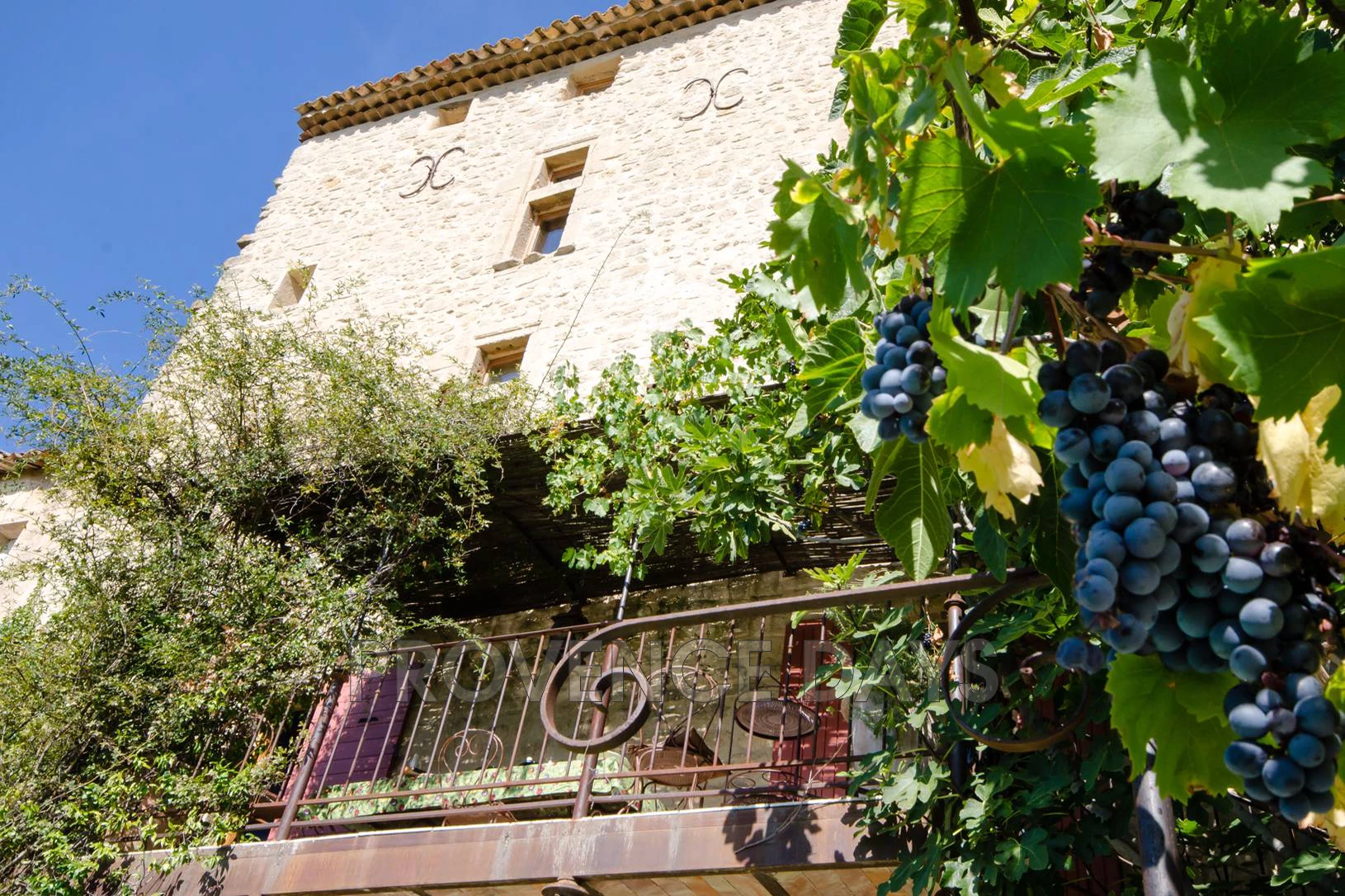 The balcony has a dining table and barbecue, and is shaded overhead by vines. Figs and grapes are in easy reach.