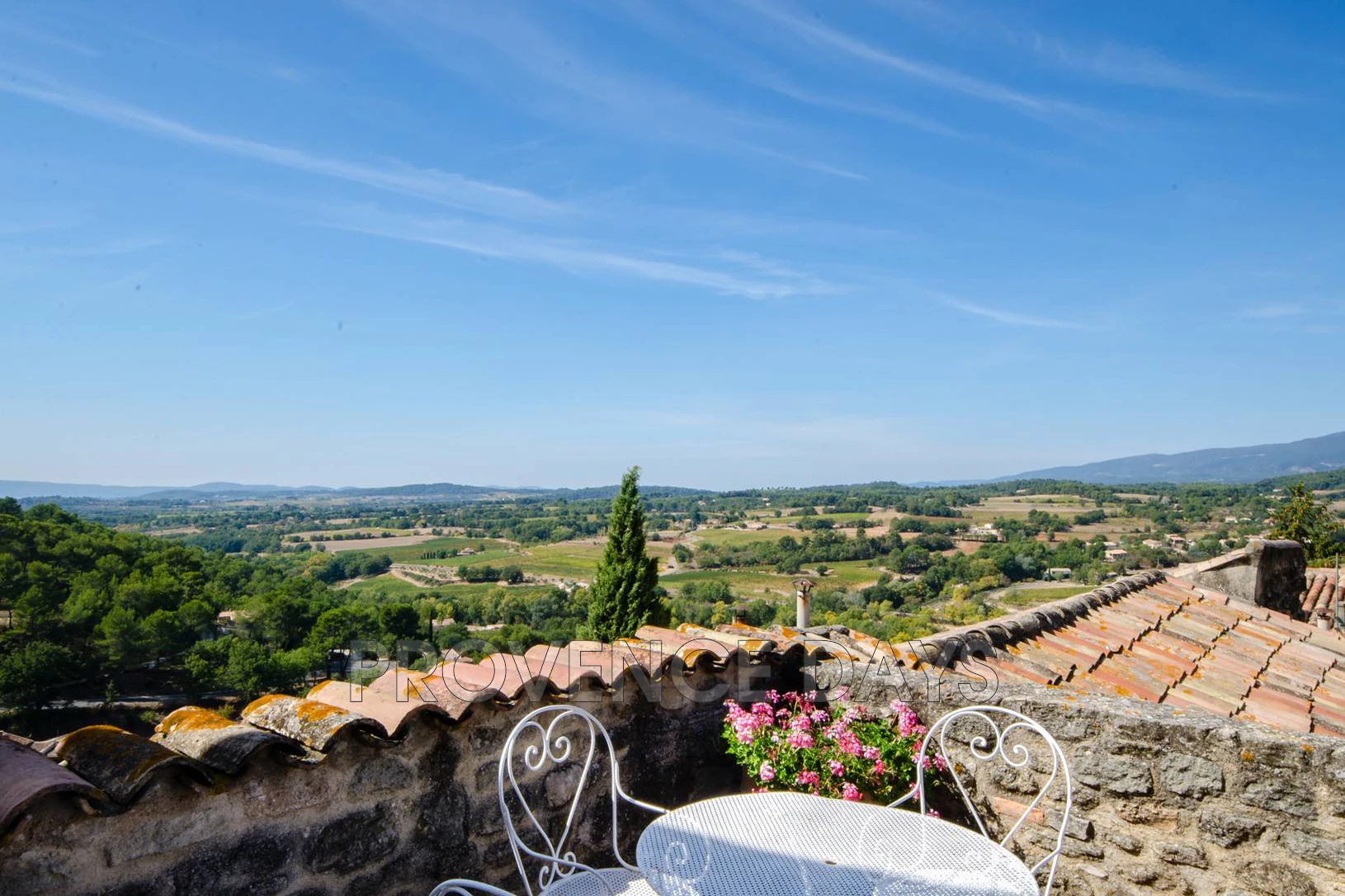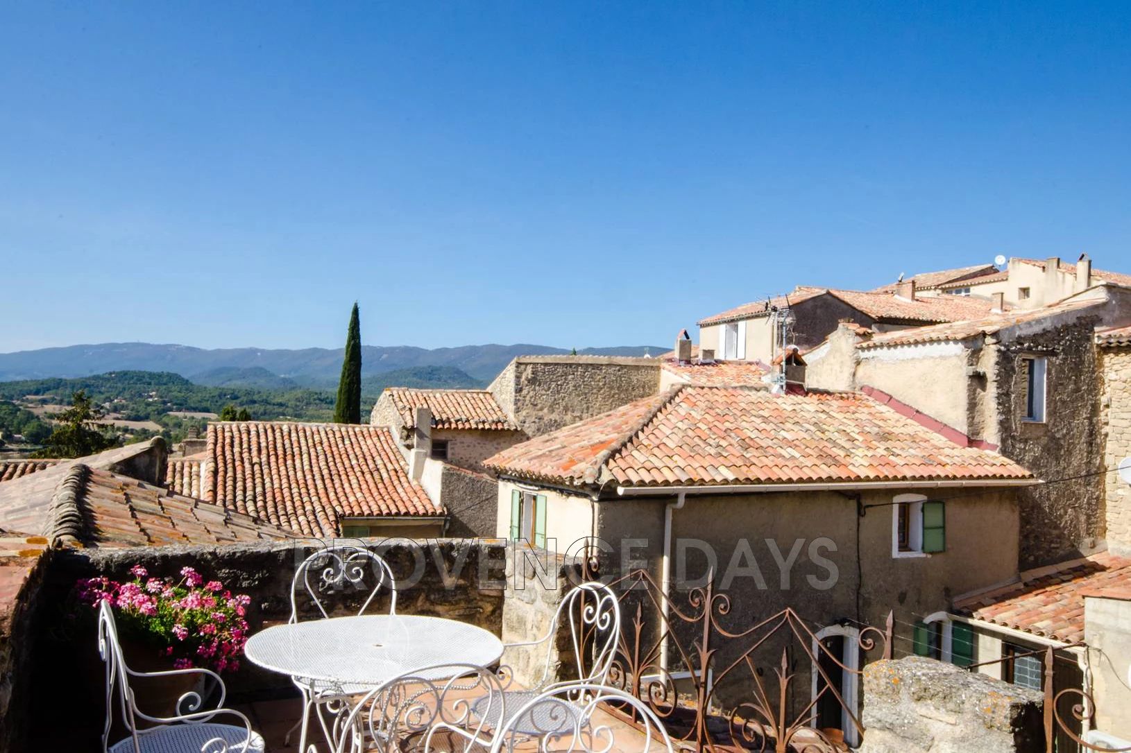 On the 2nd floor up, outside the upper kitchen, is the panoramic terrace with tables and chairs. Its views extend over all the surrounding countryside as well as the rooftops of Grambois. -