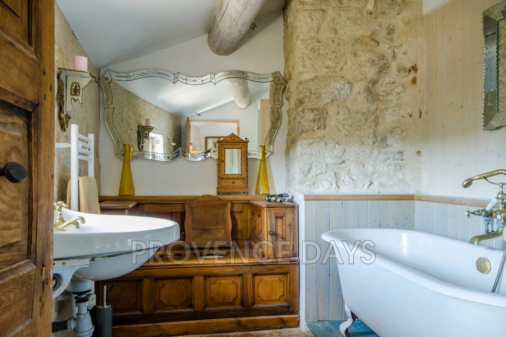 • Bathroom 1: En suite to bedroom 1, a stunning room featuring a claw-foot bath flanked by brass towel rails, and double basins. A place to linger and enjoy a good book in the bath. A separate staircase connects this bathroom to bedroom 5 below, which gives access to a shower.