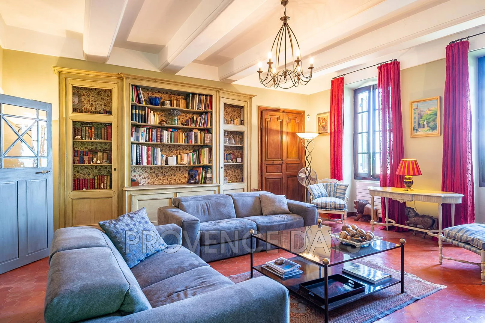 Lounge: Leading from the kitchen you can pass through to the cosy lounge with its large comfortable sofas and fireplace, overhead are high ceilings and underfoot a traditional ‘tomettes’ tiled floor. The large windows look out onto the splendid garden and valley view. You will find a T.V. and DVD player here.