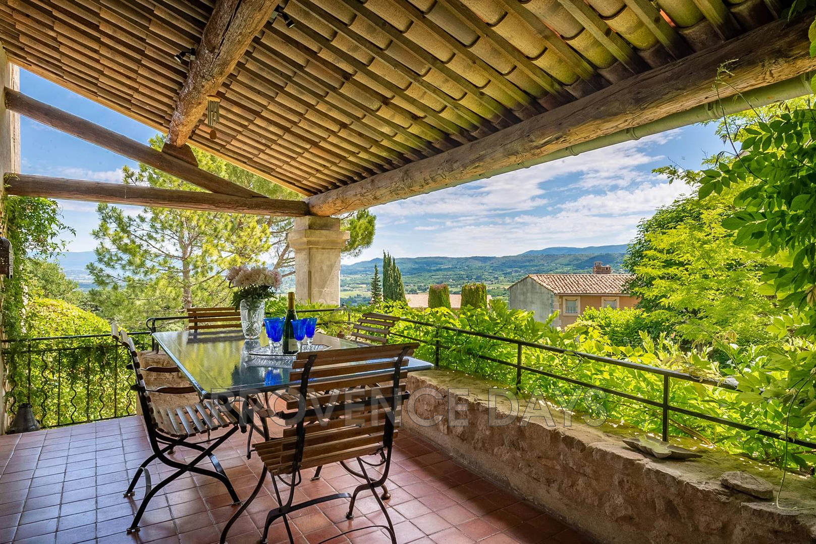 Moving further down the beautiful garden you find the pool area with a delightful, shaded seating area above looking out to the view.