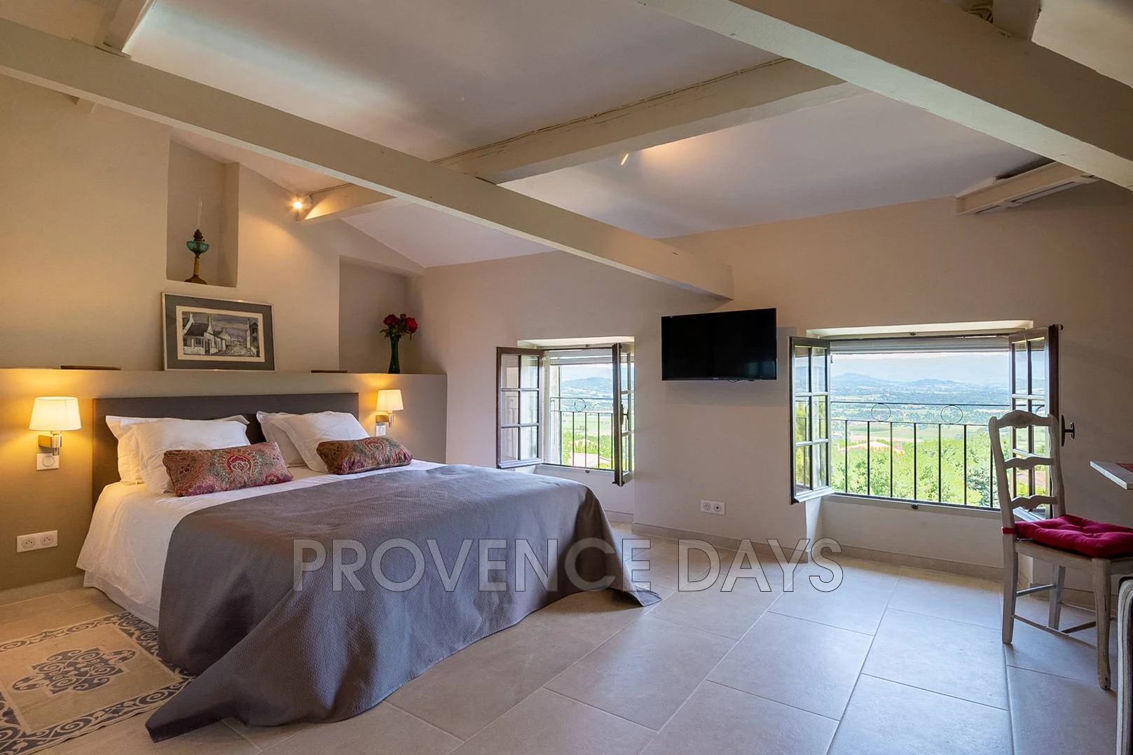 Bedroom 1: Calming room with large double bed (160 cm) with ensuite shower room, w.c., and doors open onto a Juliet balcony overlooking the garden and valley view.