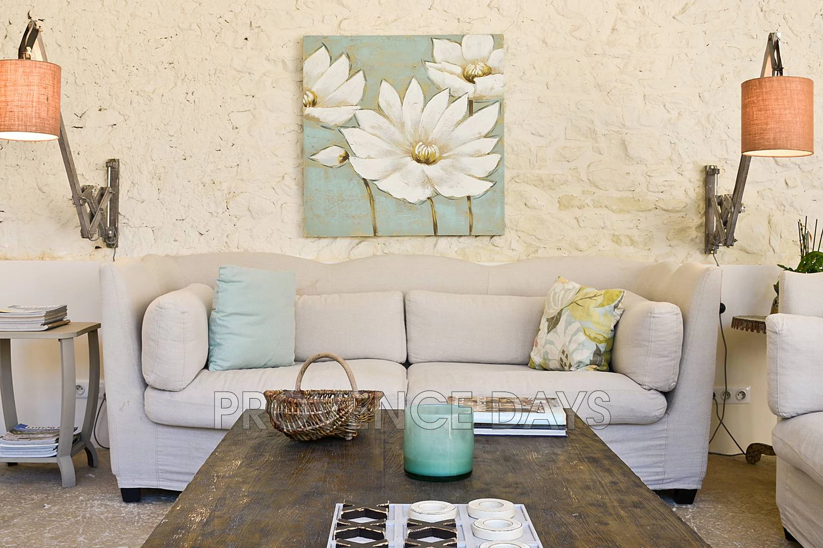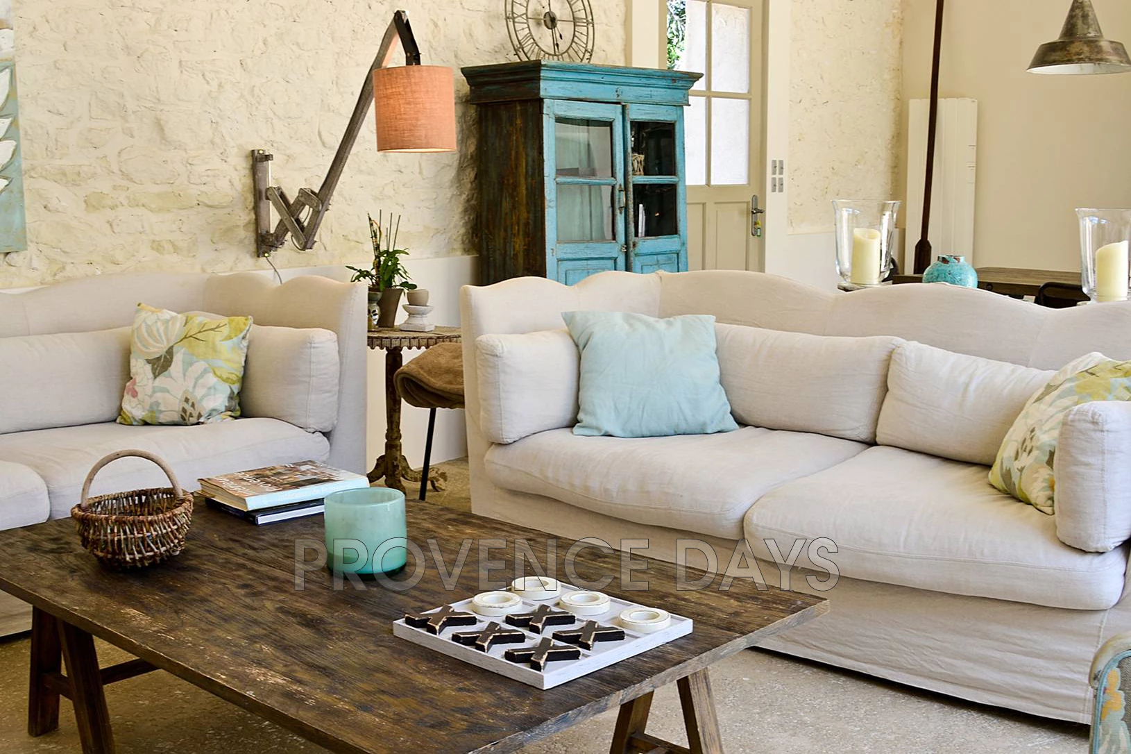 • Living Room: Forming one side of the courtyard, the living/dining room is a large and very light space with comfortable sofas and armchair, as well as dining table. There is satellite TV with French and English-language channels, as well as Apple TV which allows you to watch films and programmes on your iTunes account. There are two Bose iPod docks in the house, and WiFi internet.