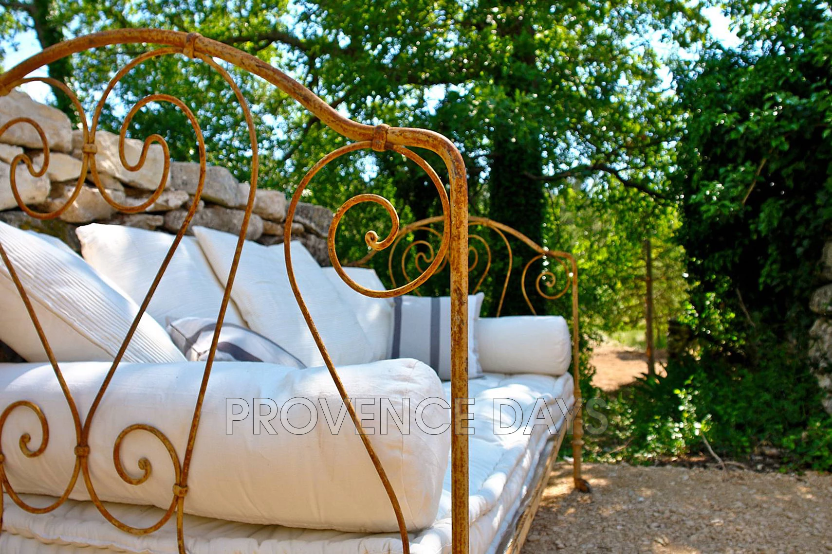 Beyond the pool, through another wooden gate the garden turns to meadow and exploration, with a view of the Luberon mountain. The land is expansive and planted with pines and olive trees, truffle oaks, fig trees and lavender. There are no neighbours to see or hear.