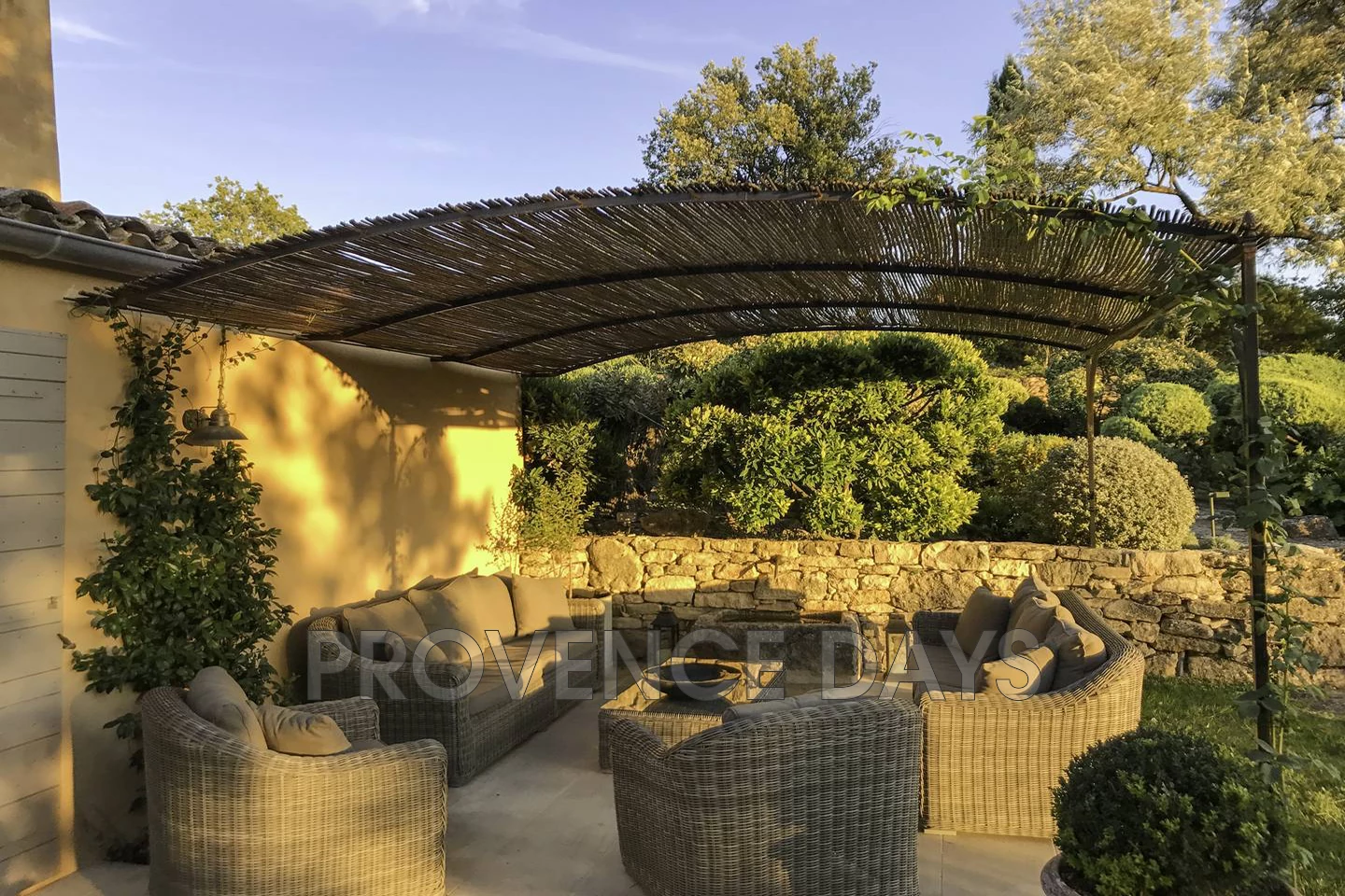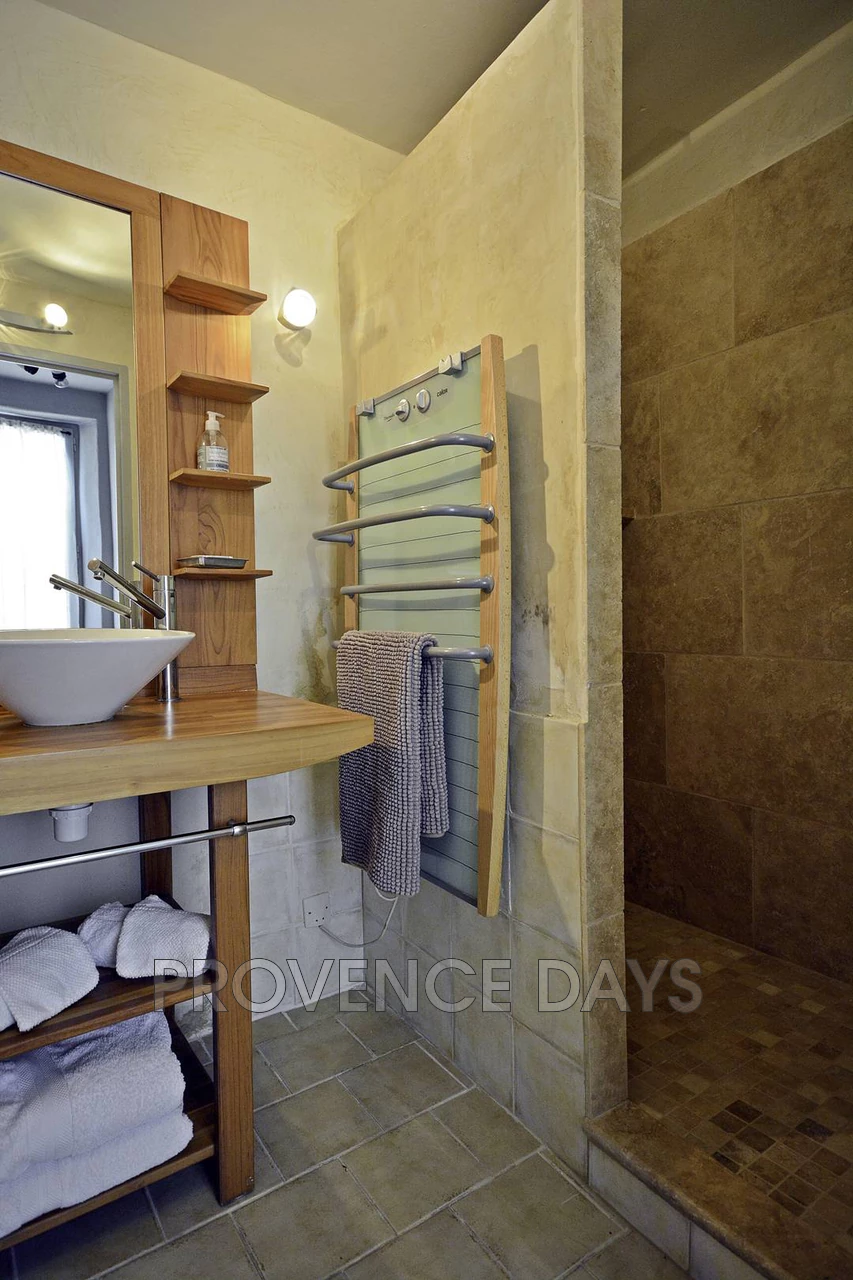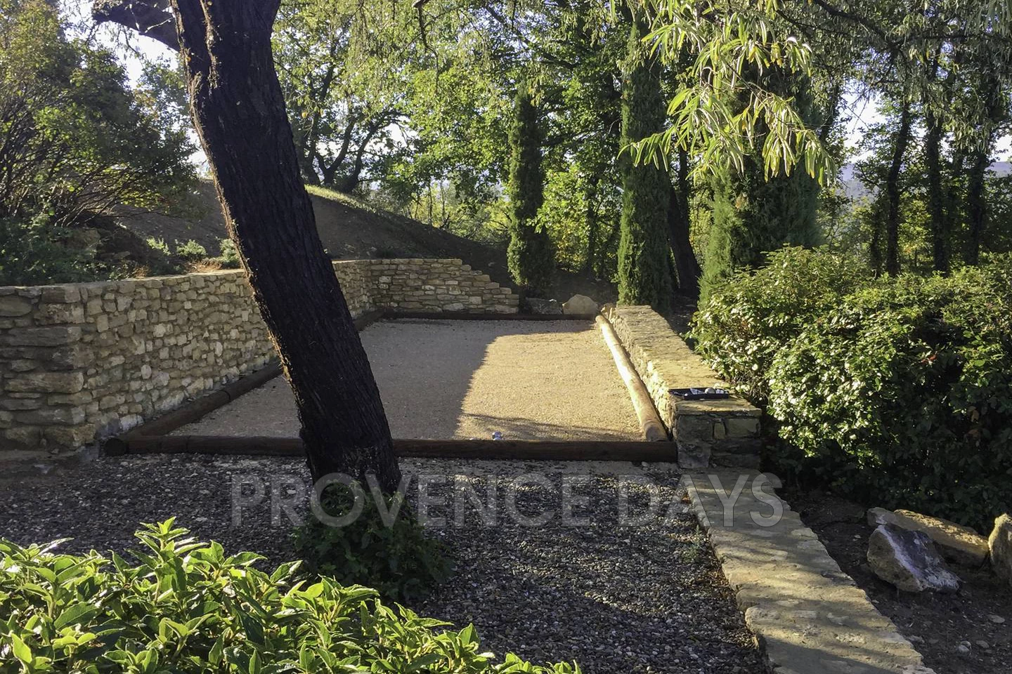 On the west side of the house adjoining the sitting room is a dining terrace and a shaded lounge area, set against the beautifully sculpted topiary garden with views out to the Luberon hills and village of Goult. Ideally placed in this area is a boules court
