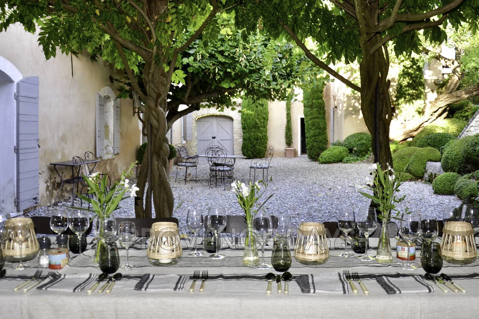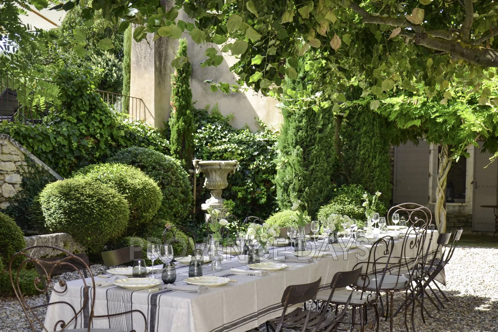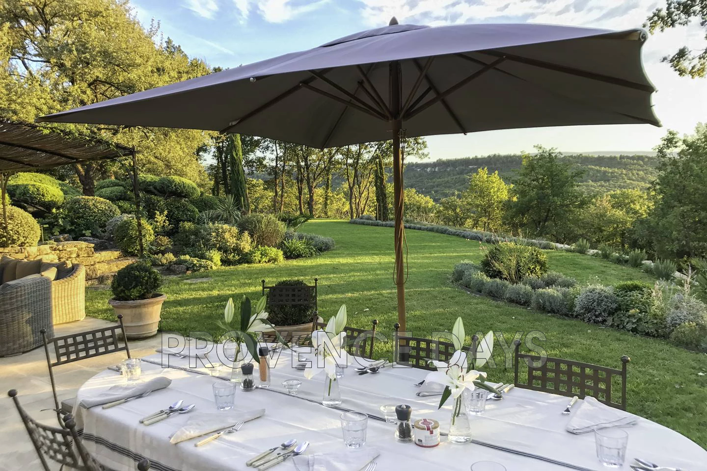 On the west side of the house adjoining the sitting room is a dining terrace and a shaded lounge area, set against the beautifully sculpted topiary garden with views out to the Luberon hills and village of Goult. Ideally placed in this area is a boules court