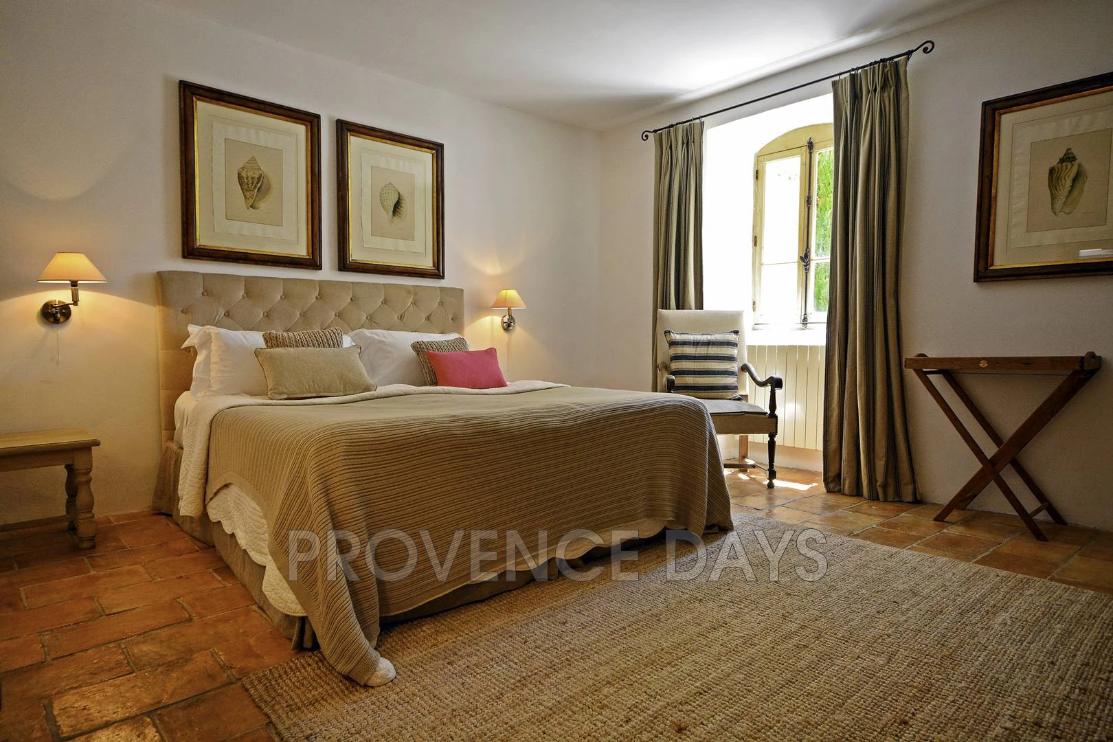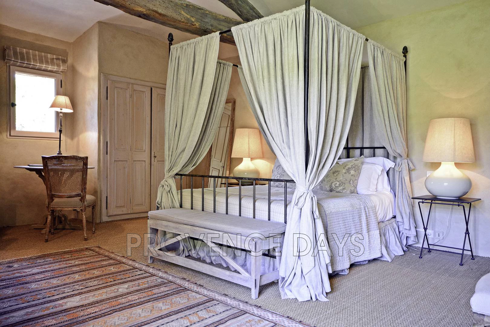• Master bedroom 1: with king sized four poster bed (180 cm) and ensuite bathroom. The room has air conditioning and doors open onto a juliet balcony overlooking the courtyard.