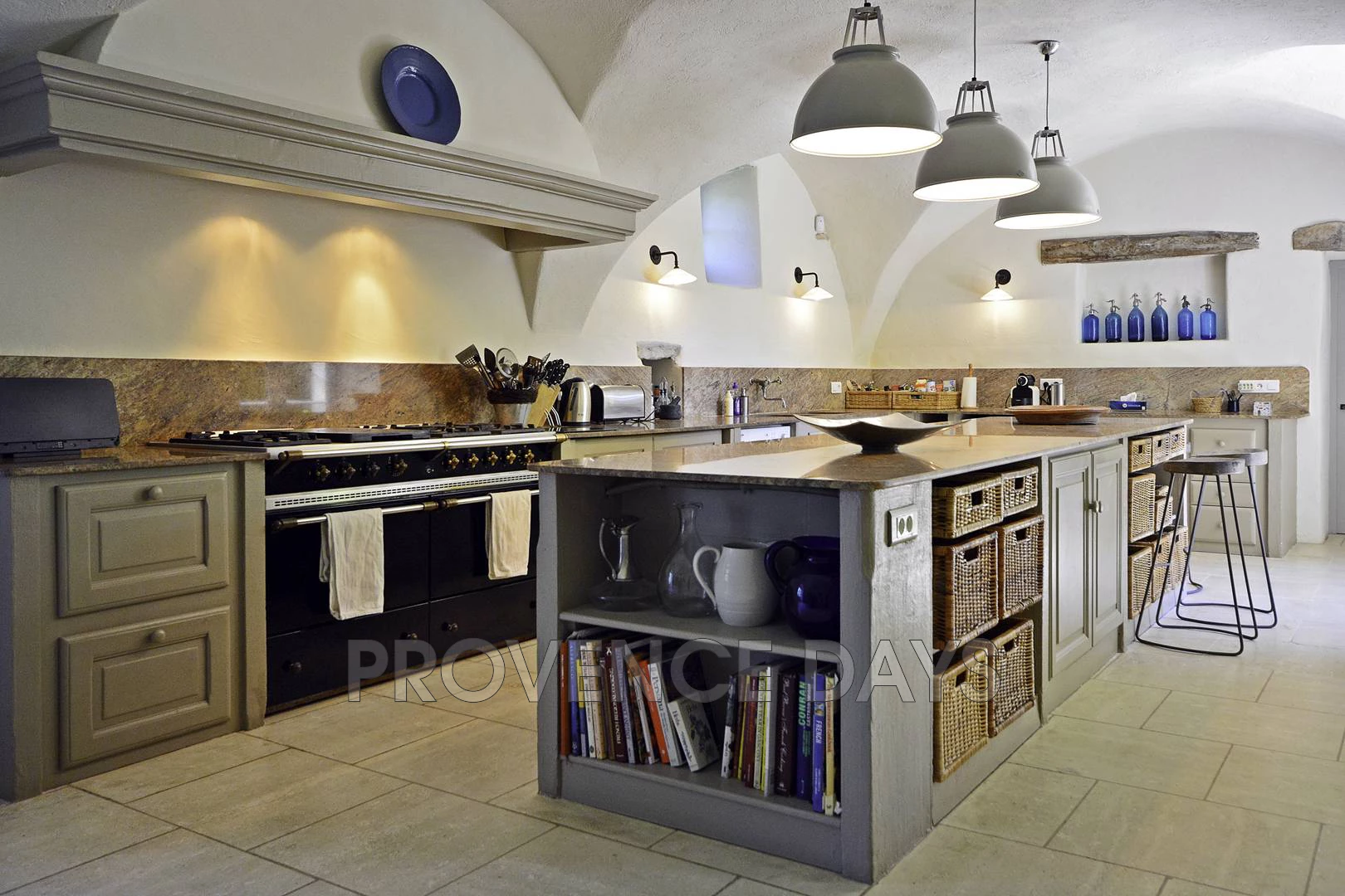 • Kitchen: Leading on from the snug you find a true chef’s kitchen again with a wonderful vaulted ceiling. The kitchen is well equipped with LaCanche range stove, a 3m long central island, large stone sink, and work tops along the side. Equipped with fridge freezer, dishwasher and air-conditioning. The kitchen allows easy access outside to the rear of the house.