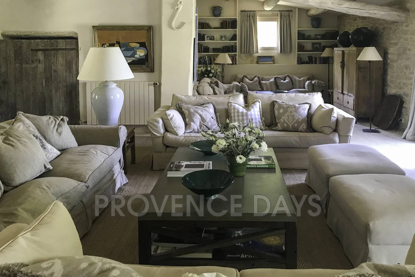 • Sitting Room: A large room housing four comfortable sofas a log burning stove and TV corner. Light floods in from the door and windows to courtyard side and from the large French doors leading to the wonderful west terrace.