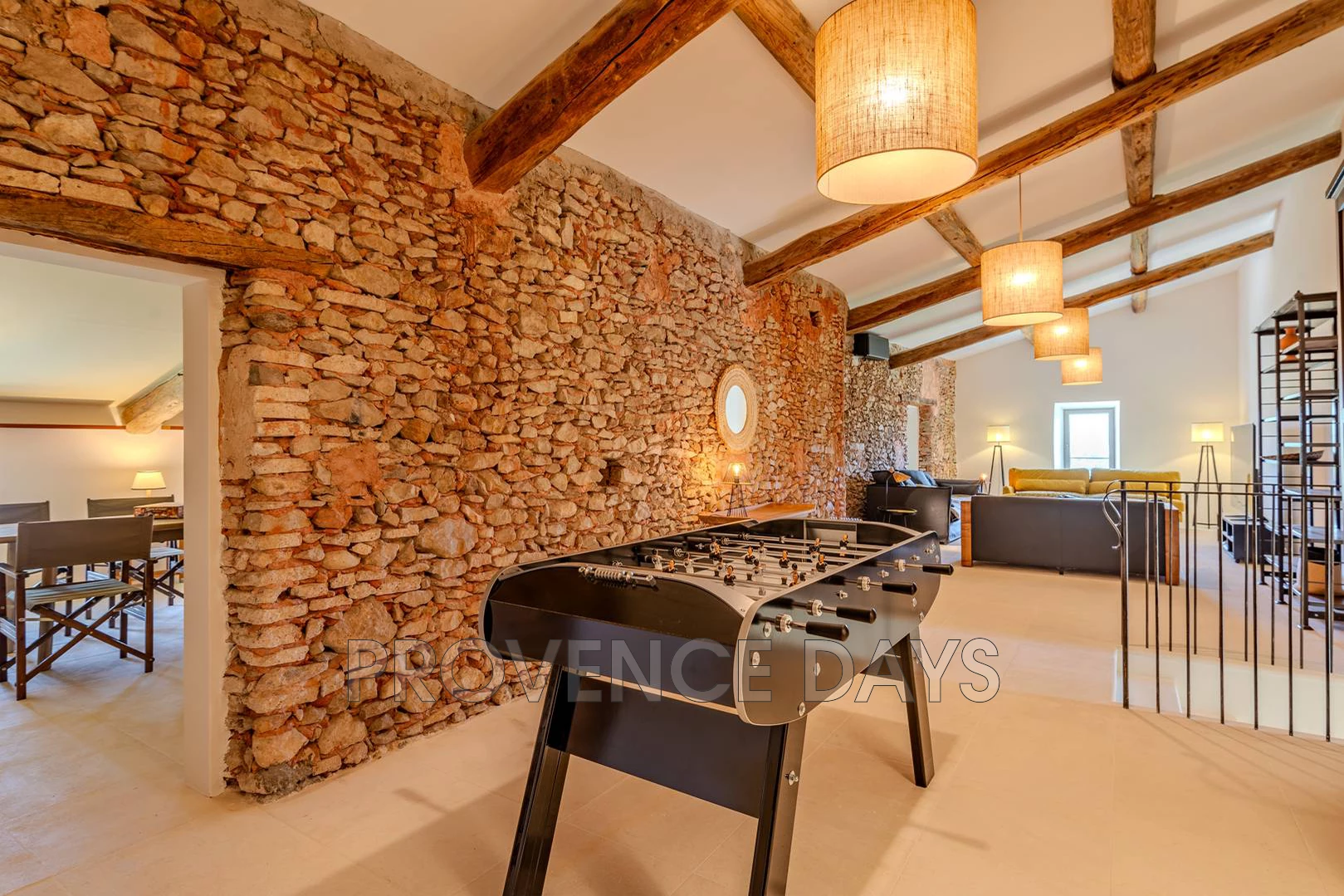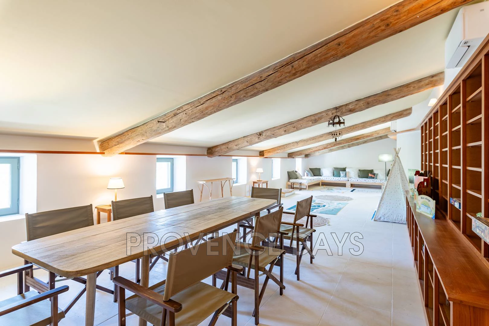 • Entertainment Area: A comfortable TV lounge with a 75-inch screen, three sofas, a table football game, a soft play zone for children with a mini tepee, and a large table for games or crafts.