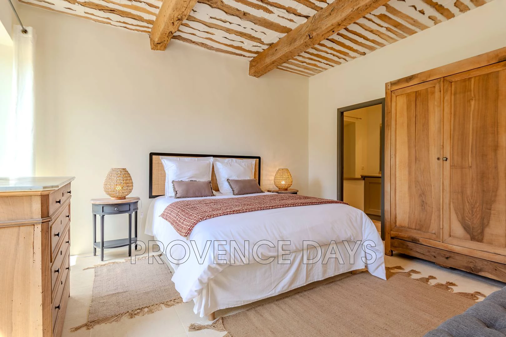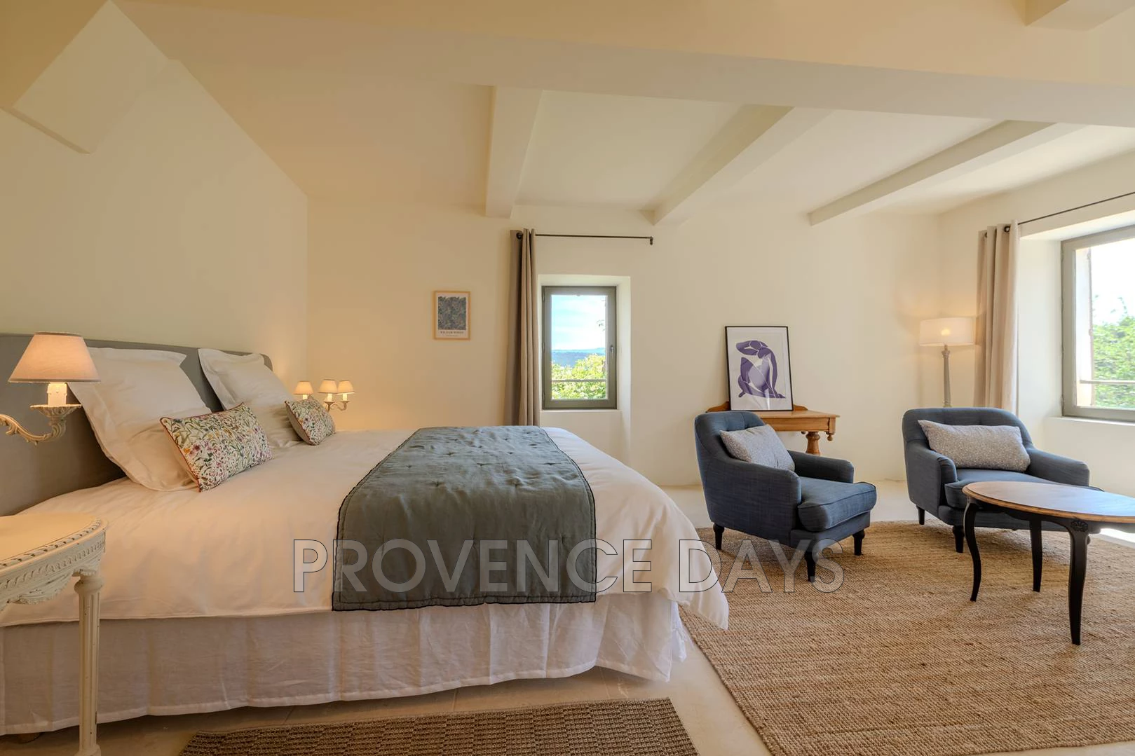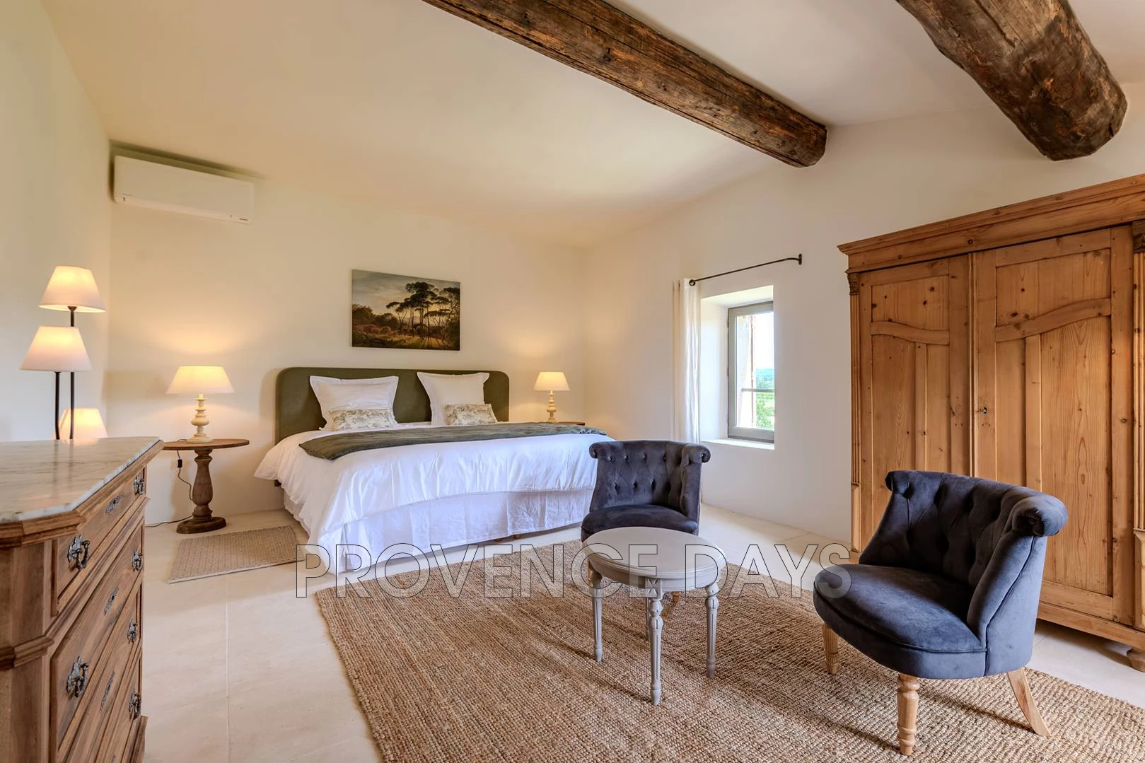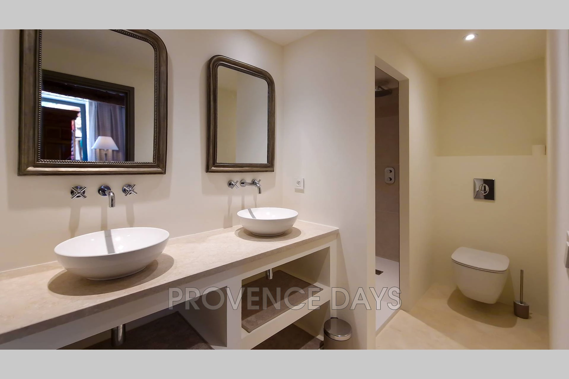 • Bedroom 1 : This room has a view of the courtyard and garden. It has a 180 cm king-sized double bed and ensuite bathroom with shower, double sinks and w.c.