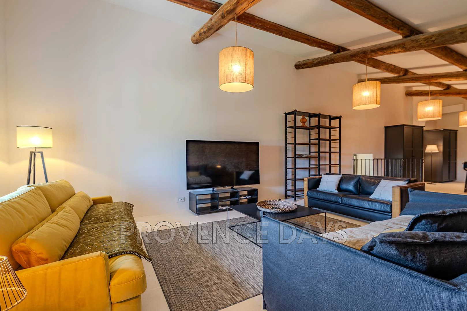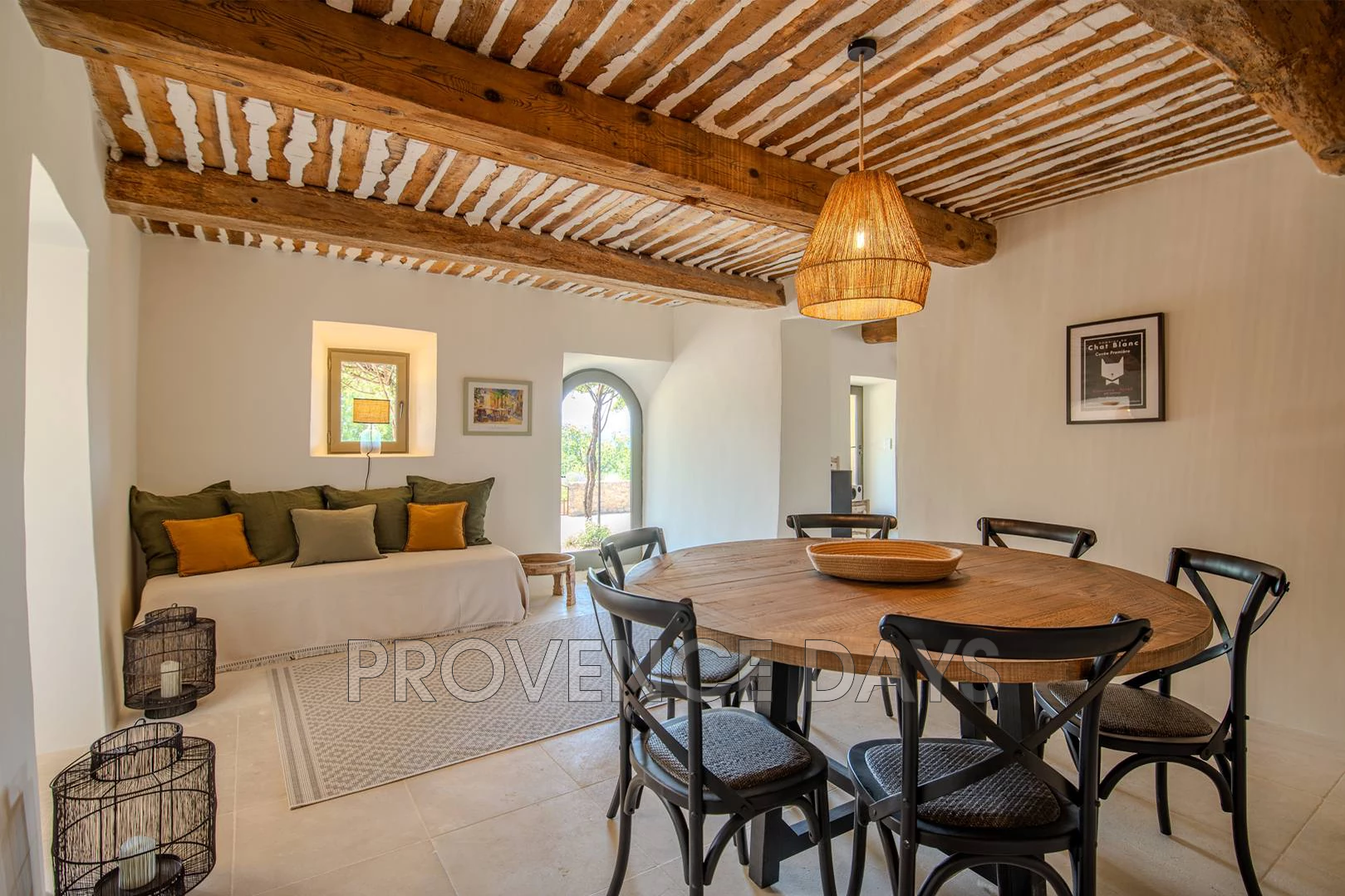The lower floor of the house is designed for entertaining, with a welcoming living room, a spacious and well-appointed kitchen, and two dining areas—one large and formal, the other more intimate for smaller gatherings. The open-plan layout, exposed beams, and tasteful interior decoration create an immediate sense of warmth and comfort.
