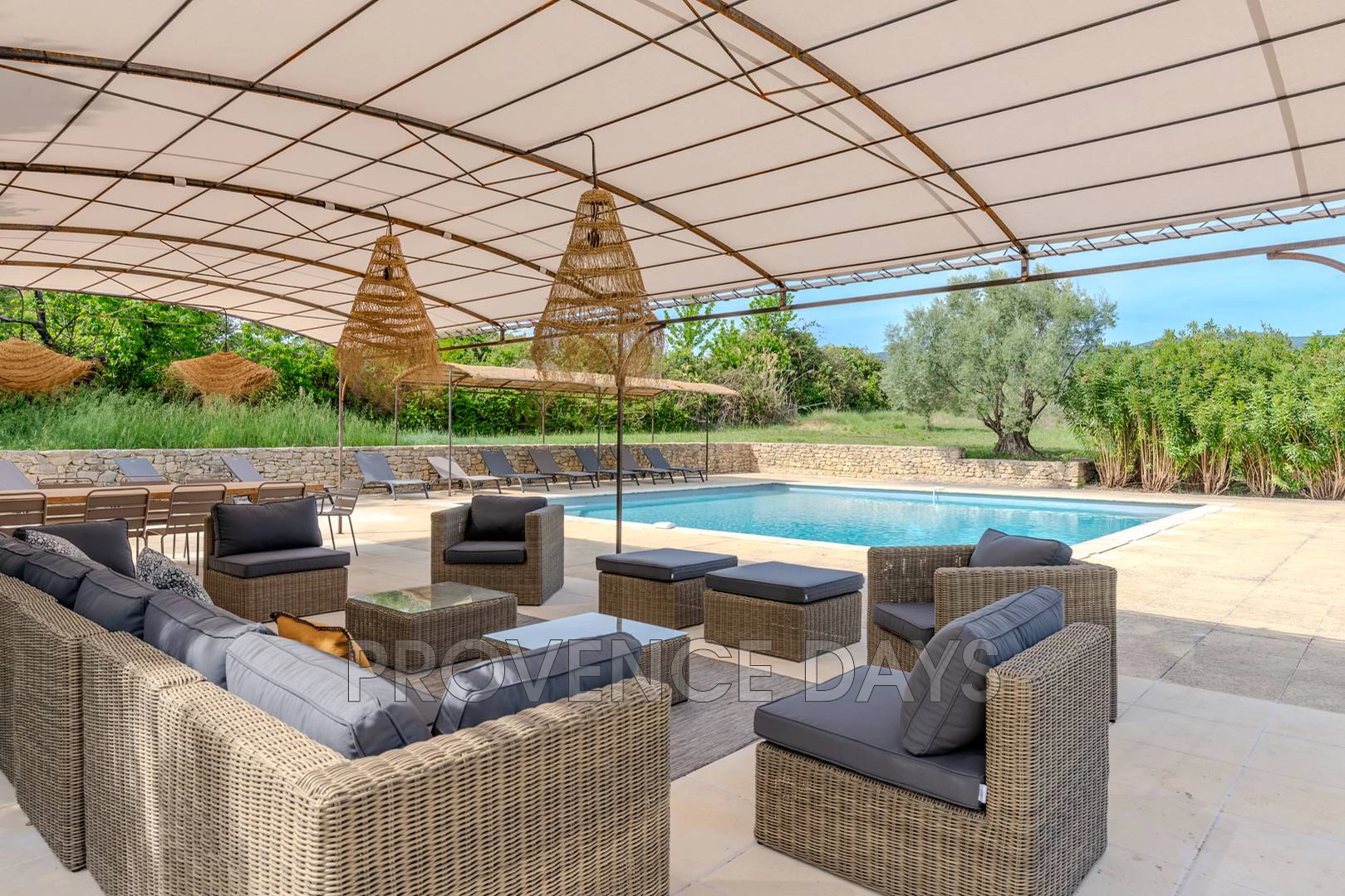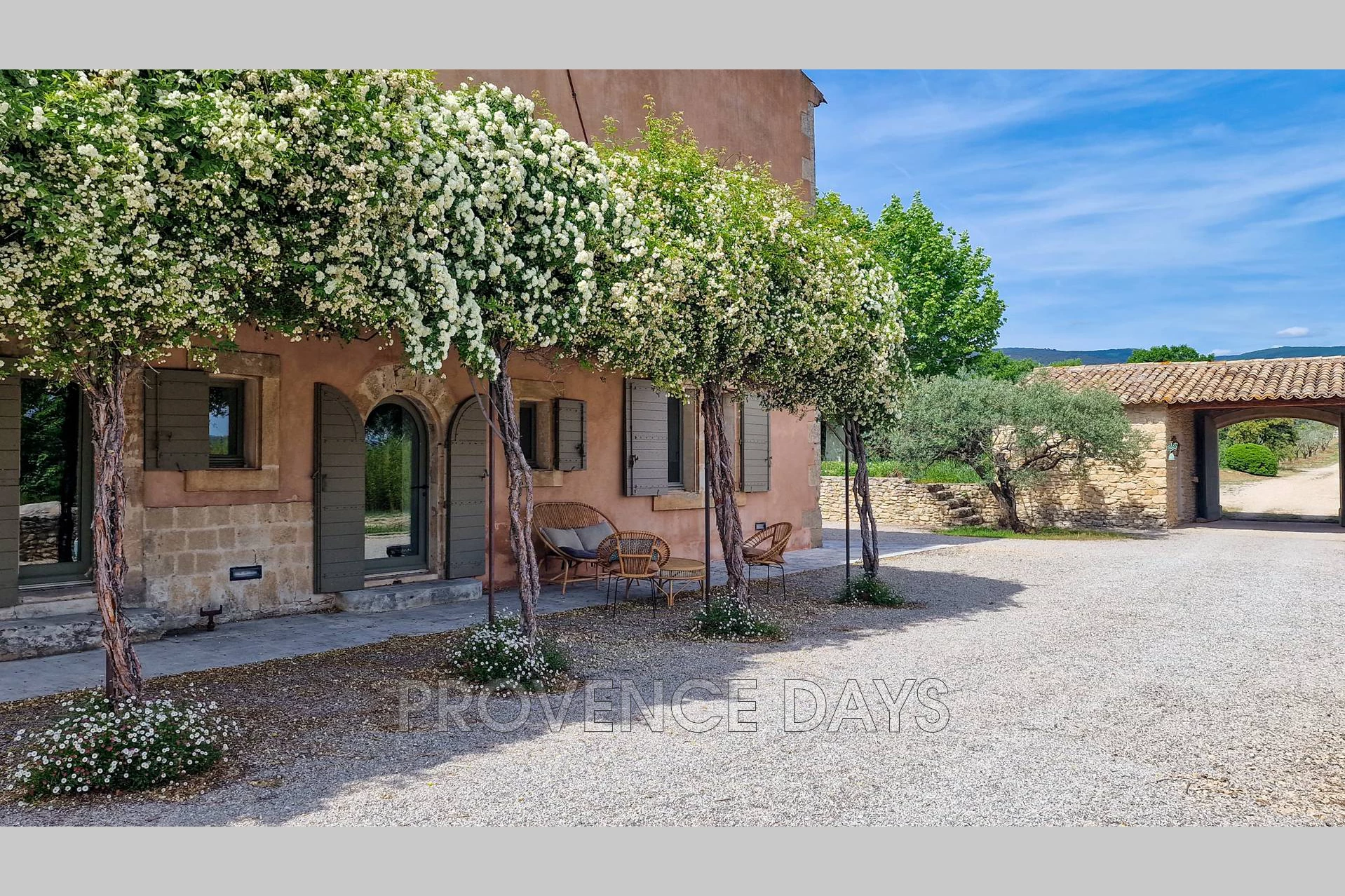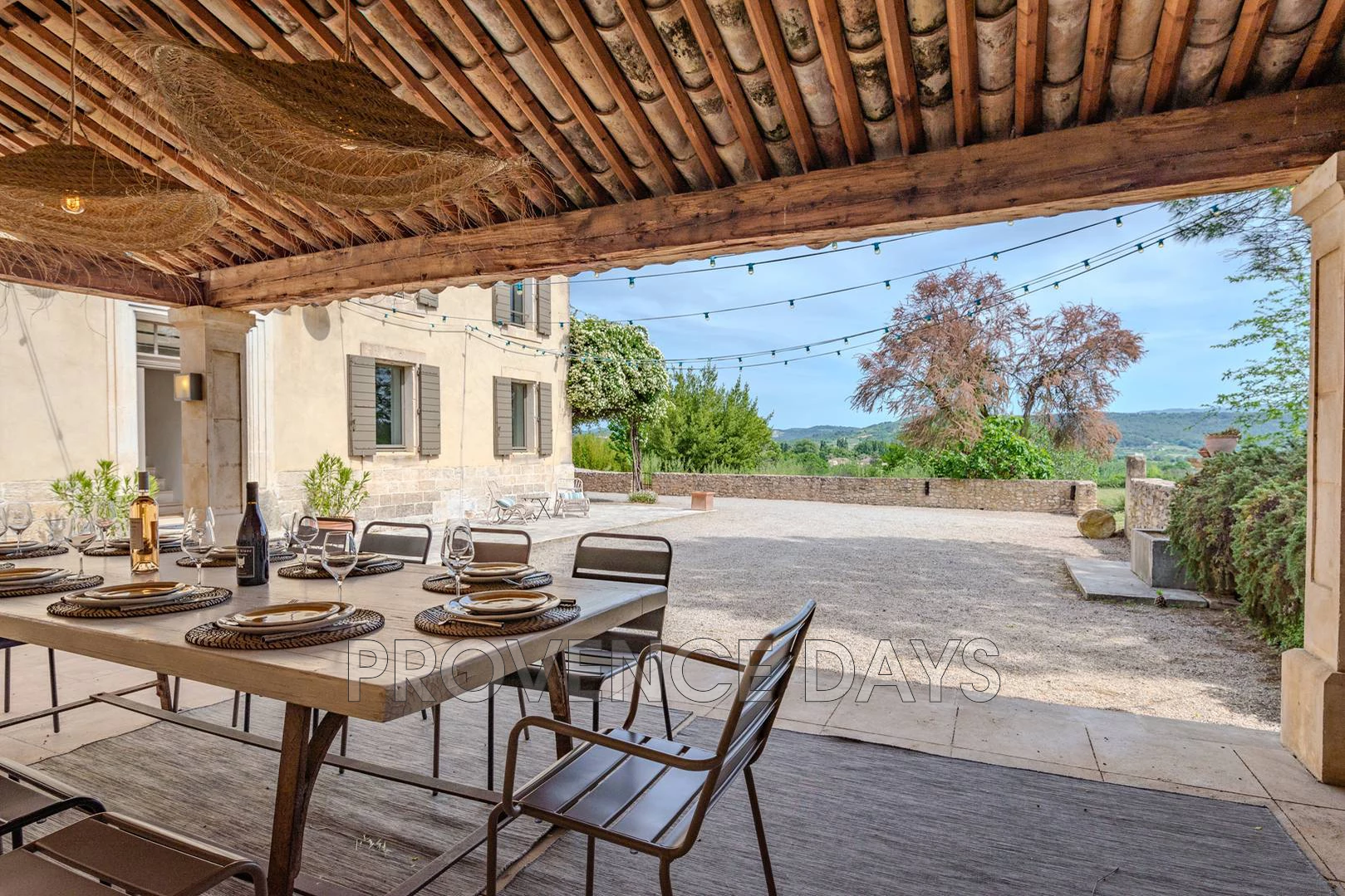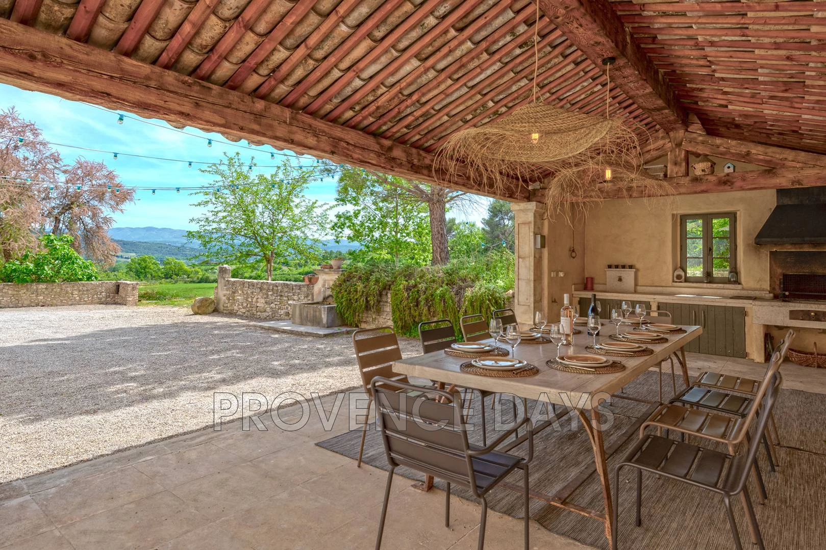 You arrive to the house down an olive tree lined driveway and pass under the archway into the inner courtyard of the Bastide, on the front side facing the valley is a shading pergola overlooking the kitchen garden and gym building. You will also find the table tennis here.
