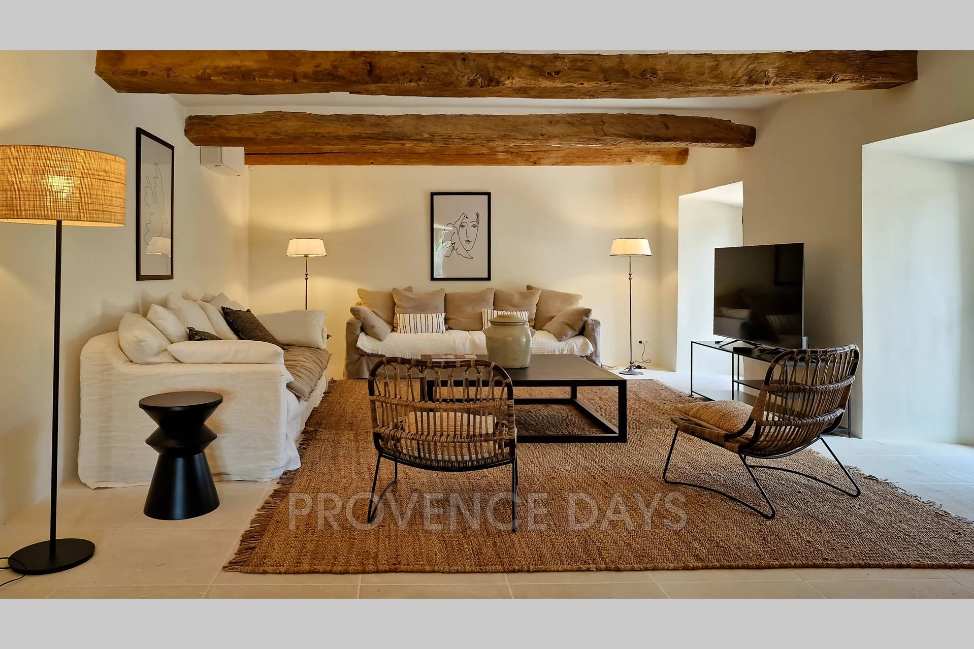• Living Room: Flooded with natural light from floor-to-ceiling windows, this cosy sitting room features two large sofas, additional chairs, and a TV.